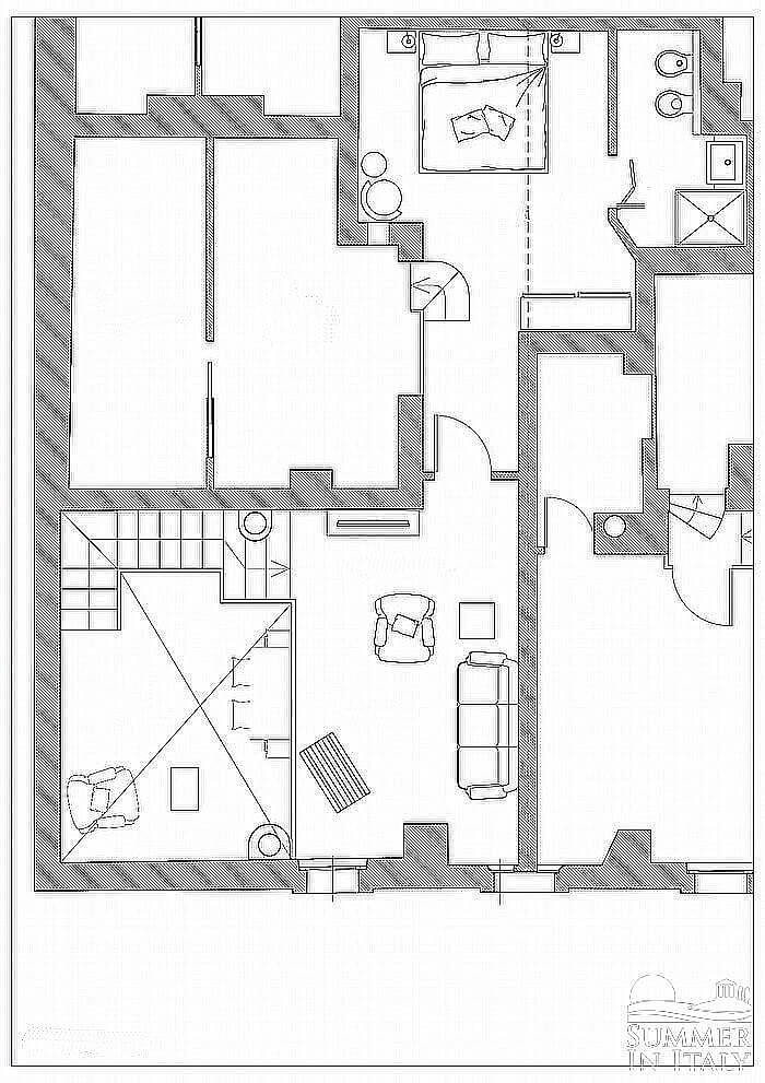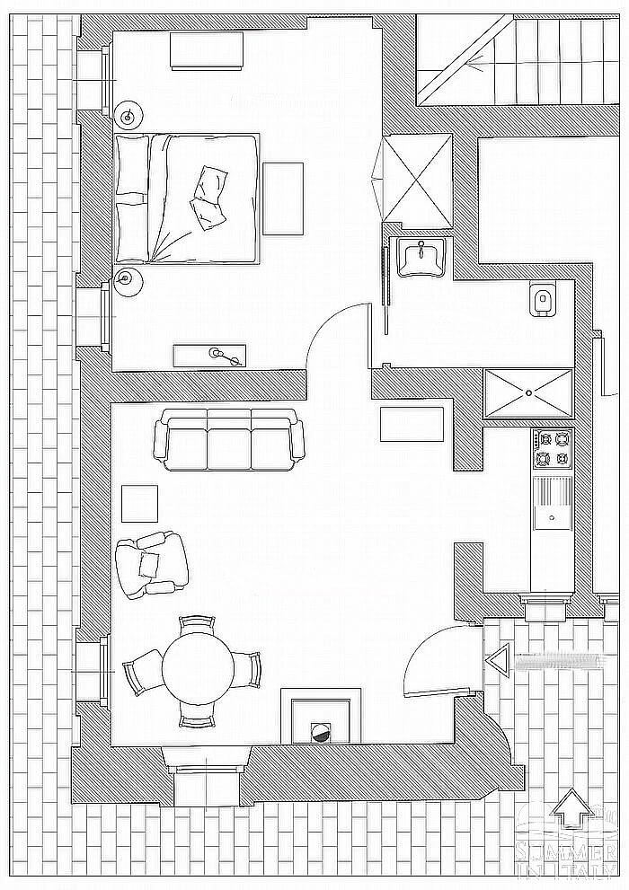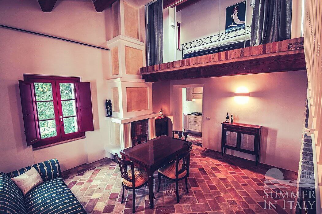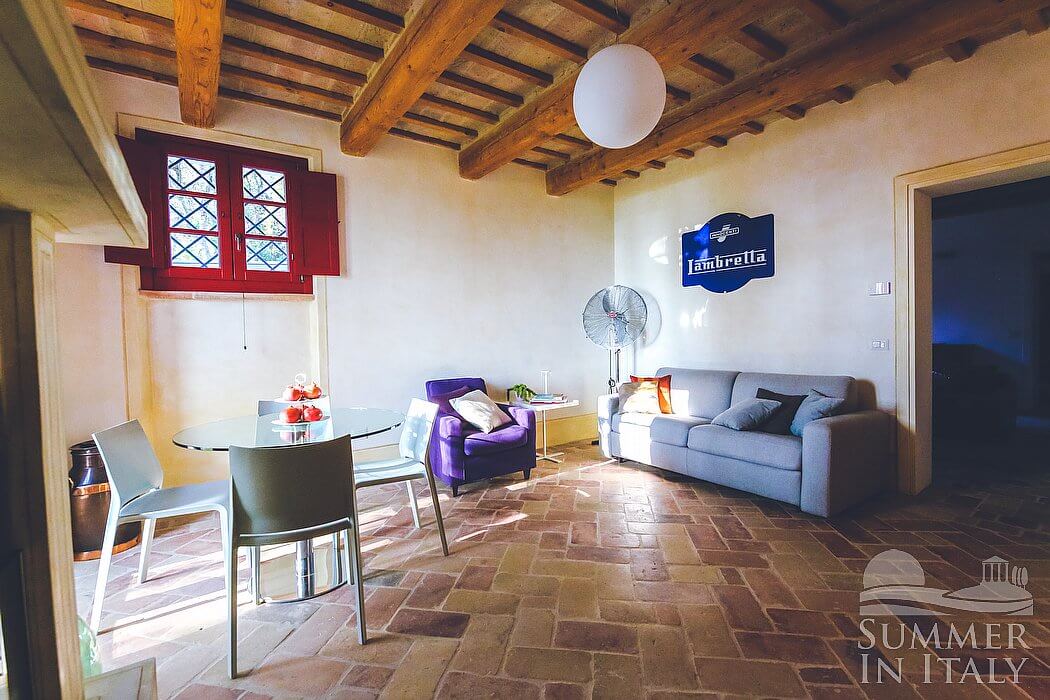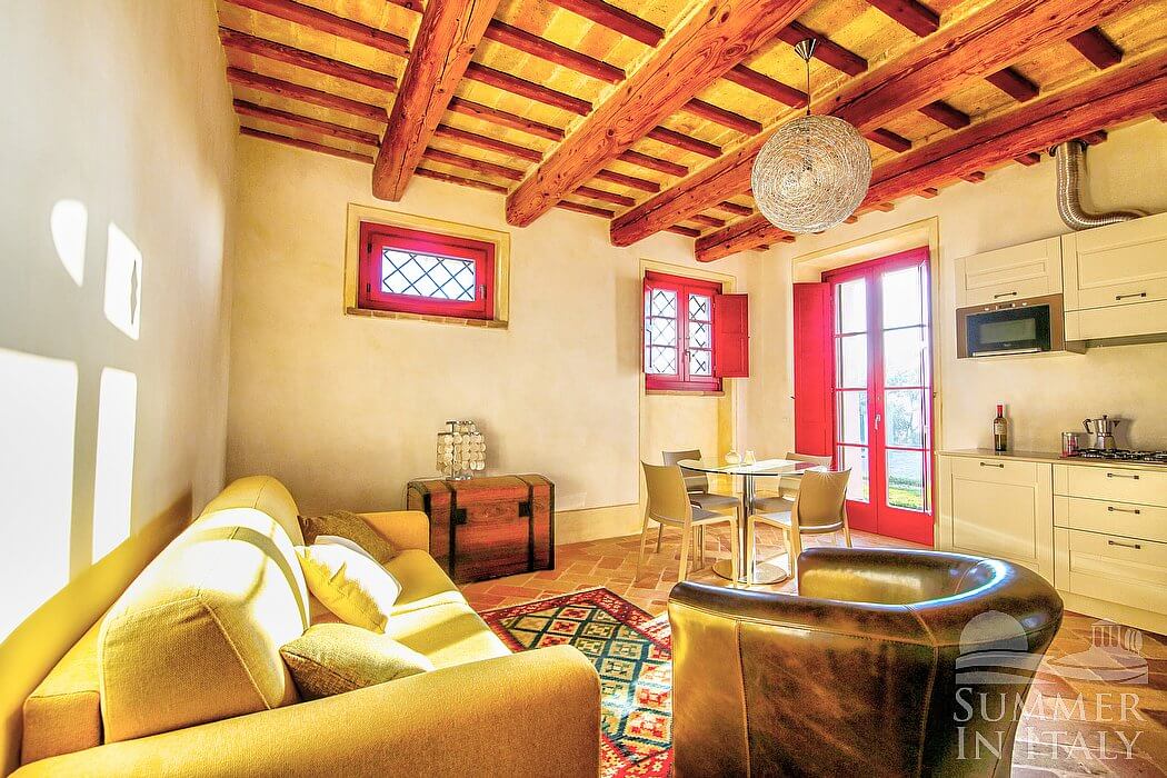 The fourth living room is paved with terracotta tiles. The ceiling has characteristic exposed wood beams and terracotta tiles. The furnishings are simple and comfortable, and include a sofa. There is a nice fireplace made of bricks. In the living room you will also find a cooking area. The kitchenette is equipped with a four-burner gas cooker, a small refrigerator without freezer, a dishwasher, a microwave oven, an Italian-style coffee-maker and a kettle. The dining table can accommodate four guests. In this room you will find a satellite smart TV. The room has two windows. It is equipped with underfloor cooling.