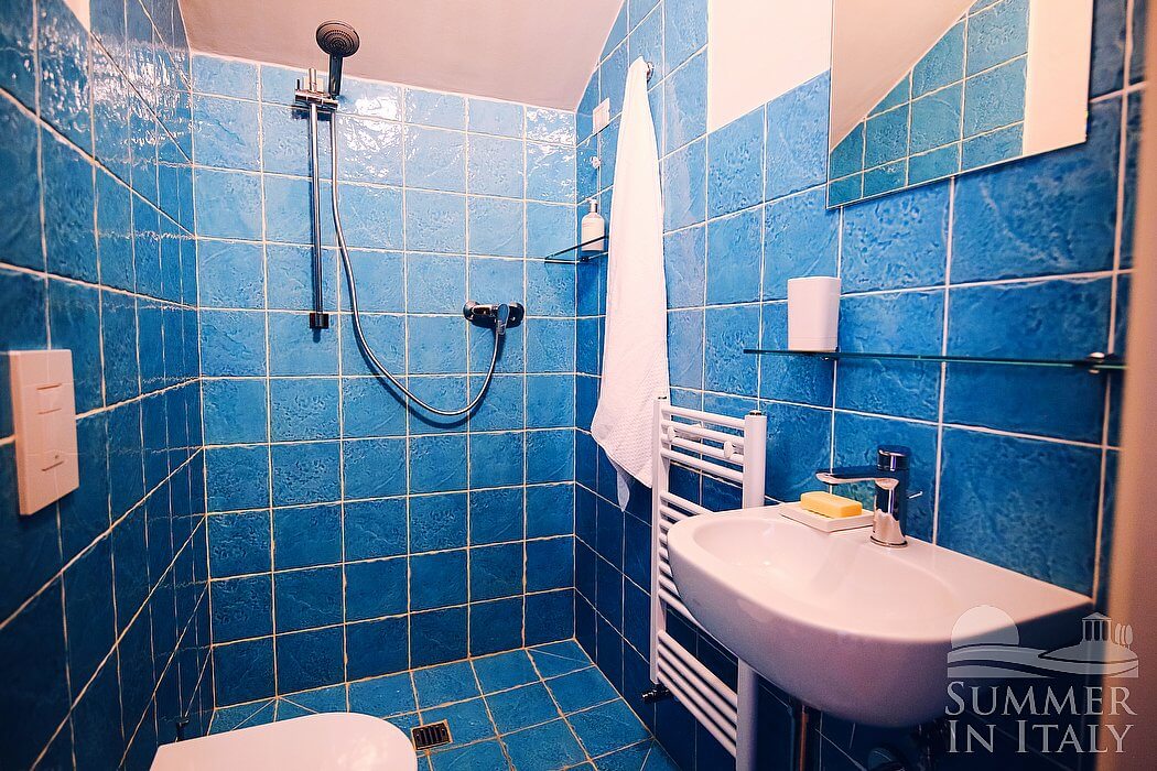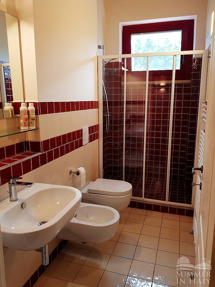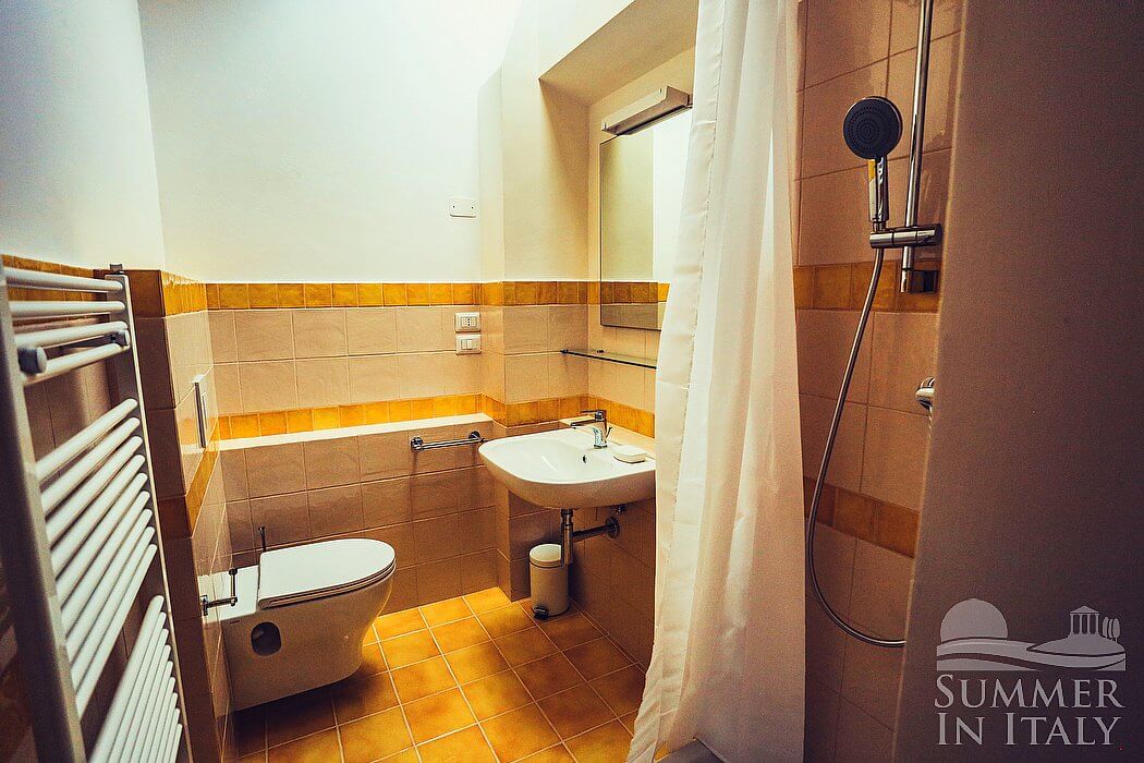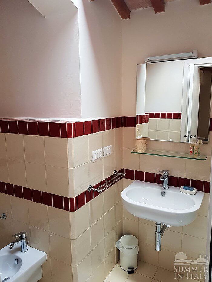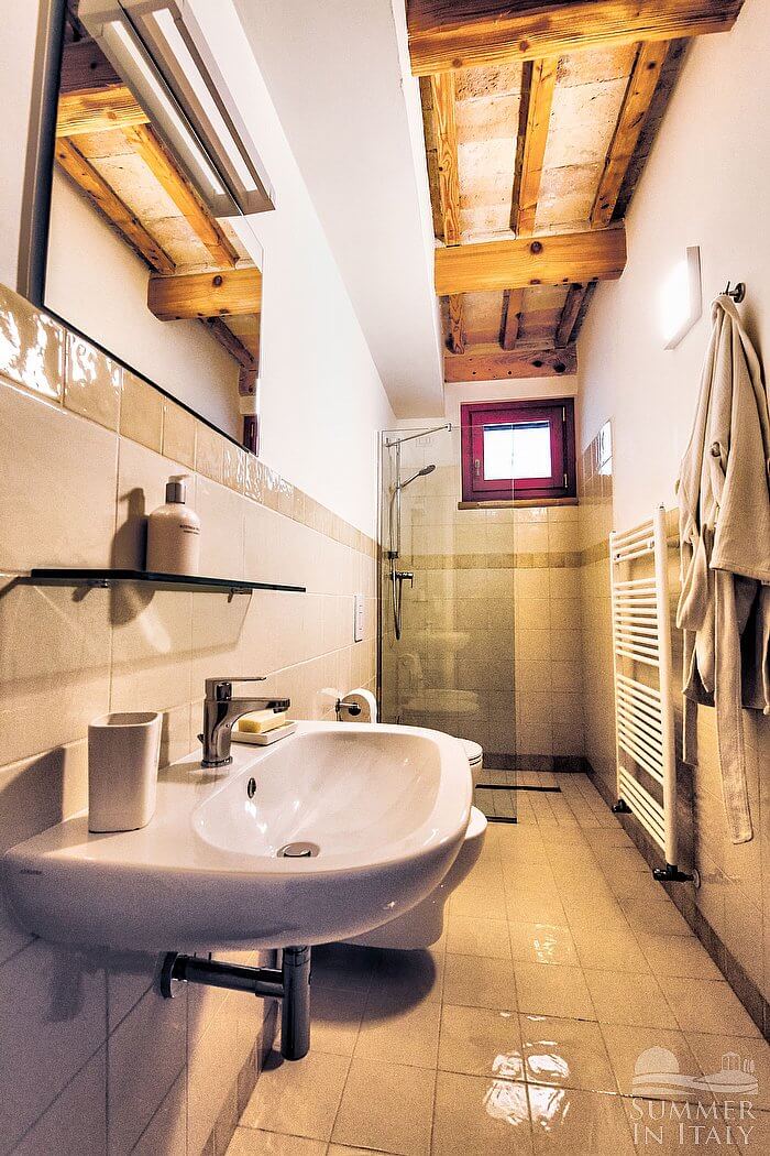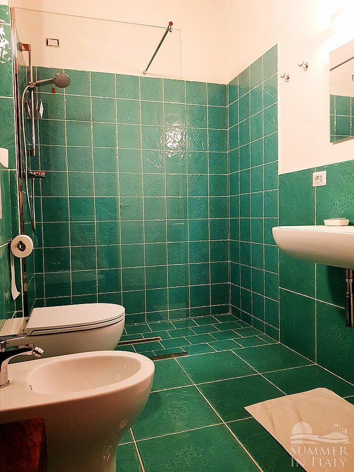 The second living room is paved with terracotta tiles. The ceiling has characteristic exposed wood beams and terracotta tiles. The furnishings are warm and welcoming, and include an armchair and a divan that unfolds into a double bed (140 cm/55 inches). In the living room you will also find a cooking area. The kitchenette is equipped with a four-burner gas cooker, a refrigerator with freezer, a dishwasher, a microwave oven, an Italian-style coffee-maker and a kettle. The dining table can accommodate four guests. In this room you will find a satellite smart TV. From the living room you will be able to enter the garden through a French door. The room has a high window, as well as a high window. It is equipped with underfloor cooling.