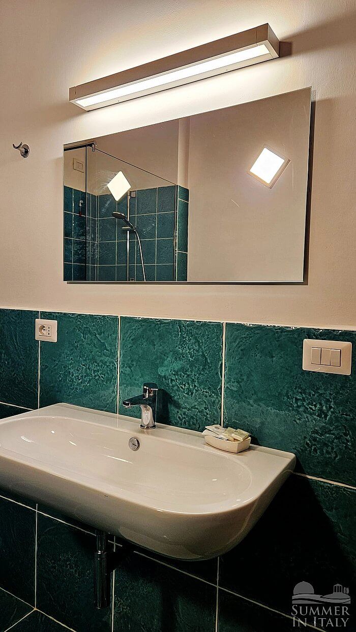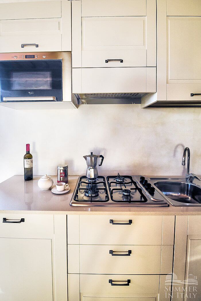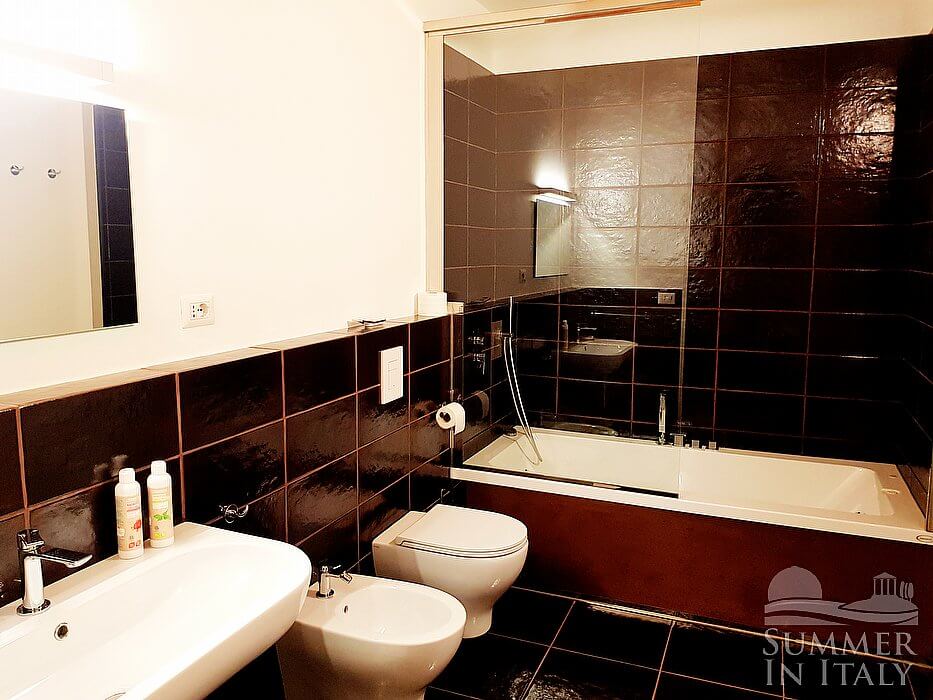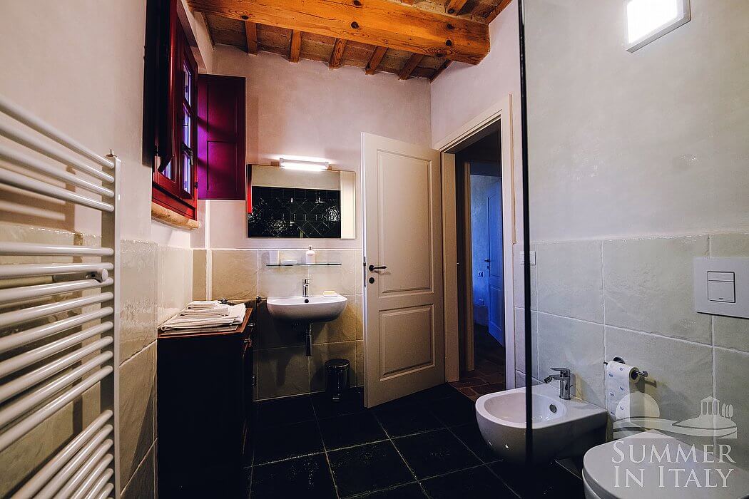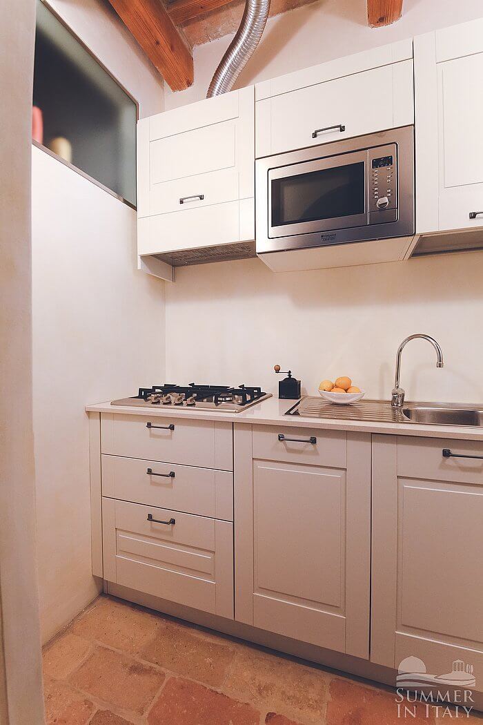 The second living room is paved with terracotta tiles. The ceiling has characteristic exposed wood beams and terracotta tiles. The furnishings are warm and welcoming, and include an armchair and a divan that unfolds into a double bed (140 cm/55 inches). In the living room you will also find a cooking area. The kitchenette is equipped with a four-burner gas cooker, a refrigerator with freezer, a dishwasher, a microwave oven, an Italian-style coffee-maker and a kettle. The dining table can accommodate four guests. In this room you will find a satellite smart TV. From the living room you will be able to enter the garden through a French door. The room has a high window, as well as a high window. It is equipped with underfloor cooling.