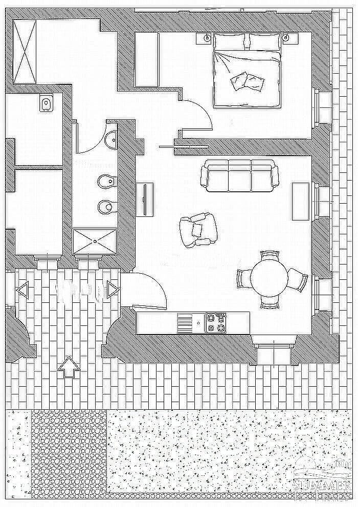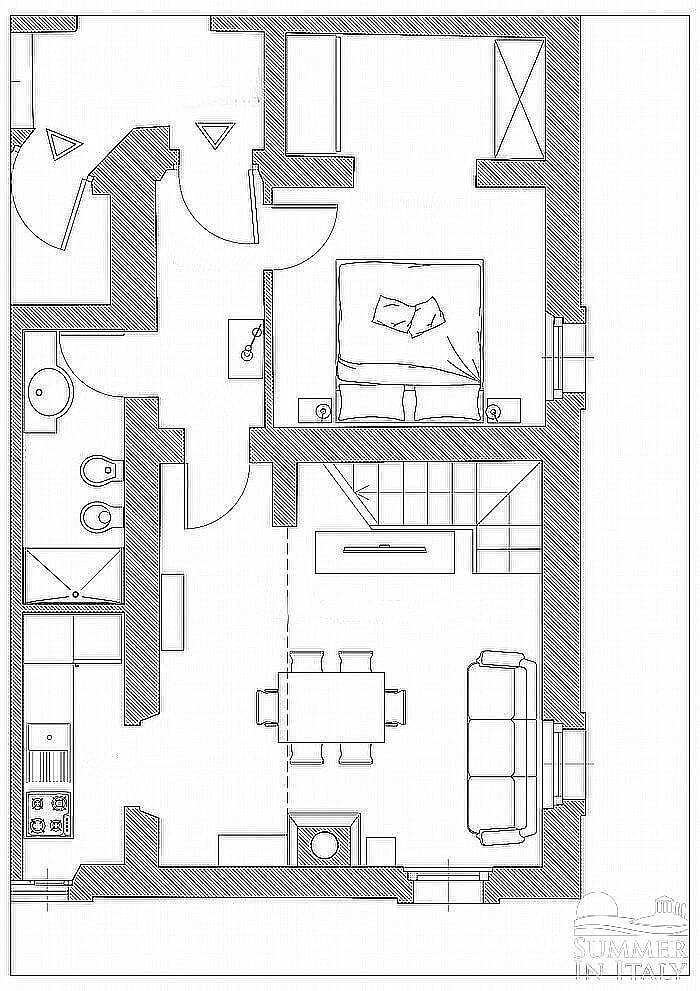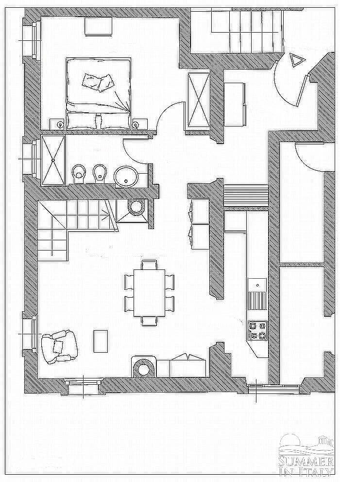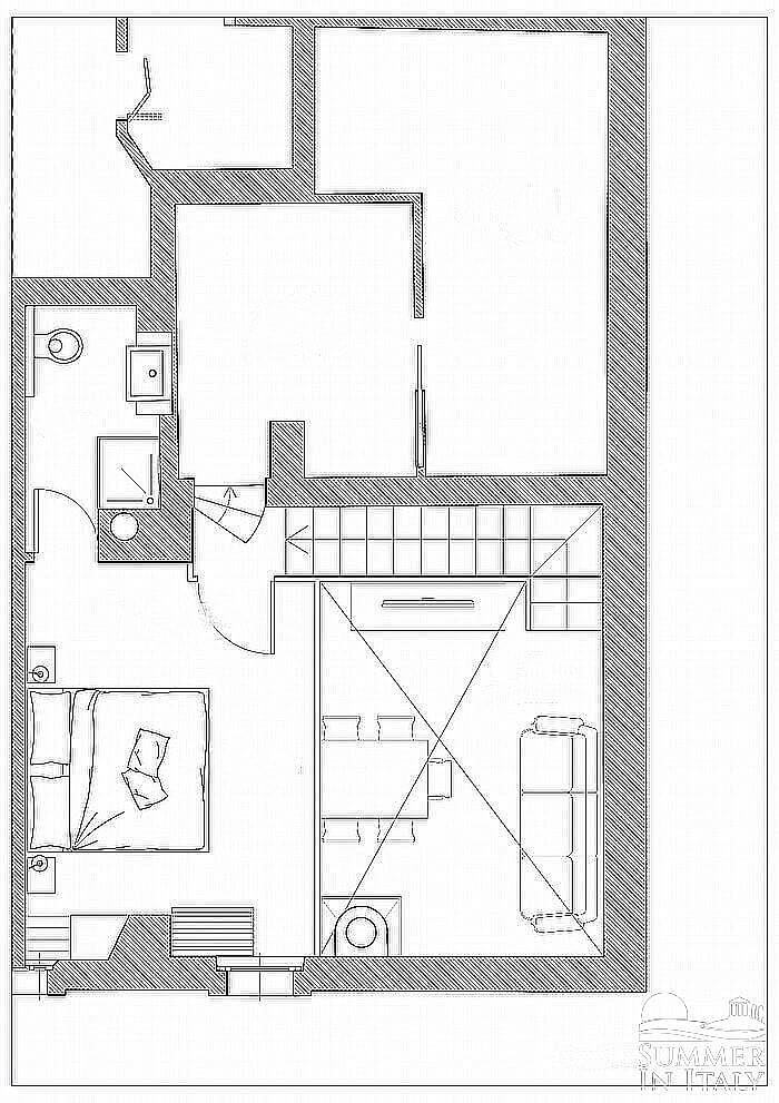 In the third kitchen you will find an open mezzanine level, without door. The mezzanine is paved with wood. The furnishings of the mezzanine include a sofa. The ceiling is sloped, has characteristic exposed wood beams and terracotta tiles and has an height of 1.20 meters (3.9 feet) at its lowest point. In this room you will find a satellite smart TV and it has underfloor cooling.
