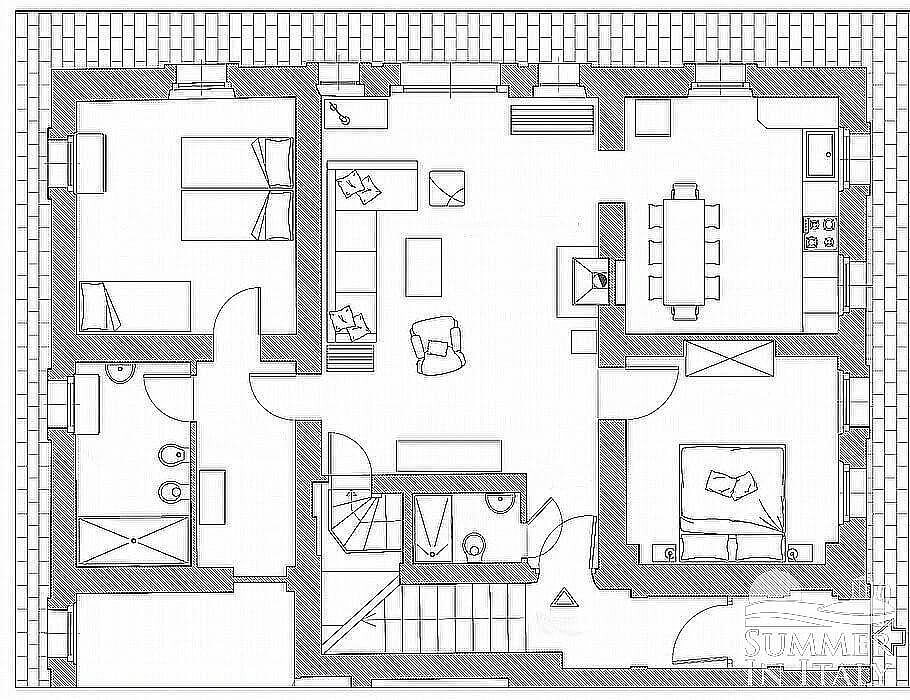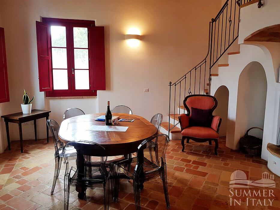 The third living room is paved with terracotta tiles. The ceiling has characteristic exposed wood beams and terracotta tiles. The furnishings are warm and welcoming, and include a sofa and an armchair. In this room you will find a satellite smart TV. From the living room you will be able to enter the garden through a French door. The room has two porthole windows. It is equipped with underfloor cooling.