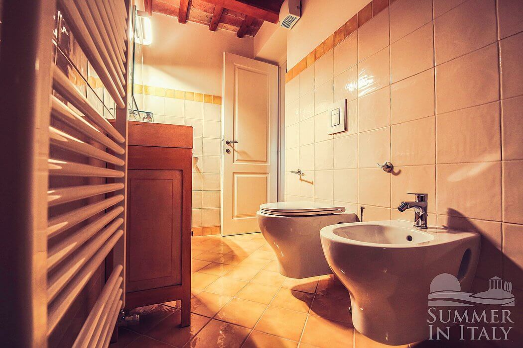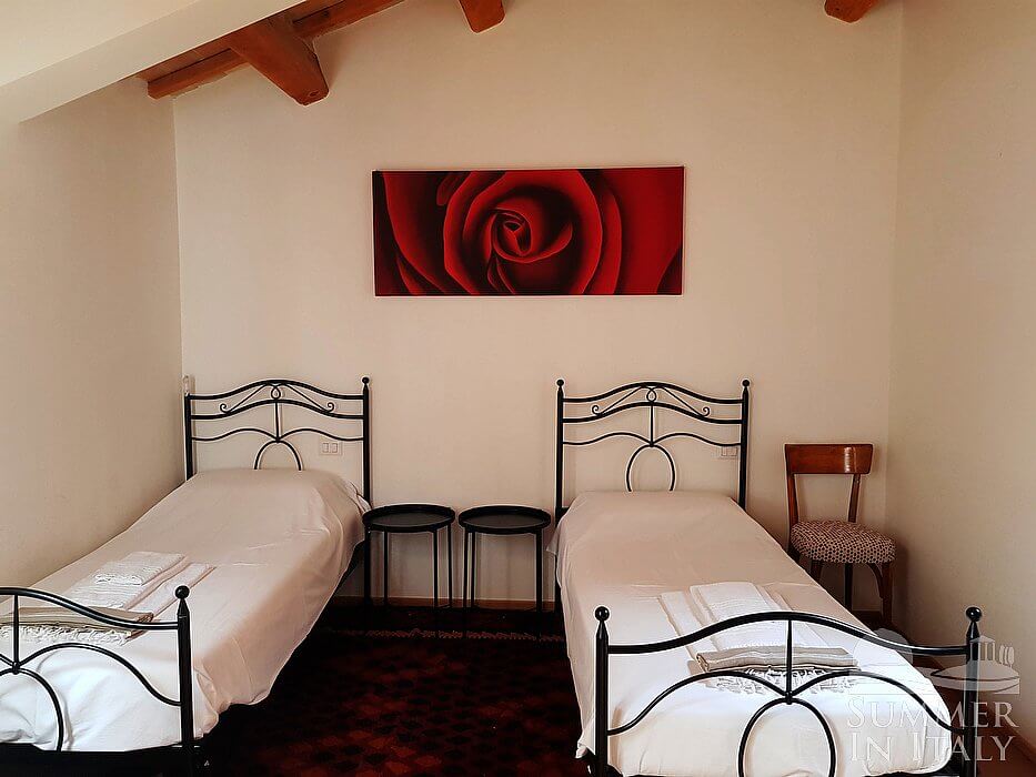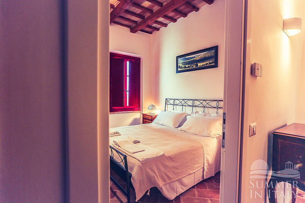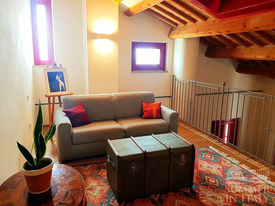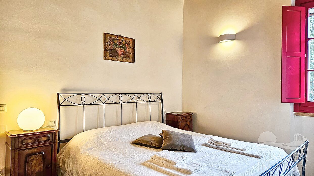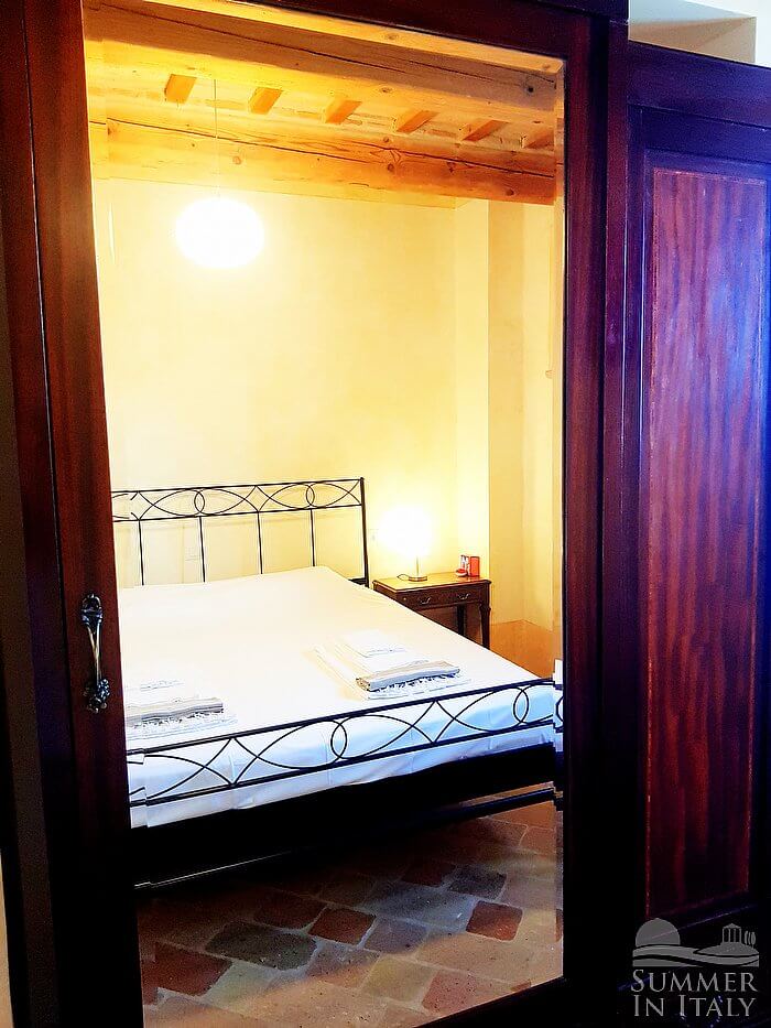 The first living room is paved with terracotta tiles. The ceiling has characteristic exposed wood beams and terracotta tiles. The furnishings are warm and welcoming, and include an armchair and a divan that unfolds into a double bed (140 cm/55 inches). There is a nice fireplace. In the living room you will also find a cooking area. The kitchenette is equipped with a four-burner gas cooker, a small refrigerator without freezer, a dishwasher, a microwave oven, an Italian-style coffee-maker and a kettle. The dining table can accommodate four guests. In this room you will find a satellite smart TV. From the living room you will be able to enter the garden through a French door. The room also has a window, as well as a small high window. It is equipped with underfloor cooling.