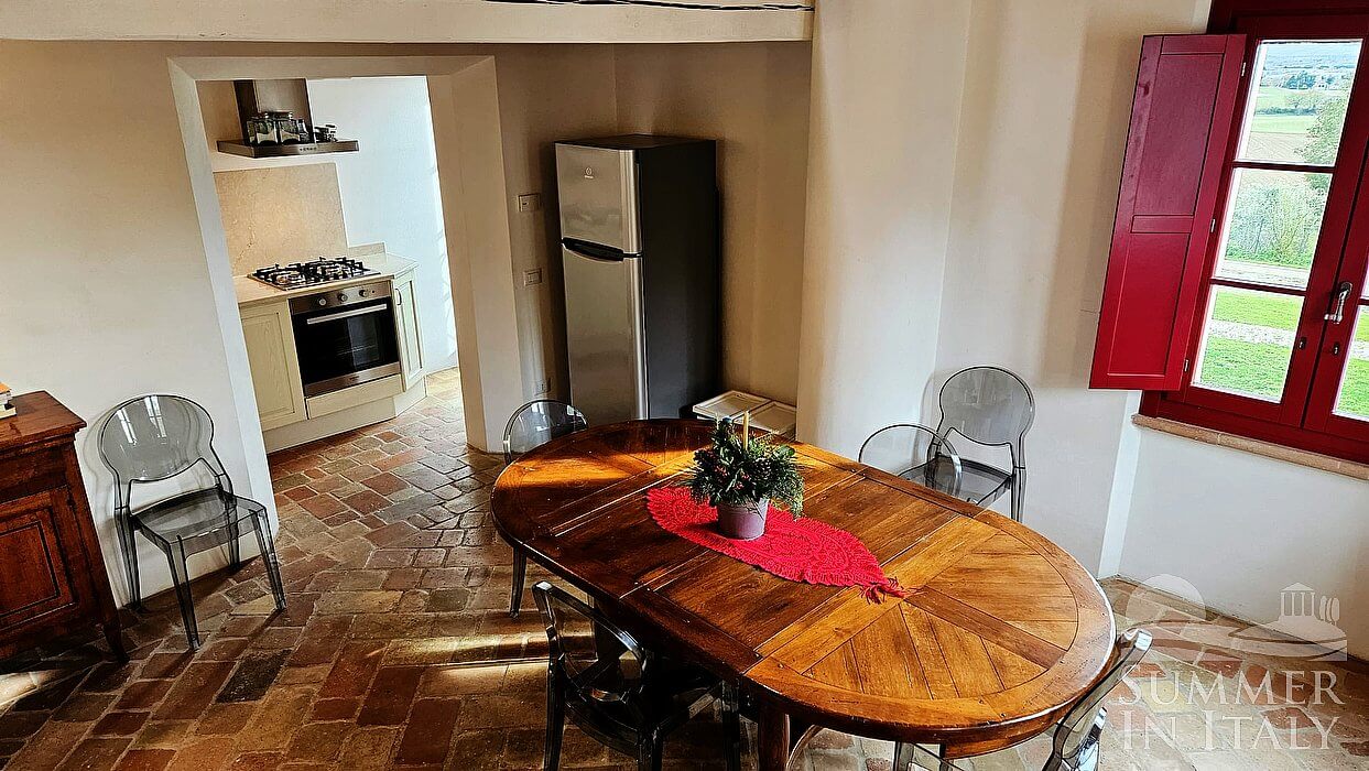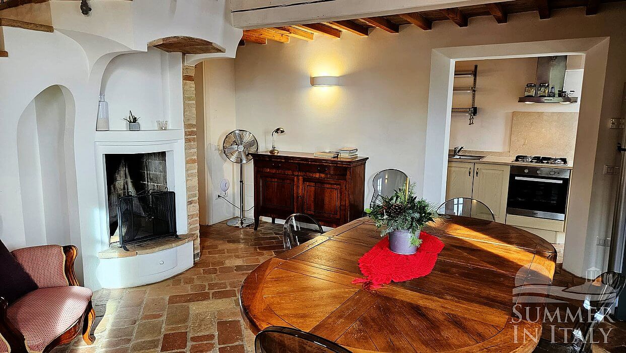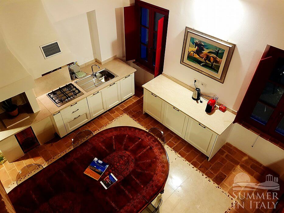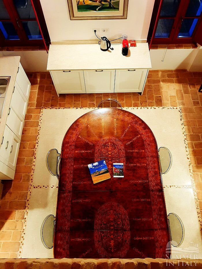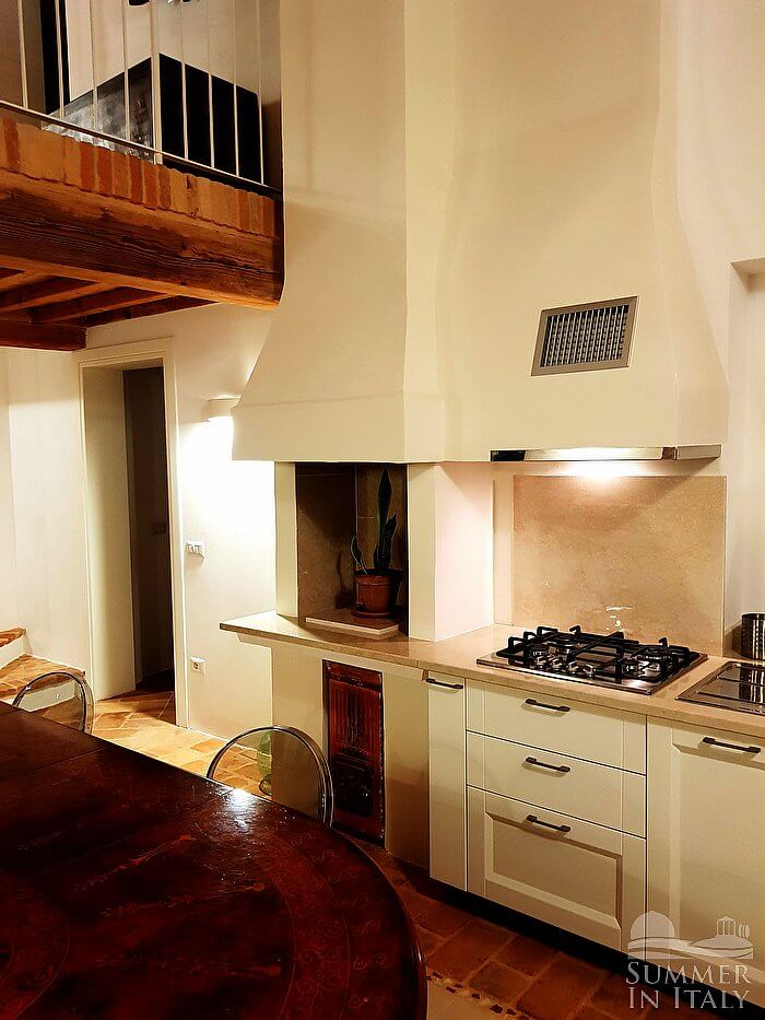 The second kitchen is paved with terracotta tiles. The ceiling has characteristic exposed wood beams and terracotta tiles. The furnishings are warm and welcoming. It is equipped with a four-burner gas cooker, an electric oven, a refrigerator with freezer, a dishwasher, an Italian-style coffee-maker and a kettle. There is a nice fireplace. The dining table can accommodate six guests. The furnishings of the kitchen include an armchair. The kitchen has two windows, and is equipped with underfloor cooling.