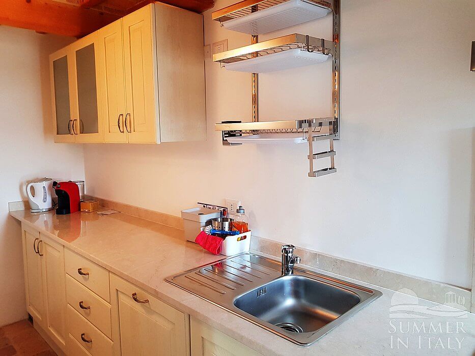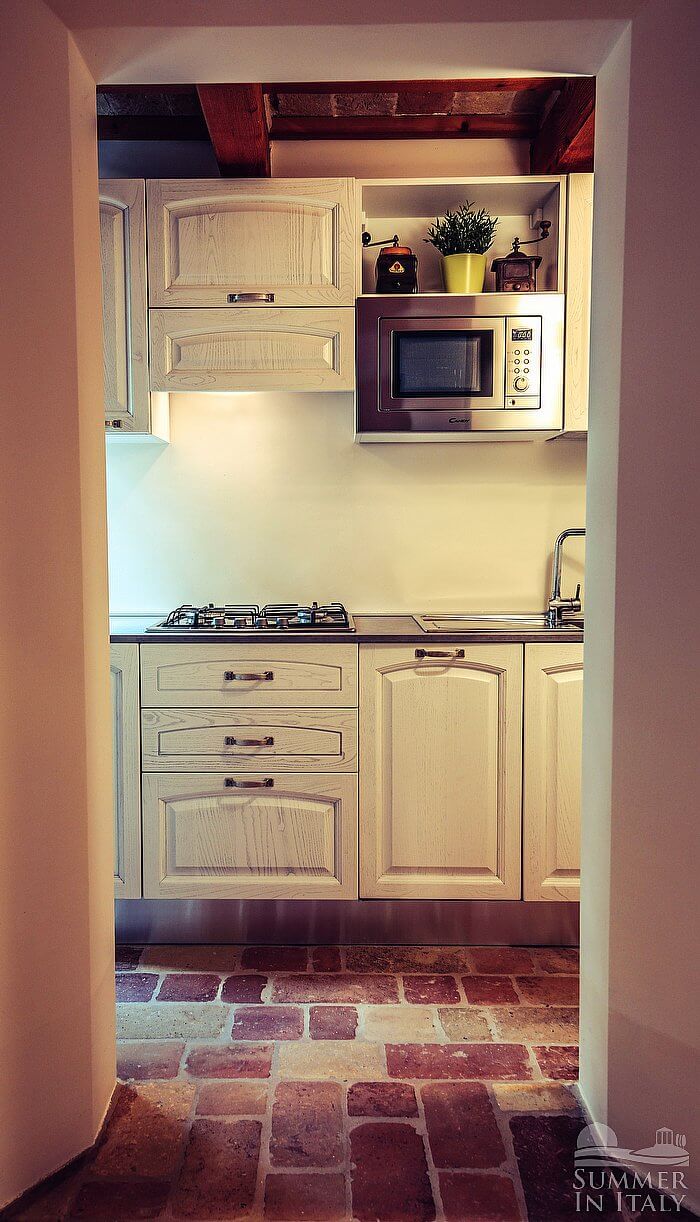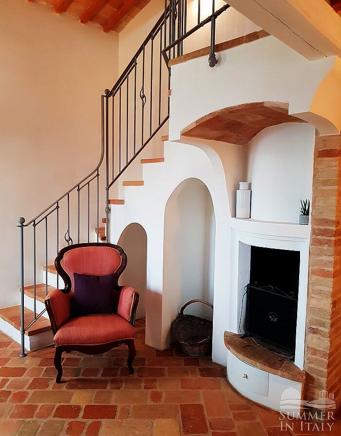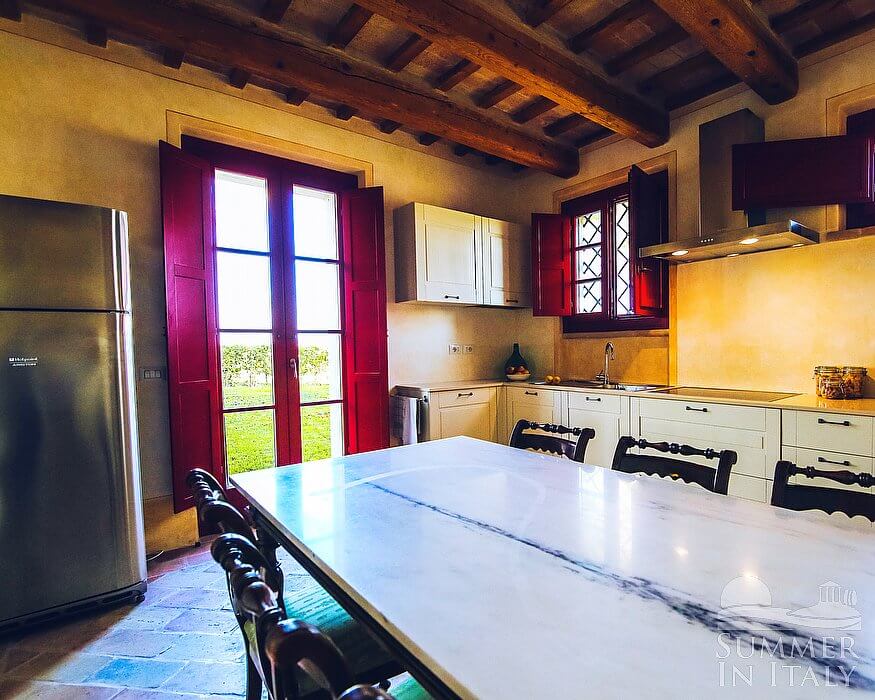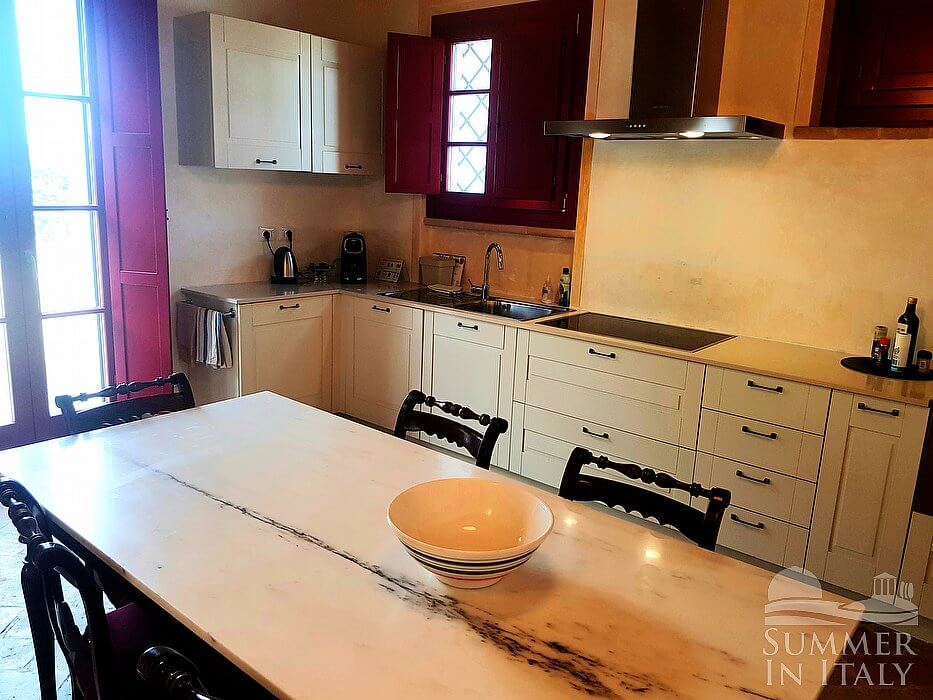 The second kitchen is paved with terracotta tiles. The ceiling has characteristic exposed wood beams and terracotta tiles. The furnishings are warm and welcoming. It is equipped with a four-burner gas cooker, an electric oven, a refrigerator with freezer, a dishwasher, an Italian-style coffee-maker and a kettle. There is a nice fireplace. The dining table can accommodate six guests. The furnishings of the kitchen include an armchair. The kitchen has two windows, and is equipped with underfloor cooling.