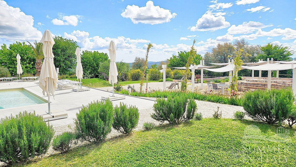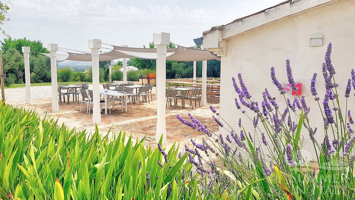 The patio is 200 square meters (2150 square feet) large. It is partly shaded by a pergola. It is equipped with tables and chairs. Here you will also find a portable barbecue, as well as a bathroom which is equipped with a washbasin and a toilet. From the patio you will enjoy a view of the greenery and of the surrounding hills.