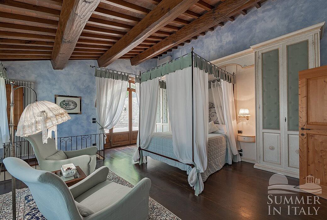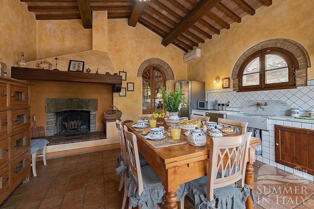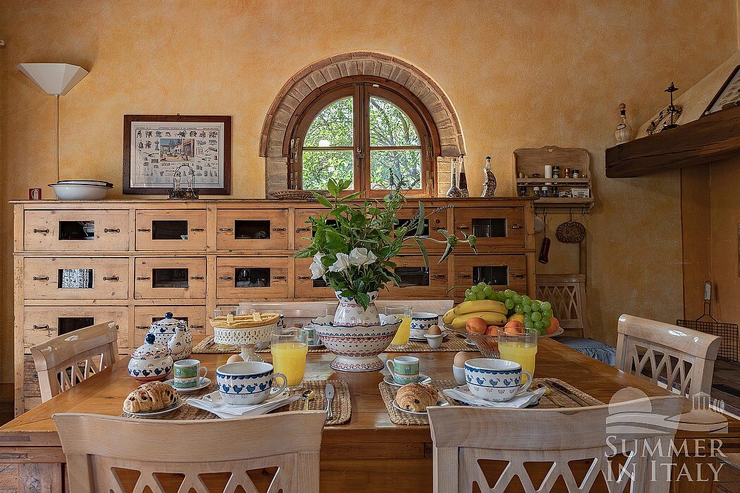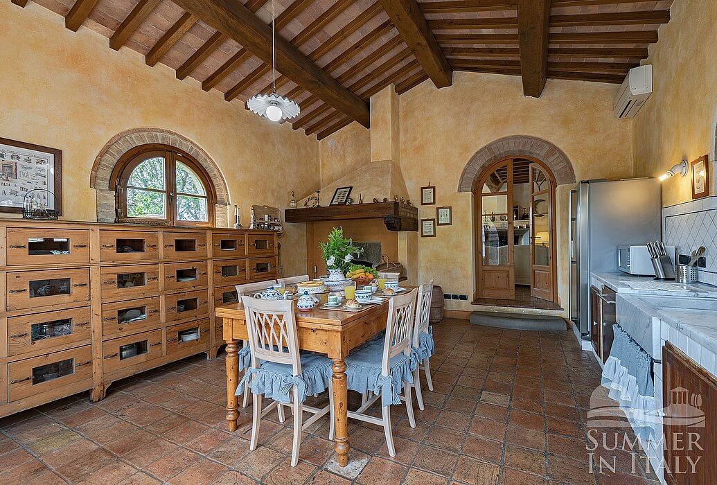 You will be able to enter the kitchen from the living room going down two steps. It is professional-grade, equipped with a five-burner gas cooker, an electric oven, an American-style refrigerator with ice-maker, a dishwasher, a microwave oven, an Italian-style coffee-maker, an American-style coffee-maker (bring your filters!) and other small appliances. There is a big fireplace. The dining table can accommodate eight guests. From the kitchen a French door will take you to the patio. The room has two arched windows. The kitchen is equipped with an air conditioning/heating unit.