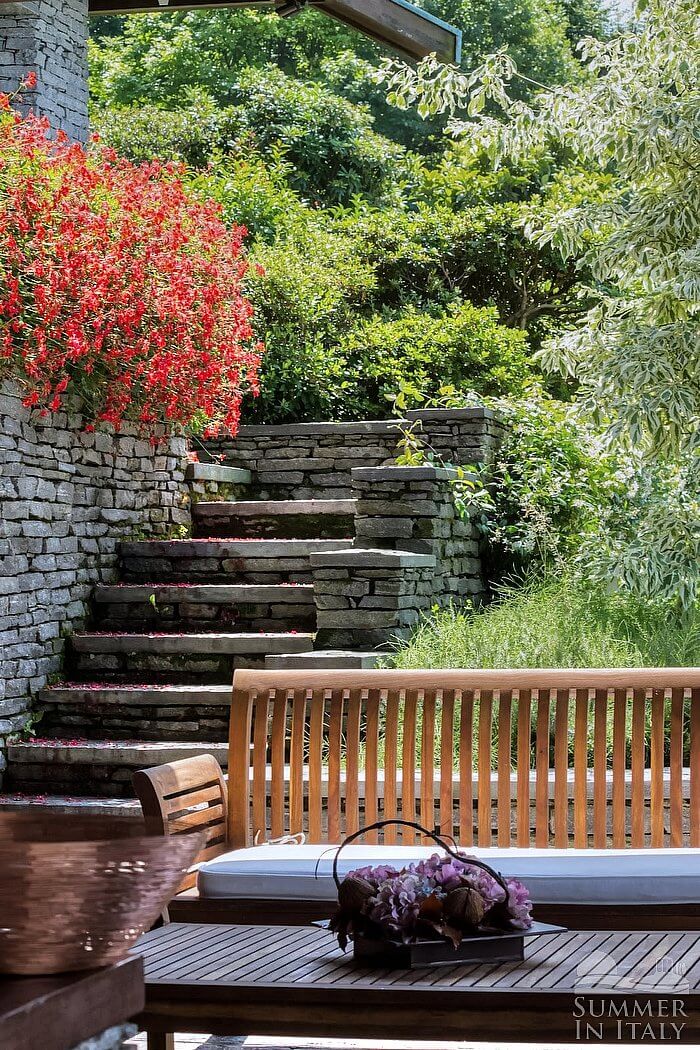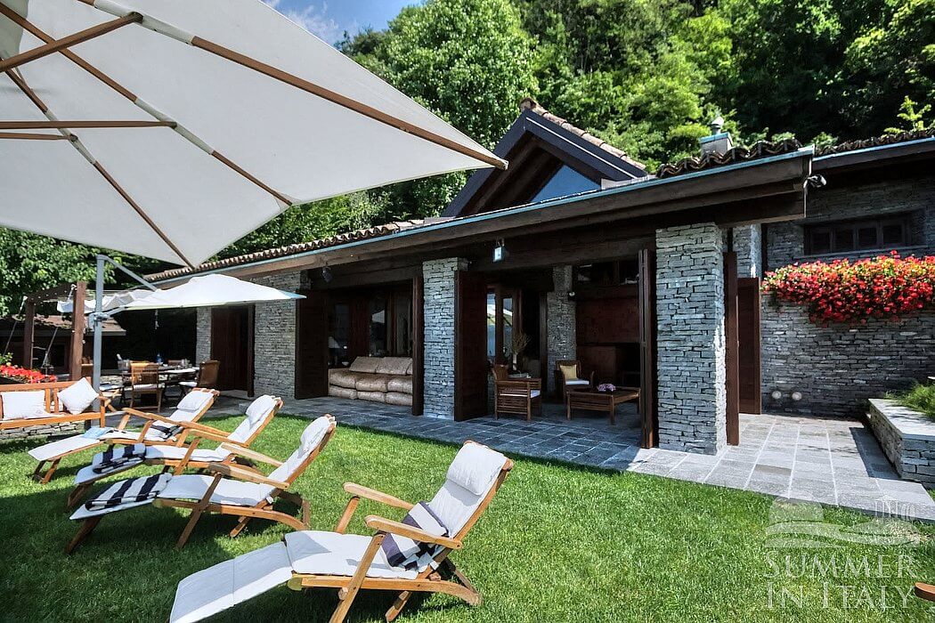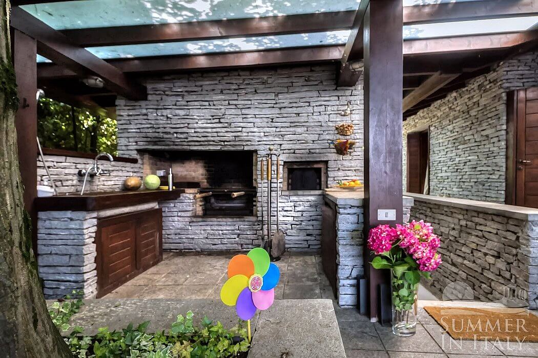 The patio is 200 square meters (2150 square feet) large. It is partly shaded by a roof and by an awning. It is equipped with wood benches and with a table, chairs and a sun umbrella. Here you will also find a brickwork barbecue and a small wood-fired pizza oven. From the patio you will enjoy a spectacular view of the lake Maggiore and of the mountains.