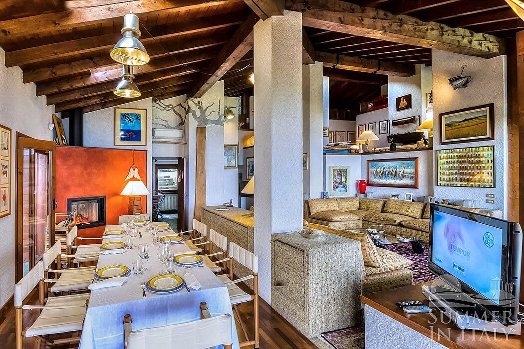 The living room is paved with wood. The ceiling is sloped and is made of wood. The furnishings are warm and welcoming, and include three sofas and two armchairs. There is a small fireplace made of glass. The dining table can accommodate eight guests. In this room you will find a television (local channels). From the living room you will be able to enter the patio and the garden through four French doors. The room also has two windows, as well as two roof windows. It is equipped with an air conditioning/heating unit.
