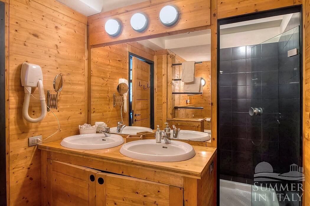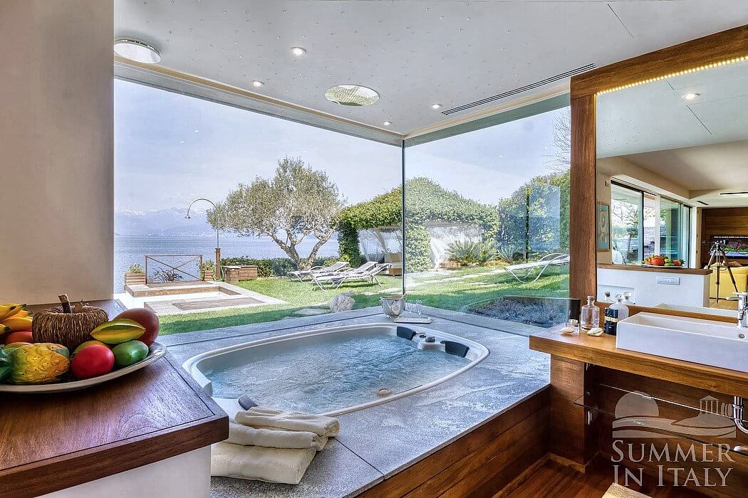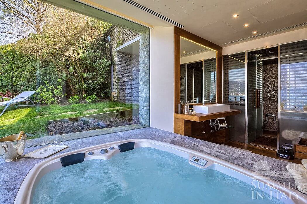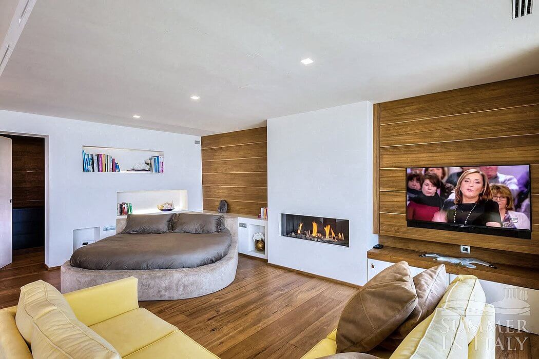 This suite is made up by three interconnected rooms: a sleeping area, a sitting area and a bathroom. You will be able to enter the third bedroom from the corridor going down five steps. The floor is paved with wood. The room has a round matrimonial bed. There is a practical fireplace made of glass. The furnishings include a L-shaped sofa and a desk. There is also a cooking area. The kitchenette is equipped with a two-burner induction cooker, a small refrigerator without freezer and a kettle. In this room you will find a satellite smart TV, and you will also find a Turkish bath. From the bedroom you will be able to enter the swimming pool through two French doors. The room also has two glass walls, and it's equipped with an air conditioning/heating unit. This bedroom has an en-suite bathroom, equipped with a washbasin, a toilet, a jacuzzi bathtub and a hairdryer. The bathroom is open-plan.