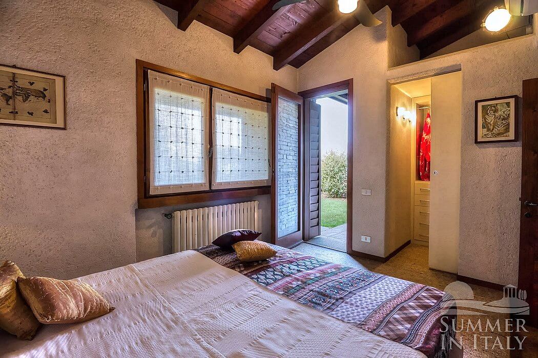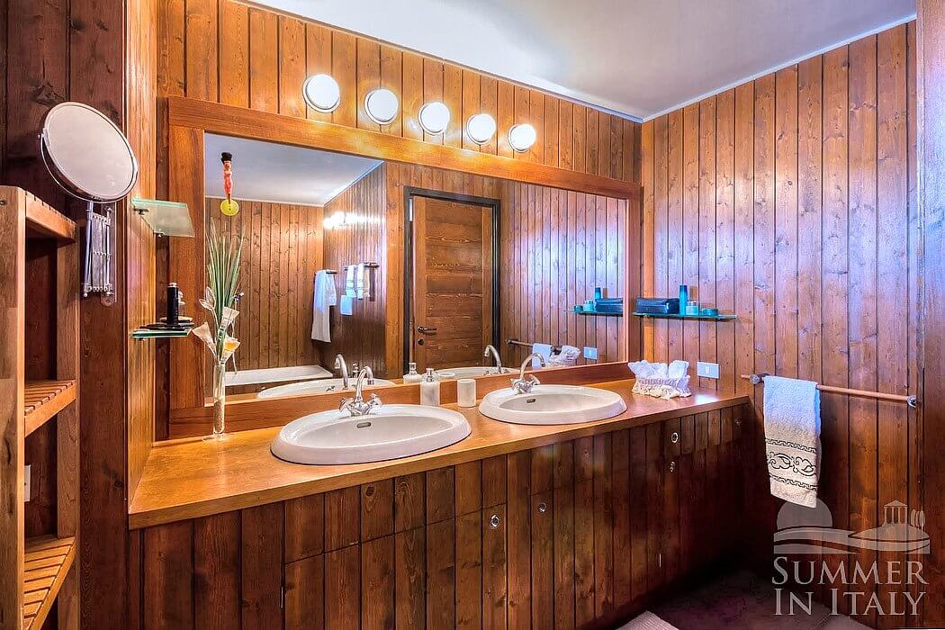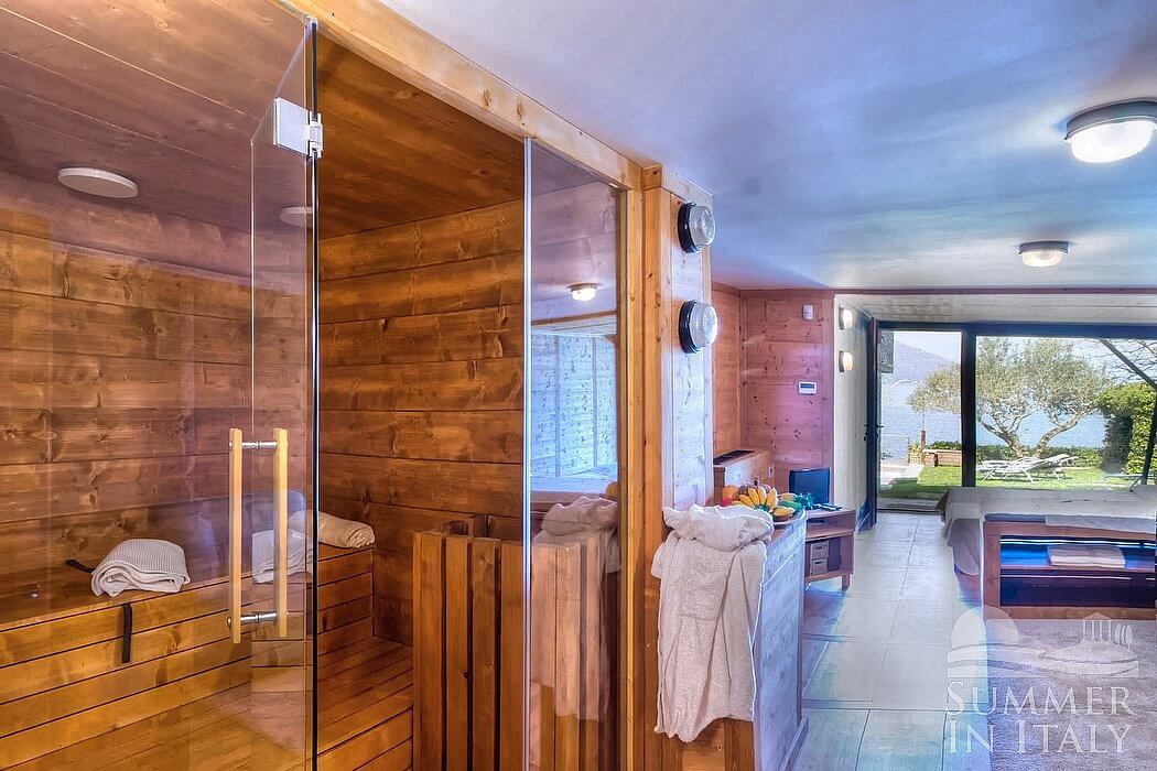 You will be able to enter the fourth bedroom through a corridor. The floor is paved with wood. The room has a matrimonial bed (160 cm/63 inches, wider than a queen-size bed). In this room you will find a television (local channels), and you will also find a sauna. From the bedroom you will be able to enter the swimming pool through a French door. The room also has a glass wall, and it's equipped with an air conditioning/heating unit. This bedroom has an en-suite bathroom, equipped with a washbasin, a toilet, a fully enclosed shower and a hairdryer (the bathroom has a second door that opens into the corridor).