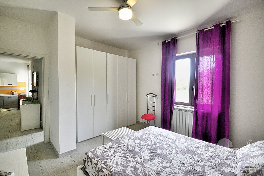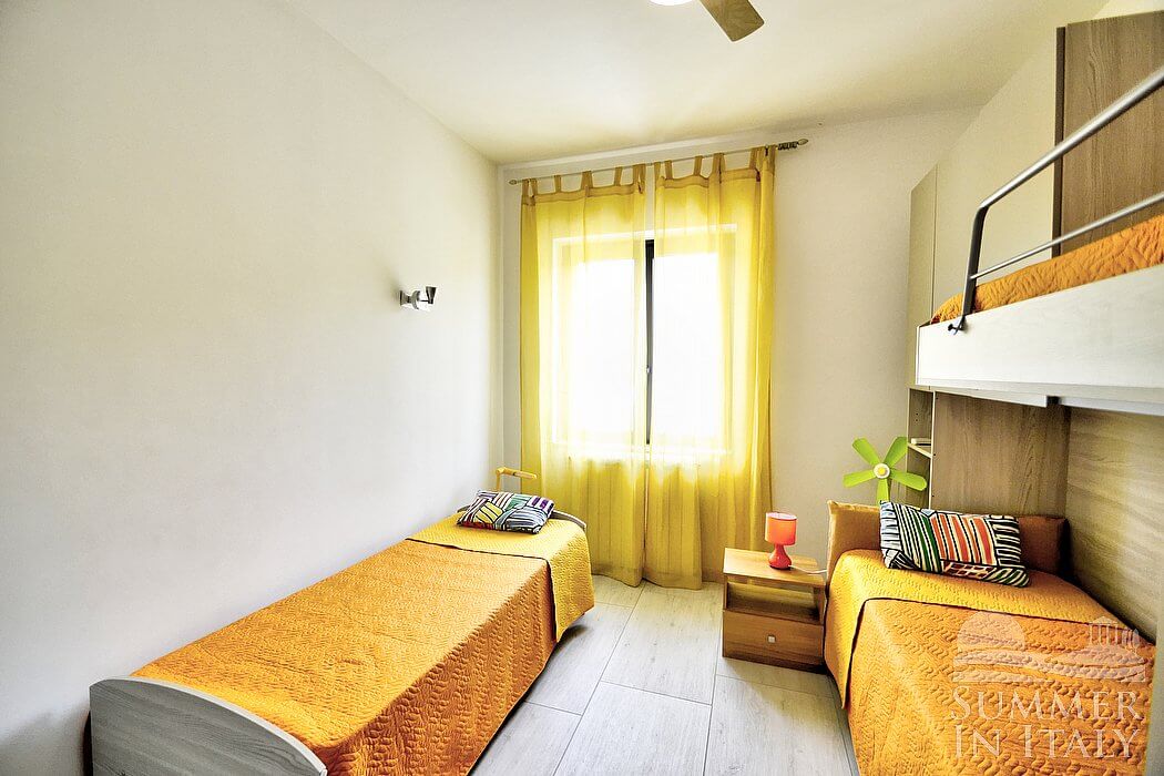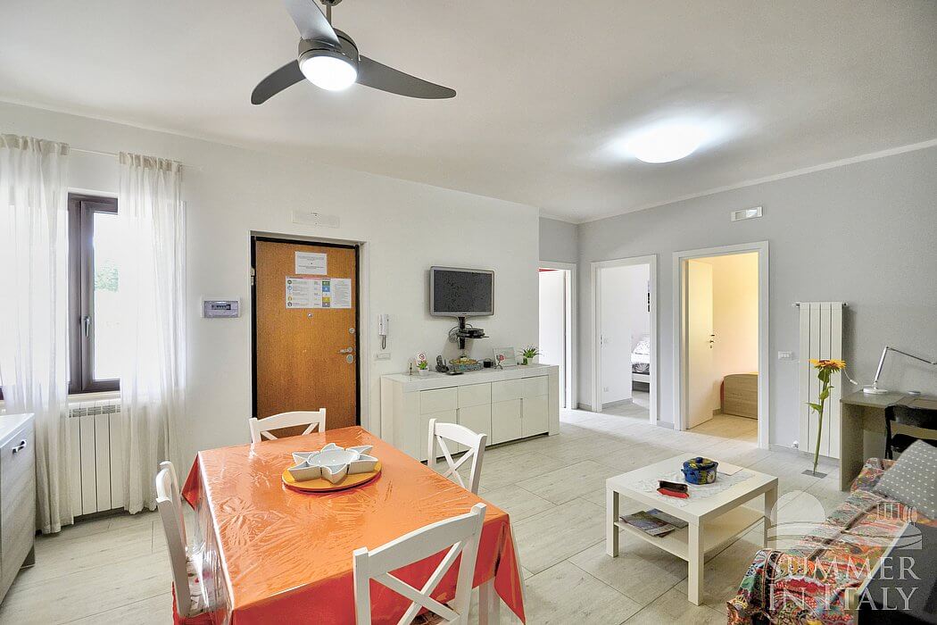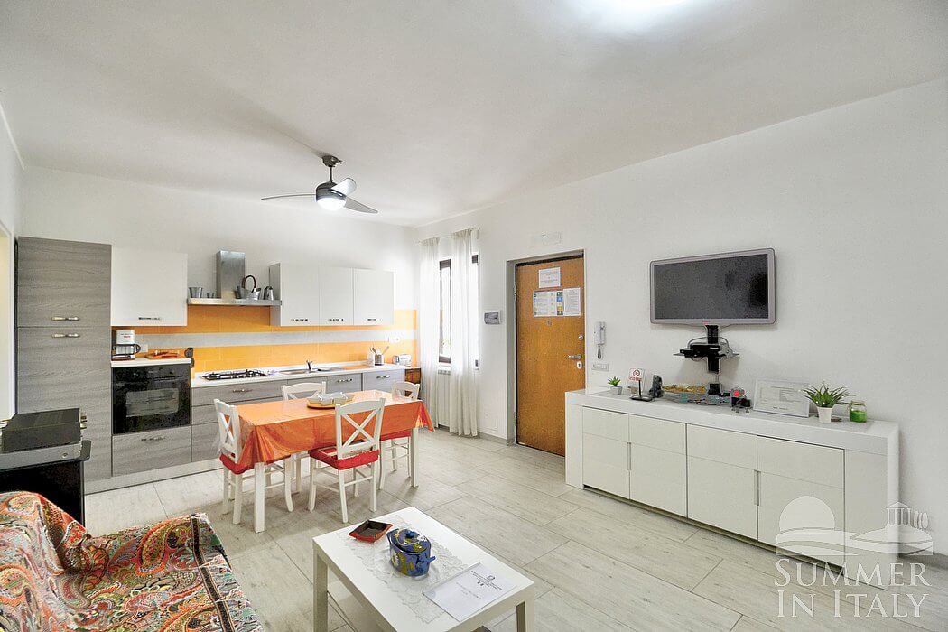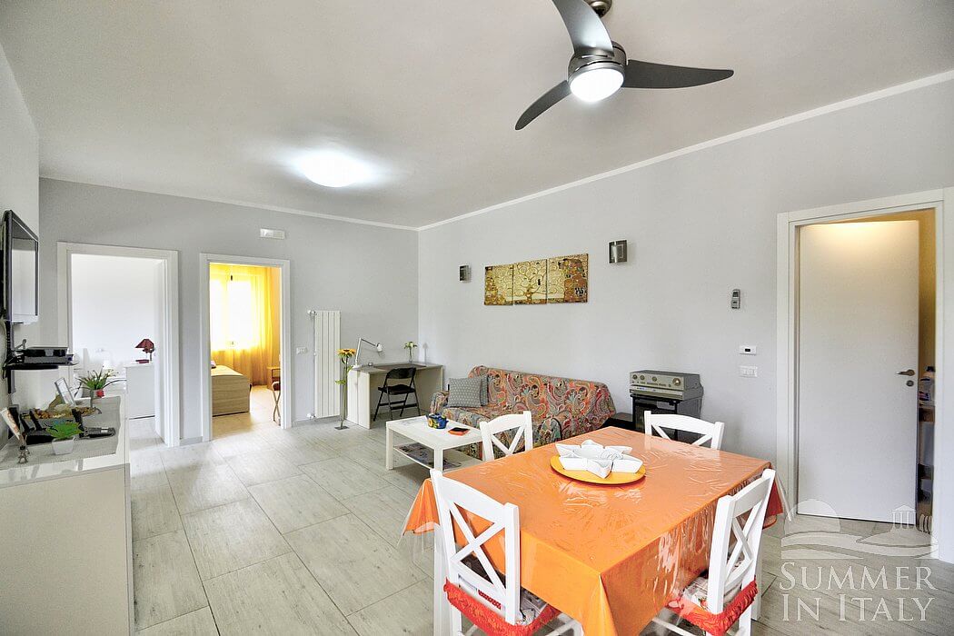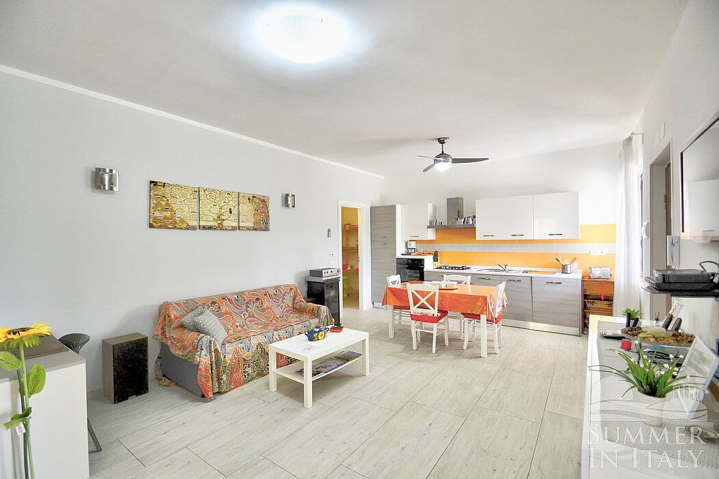 The furnishings of the living room are simple and comfortable. The furnishings include a sofa and a desk. In the living room you will also find a cooking area. The kitchenette is equipped with a four-burner gas cooker, an electric oven, a refrigerator with freezer, a dishwasher, a microwave oven, an Italian-style coffee-maker and a kettle. The dining table can accommodate six guests. In this room you will find a satellite television (local channels). The room has a window. Here you will also find a ceiling fan.