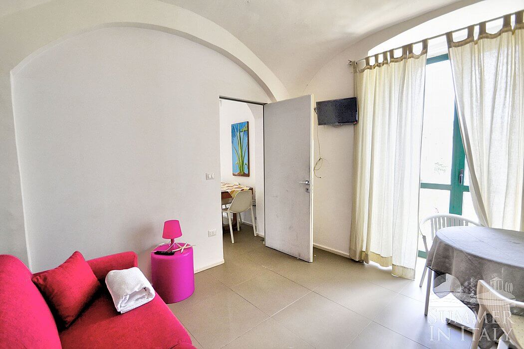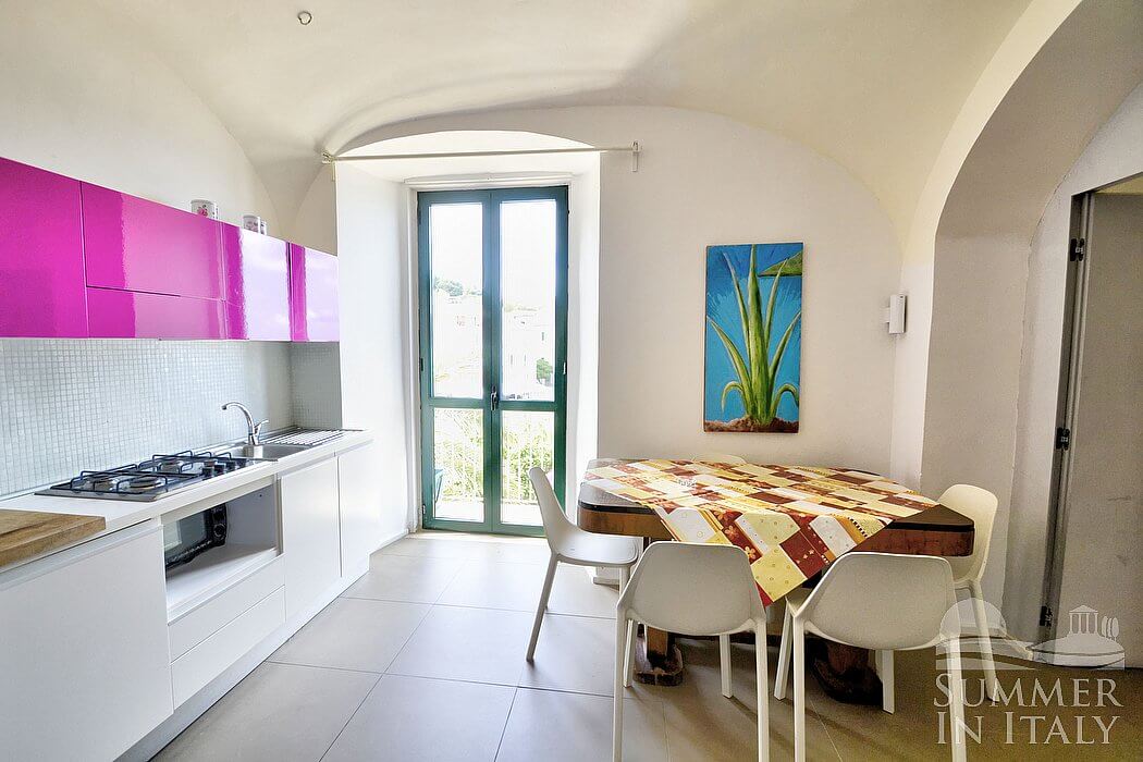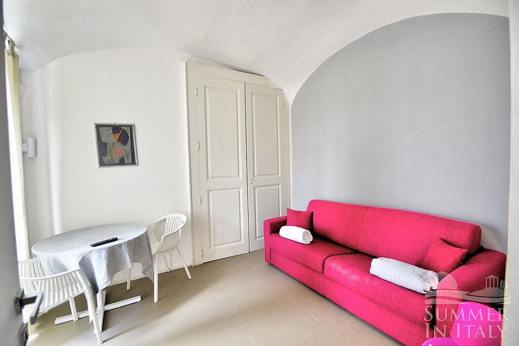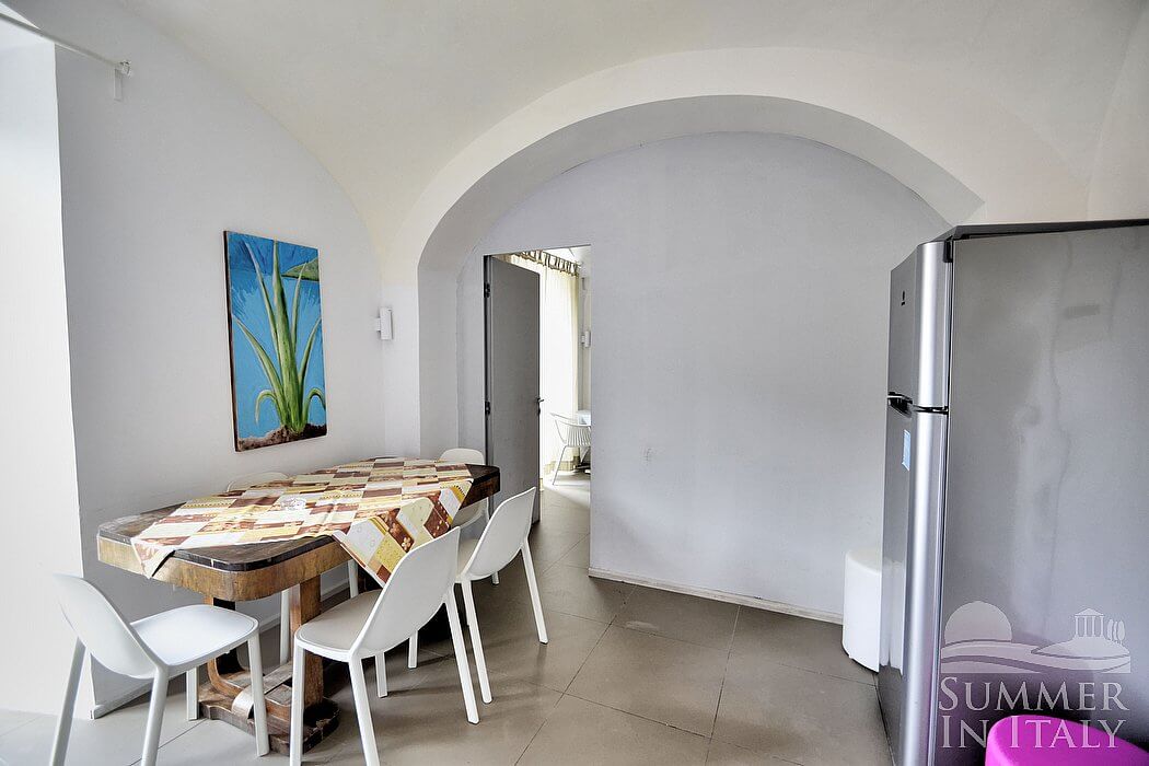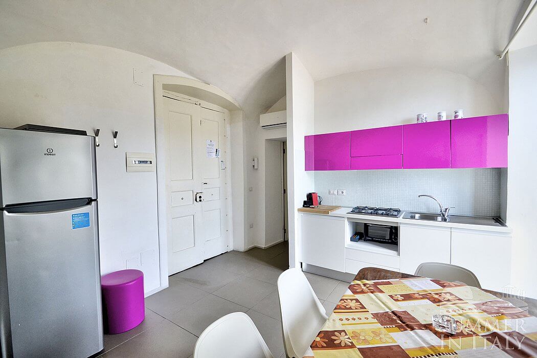 The kitchen is equipped with a four-burner gas cooker, a small electric oven, a refrigerator with freezer and an Italian-style coffee-maker. The dining table can accommodate six guests. From the kitchen a French door will take you to a small balcony. The kitchen is equipped with an air conditioning/heating unit.