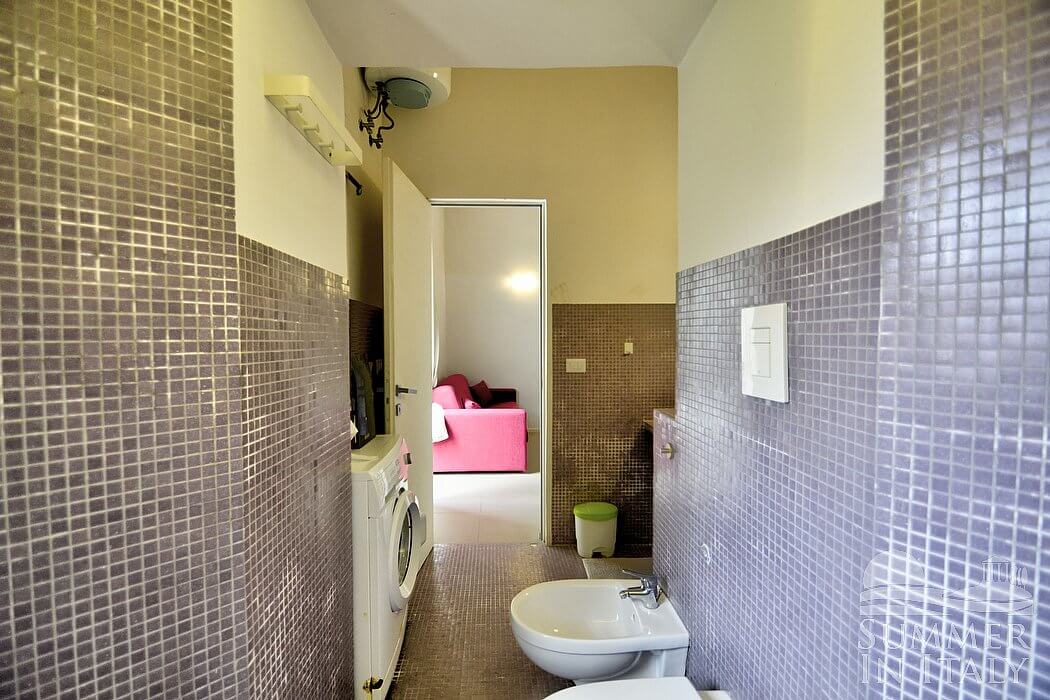 You will be able to enter the bedroom from the kitchen. The bedroom has a matrimonial bed (160 cm/63 inches, wider than a queen-size bed). The furnishings include a divan that unfolds into a double bed. From the bedroom you will be able to enter a small balcony through a French door. The bedroom is equipped with an air conditioning/heating unit. This bedroom has an en-suite bathroom, equipped with a washbasin, a toilet, a large shower and a hairdryer. Here you will also find a washing machine.