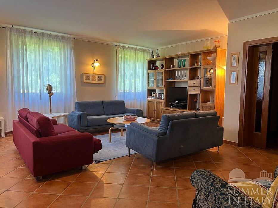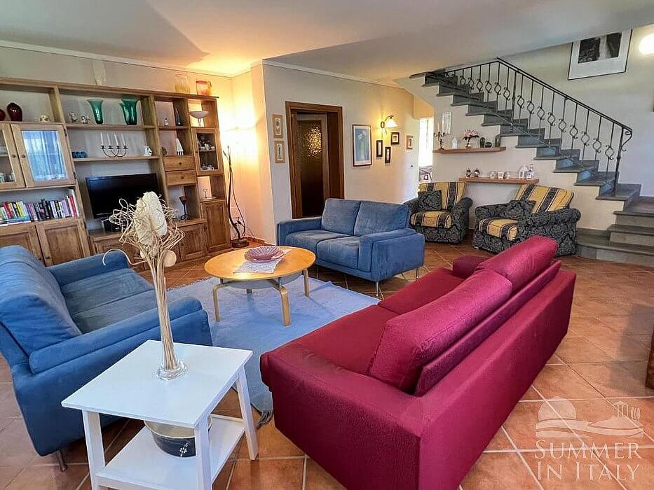 The furnishings of the living room are warm and welcoming, and include three sofas, an armchair and a divan bed for one guest. In this room you will find a large satellite television (local channels), a DVD player and a personal computer with broadband Internet connection. The room has four windows with a view of the garden and of the swimming pool.