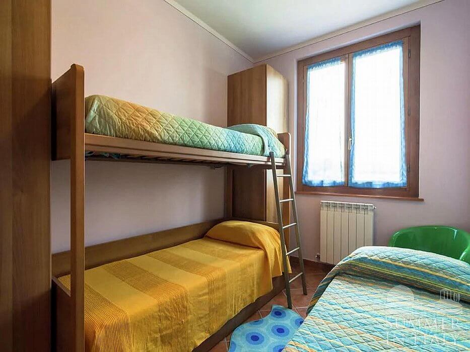 You will be able to enter the fifth bedroom from the corridor. It has a bunk bed (two single beds, one on top of the other). An additional single trundle bed is available (if requested in advance with an additional cost -- please enquire with our staff) to make it a triple room. The room has a window with a view of the swimming pool and of the hills.