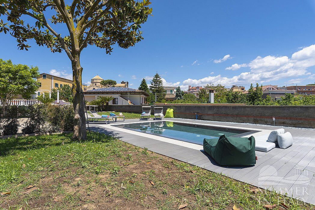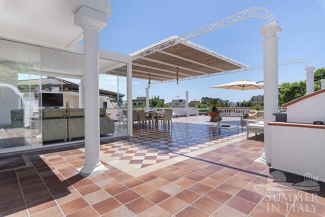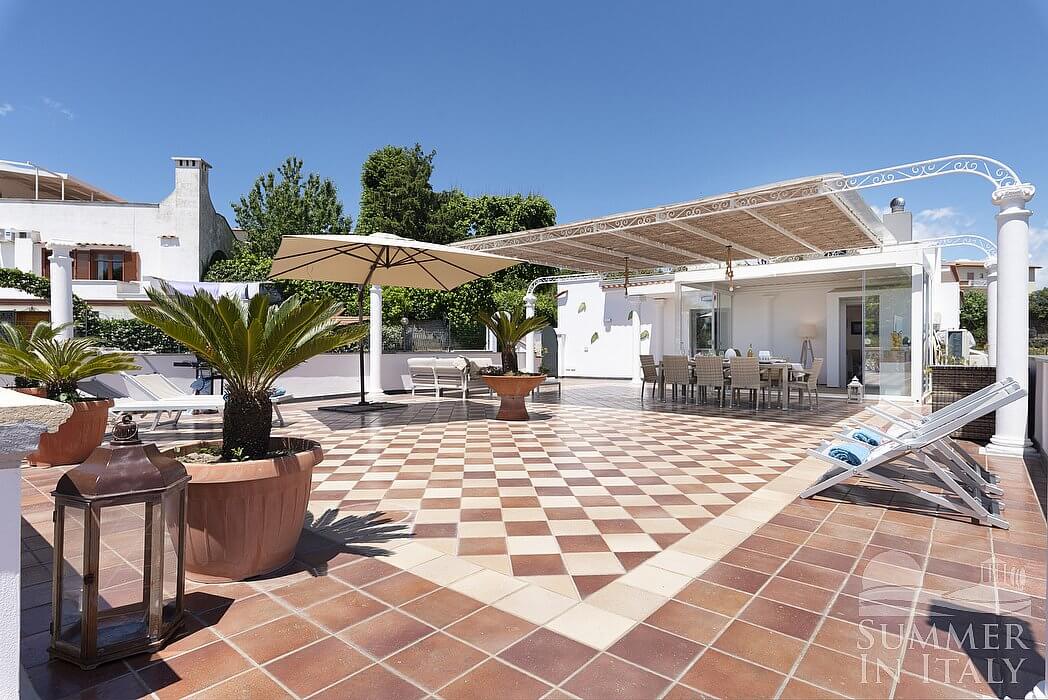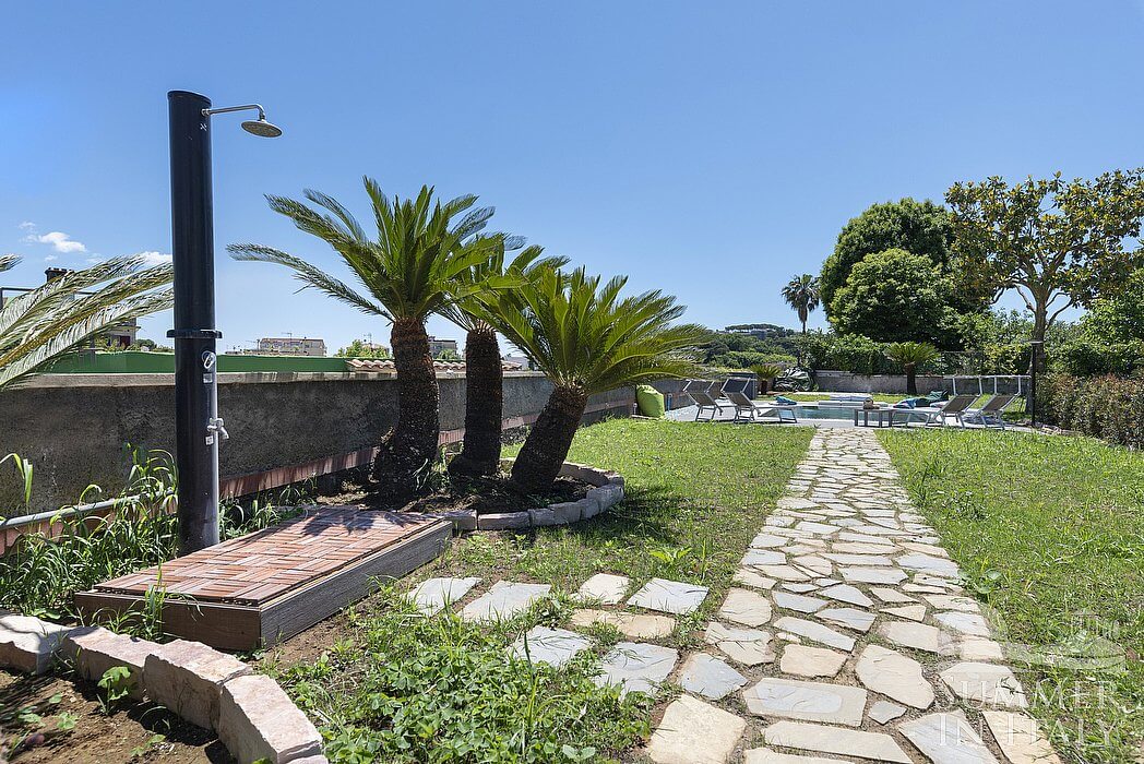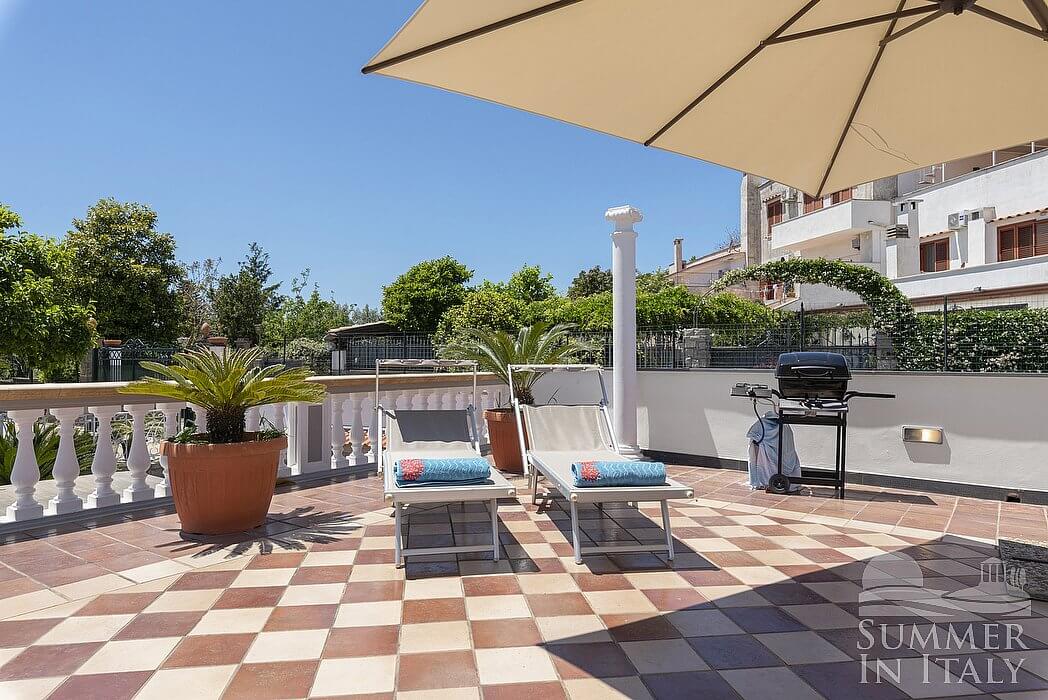 The patio is 150 square meters (1615 square feet) large. It is partly shaded by a characteristic pergola with a bamboo roof. It is equipped with a table, chairs, a sun umbrella and sun loungers. Here you will also find a portable barbecue. From the patio you will have a lovely view of the garden, of the greenery and of the surrounding buildings.