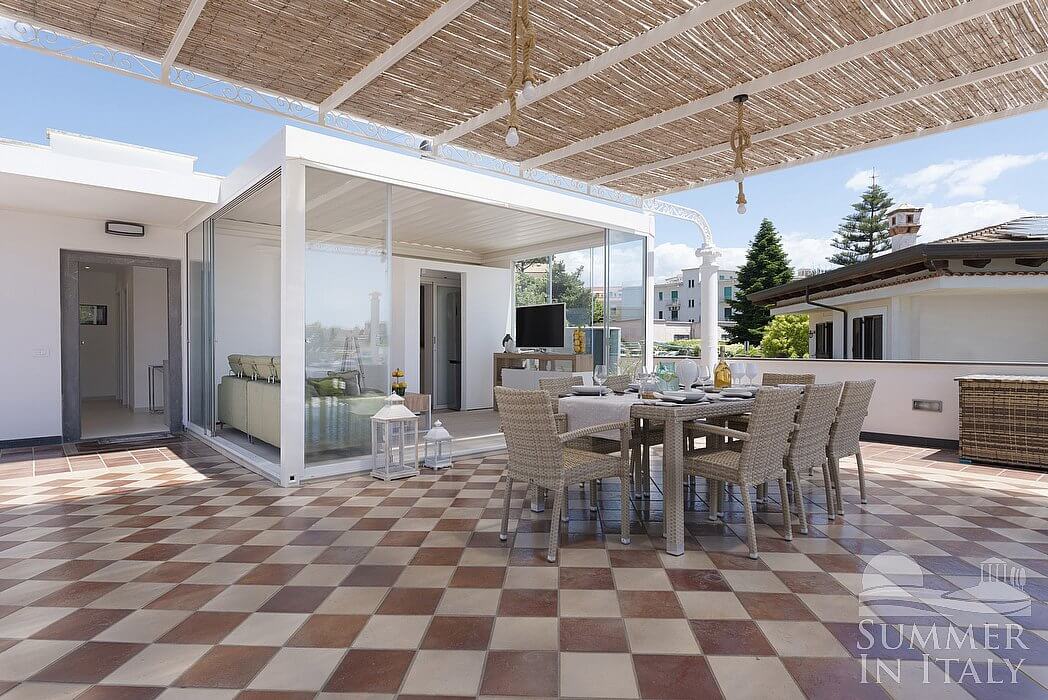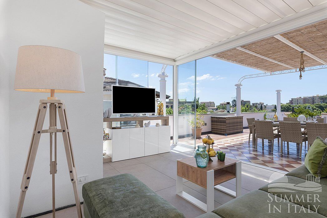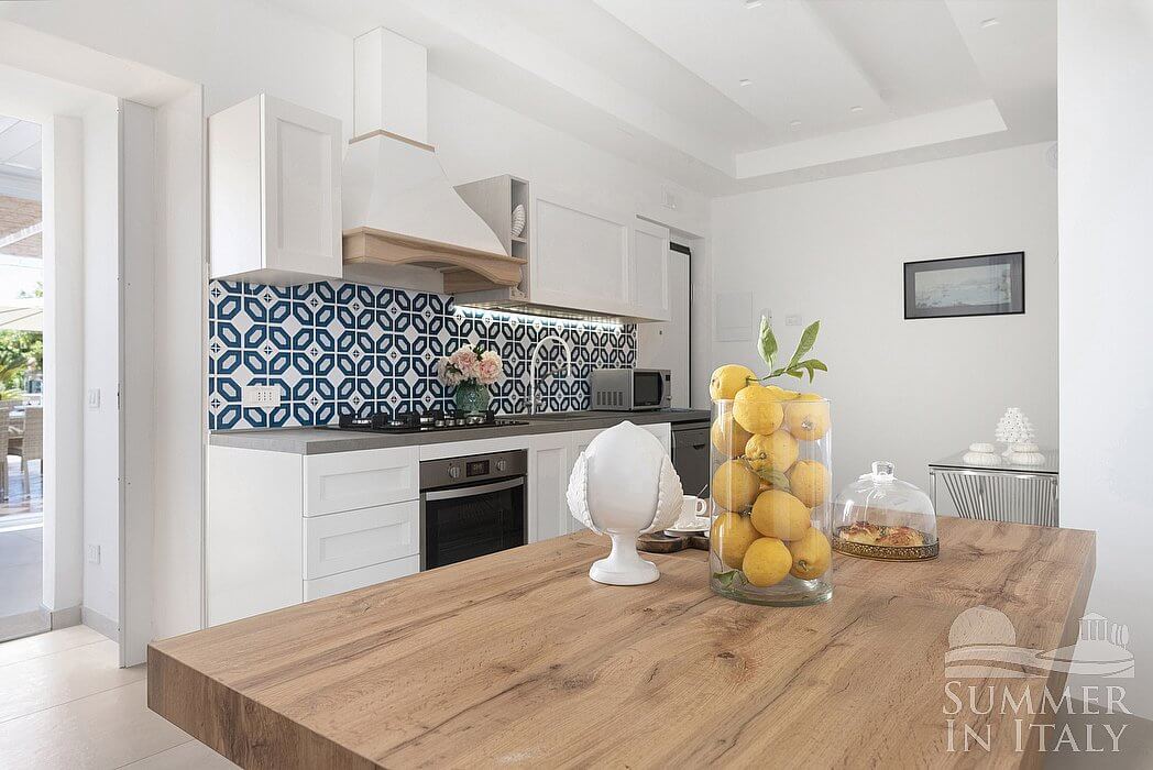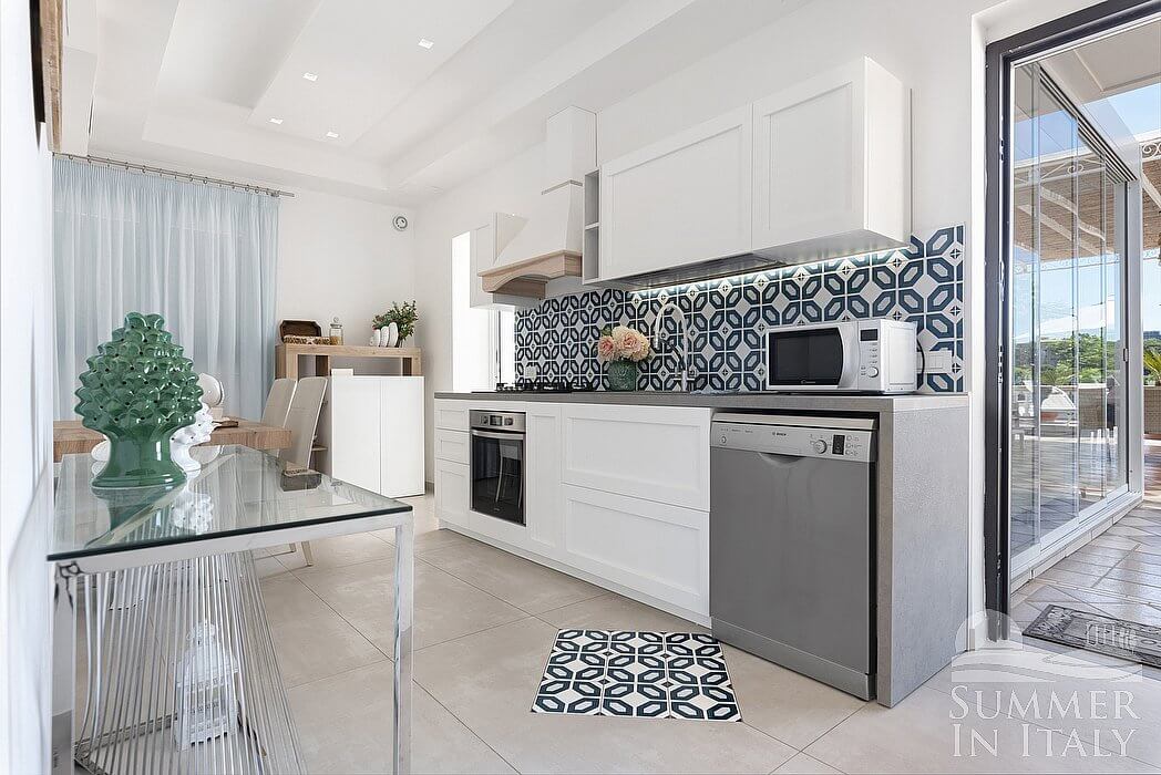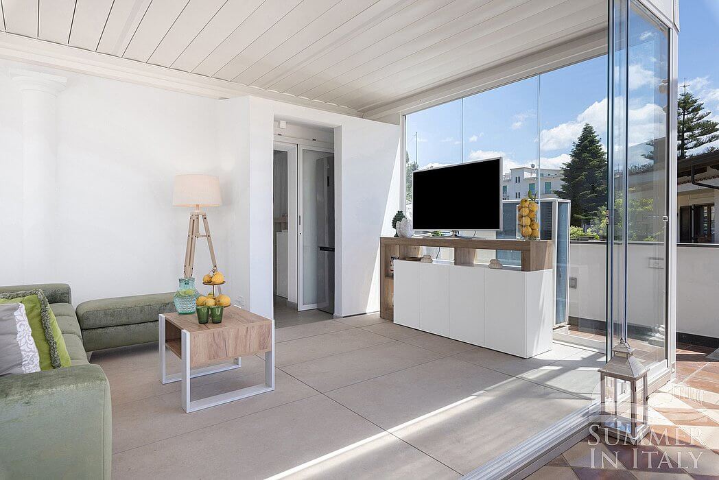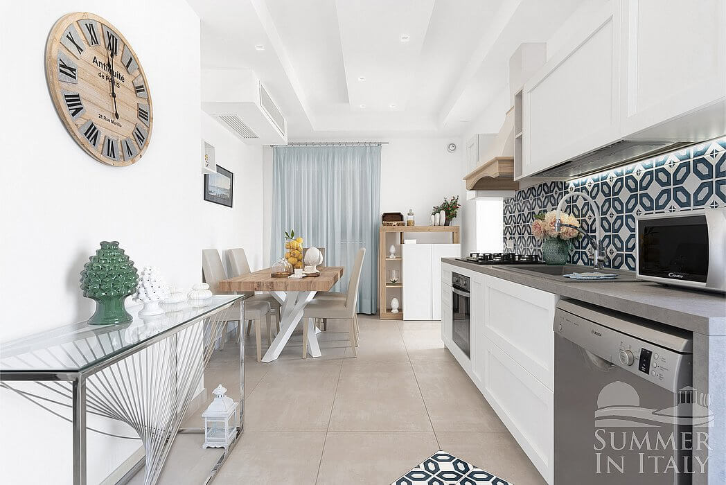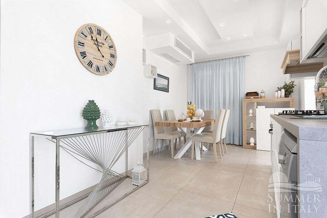 The furnishings of the kitchen are bright and agreeable. It is equipped with a four-burner gas cooker, an electric oven, a refrigerator with freezer, a dishwasher, a microwave oven, an Italian-style coffee-maker and a kettle. The dining table can accommodate six guests. From the kitchen a French door will take you to the verandah.