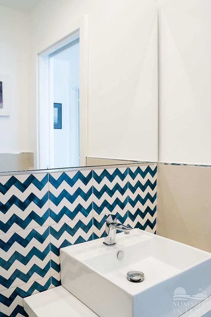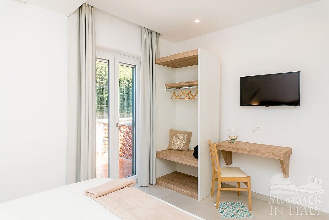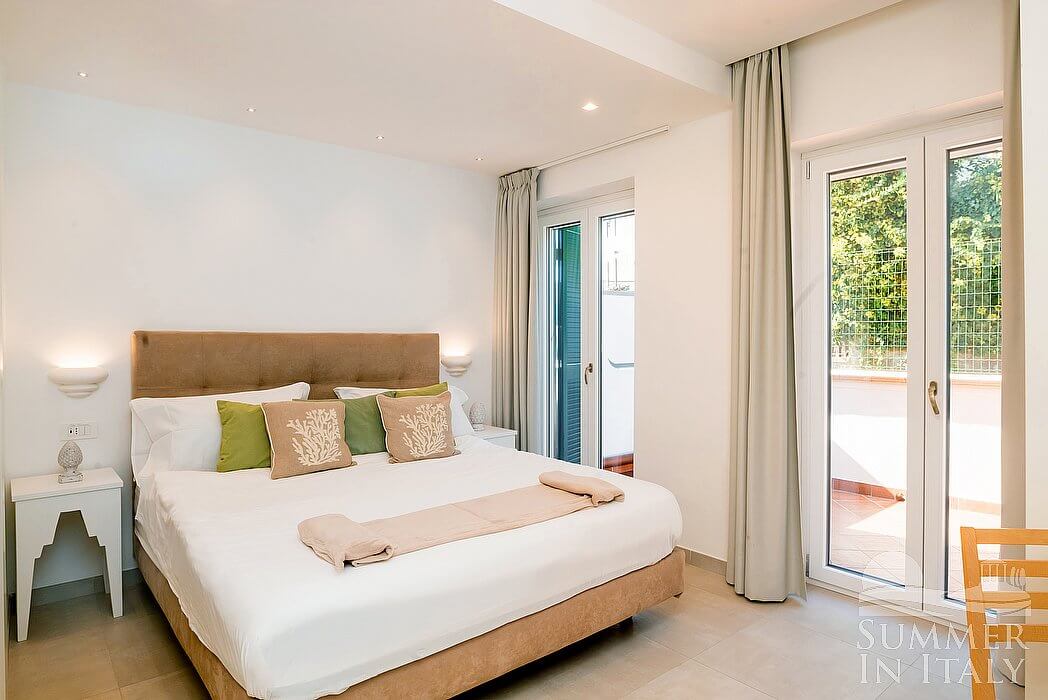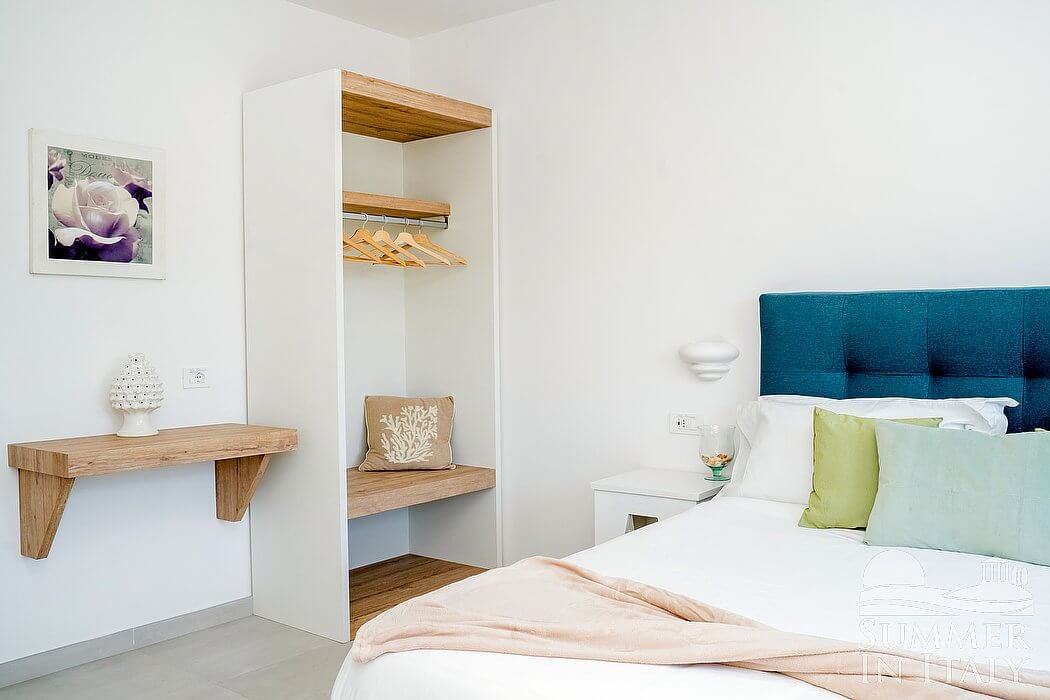You will be able to enter the first bedroom through a corridor. The bedroom has a matrimonial bed (160 cm/63 inches, wider than a queen-size bed). The furnishings include a desk. In this room you will find a satellite television (local channels). From the bedroom you will be able to enter a alleyway at the rear of the house through two French doors. The bedroom is equipped with an air conditioning/heating unit. This bedroom has an en-suite bathroom, decorated with majolica tiles and equipped with a washbasin, a toilet, a fully enclosed shower and a hairdryer.