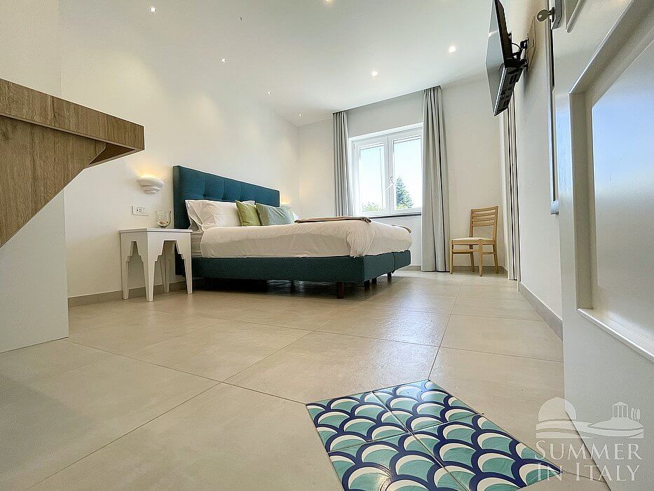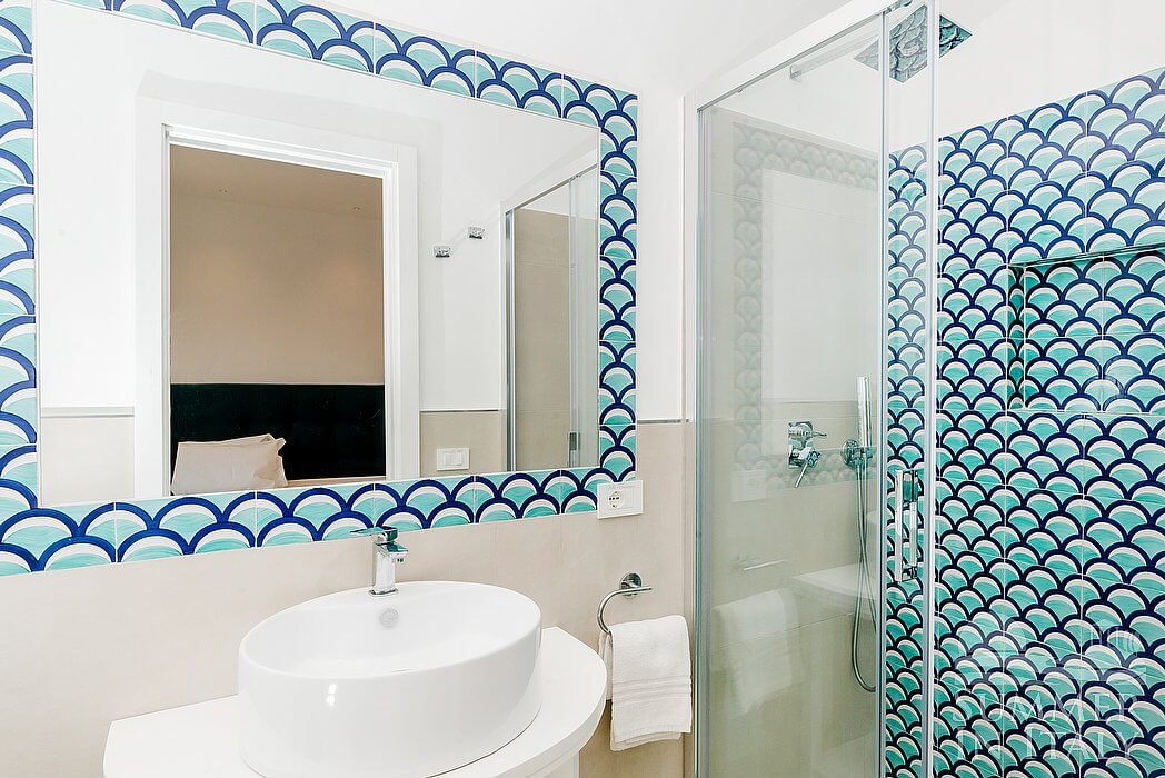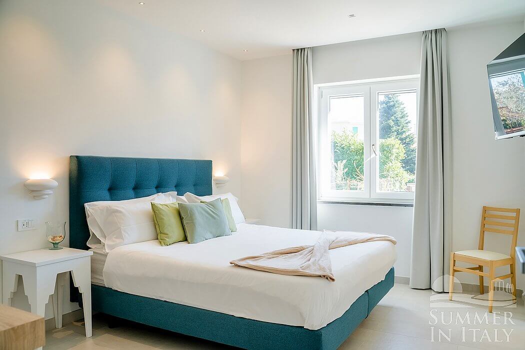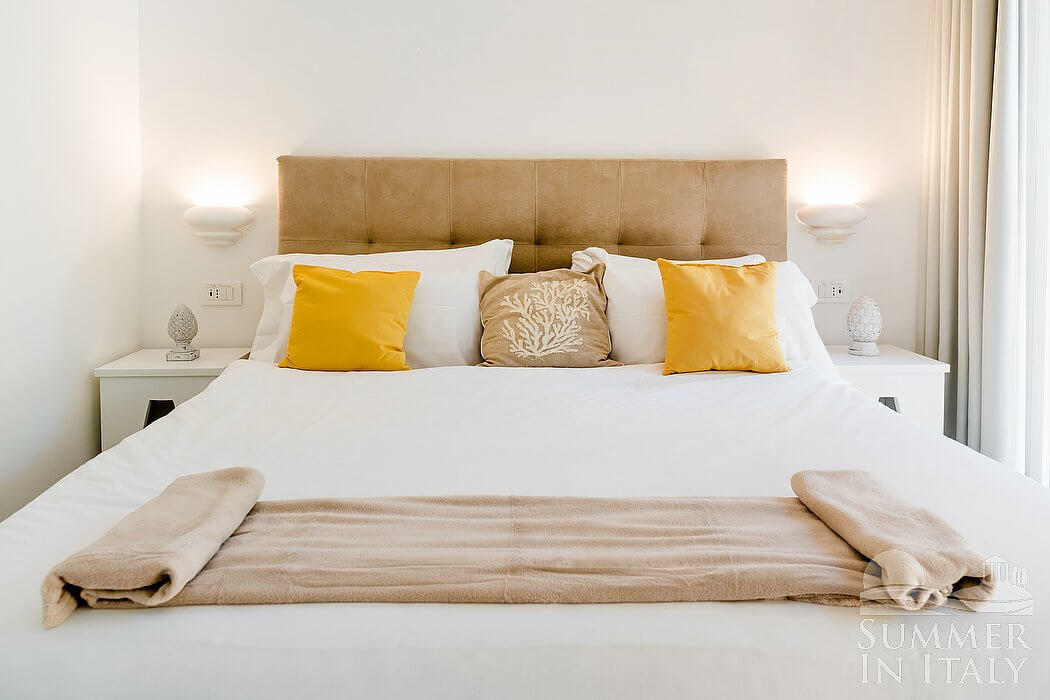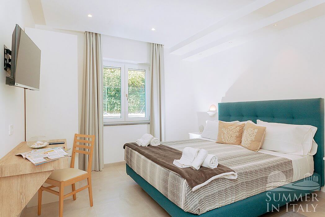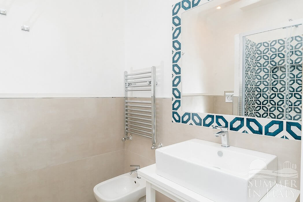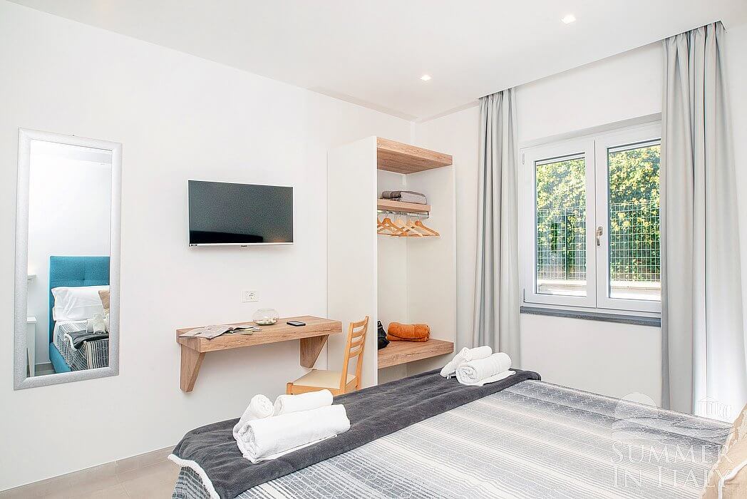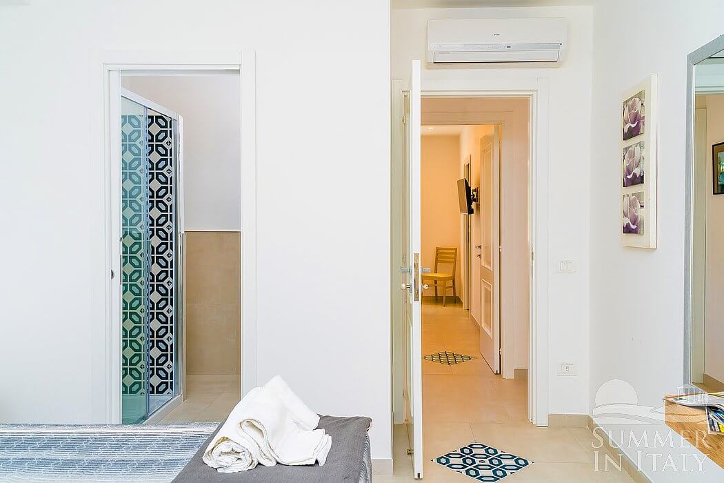 You will be able to enter the second bedroom through a corridor. The bedroom has a matrimonial bed (160 cm/63 inches, wider than a queen-size bed). The furnishings include a desk. In this room you will find a satellite television (local channels). The room has a window, and it's equipped with an air conditioning/heating unit. This bedroom has an en-suite bathroom, decorated with majolica tiles and equipped with a washbasin, a toilet, a fully enclosed shower and a hairdryer.