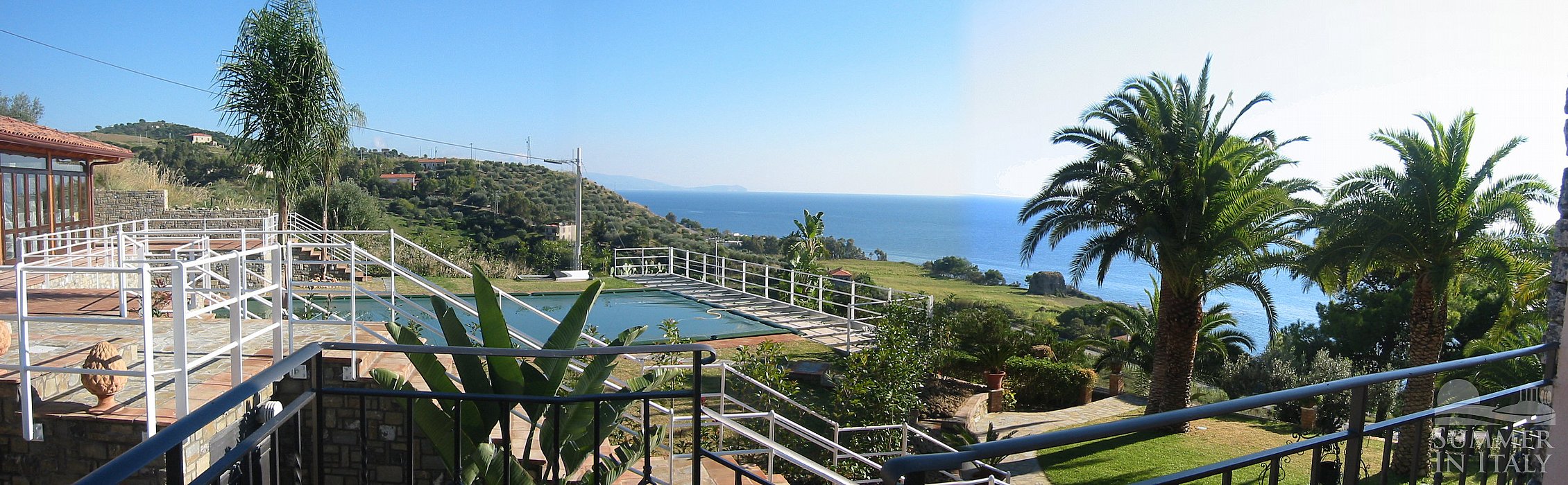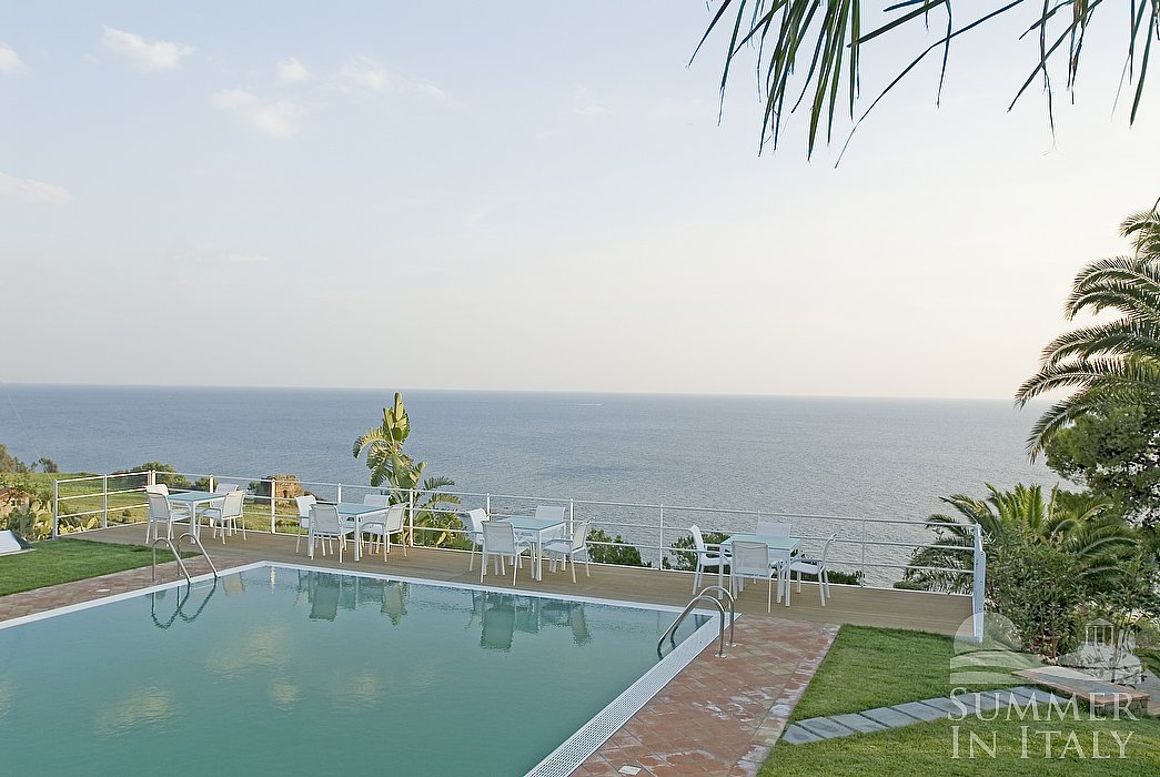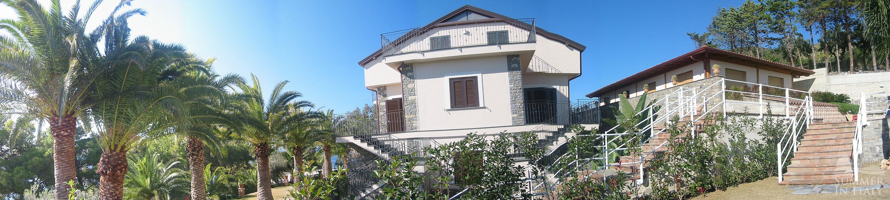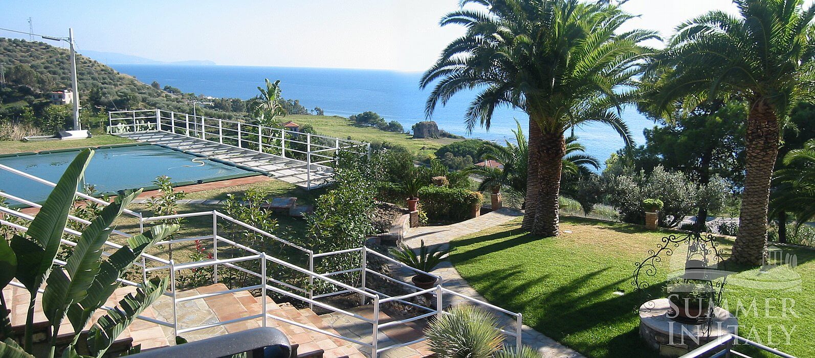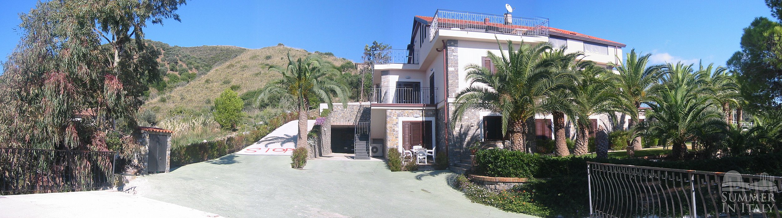 The villa is a three-storey building, isolated and surrounded by a fenced-in garden. All you will see is an uncontaminated angle of the Parco Nazionale del Cilento (National Park of Cilento): around and to the back of the villa is the verdant hill covered in Mediterranean vegetation, right in front of an endless horizon of blue sea.