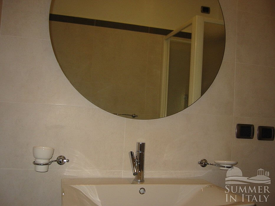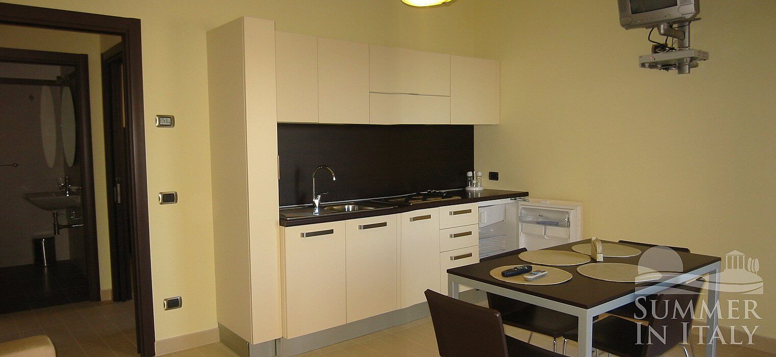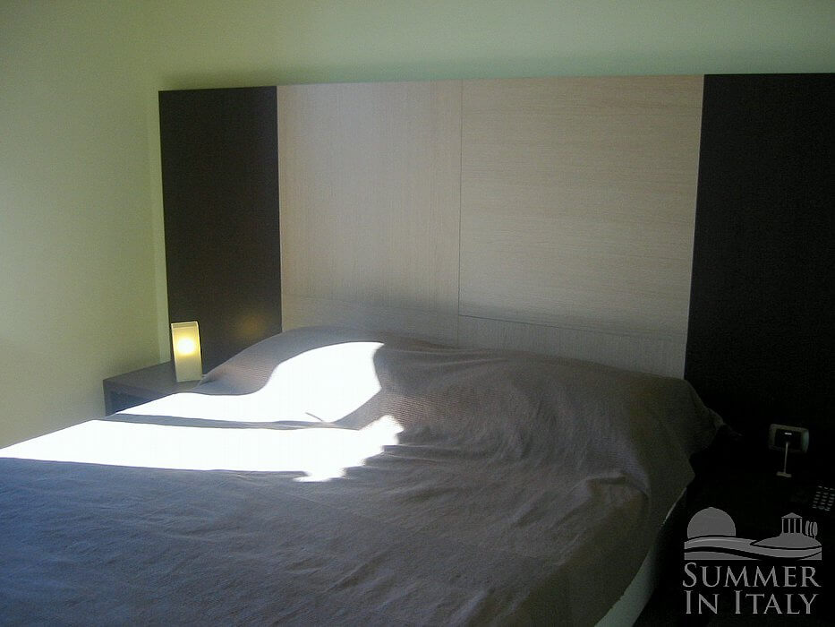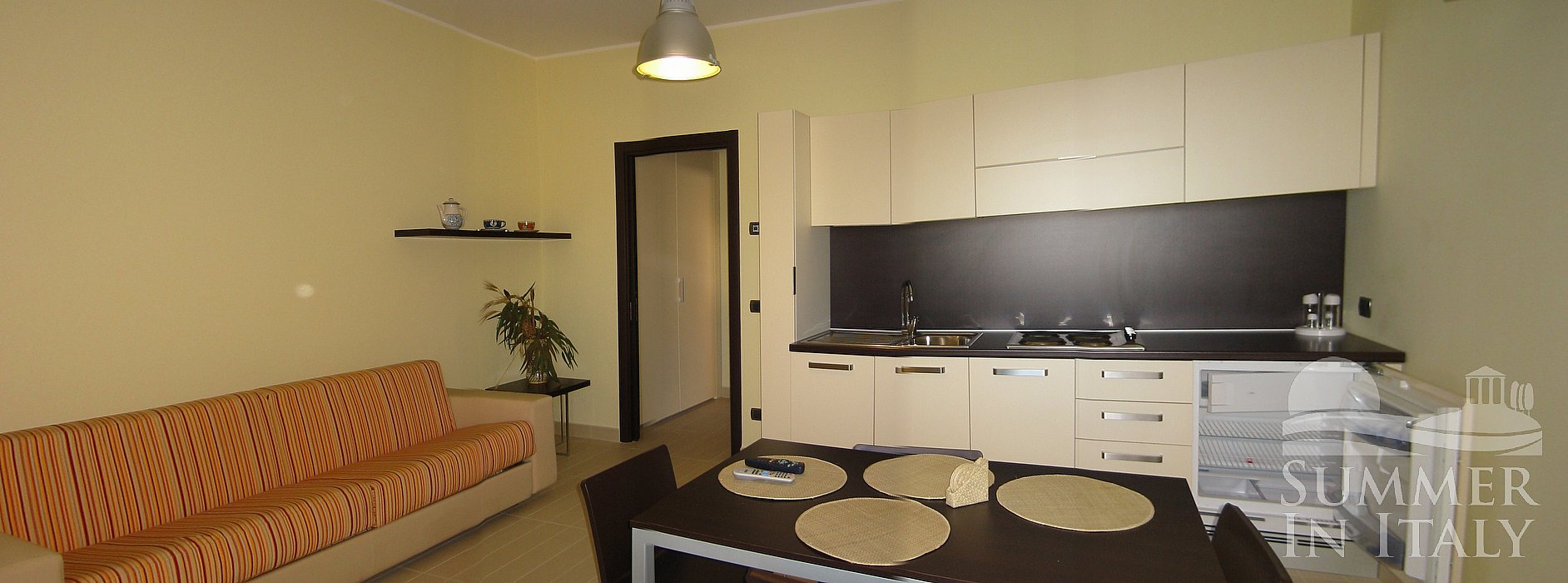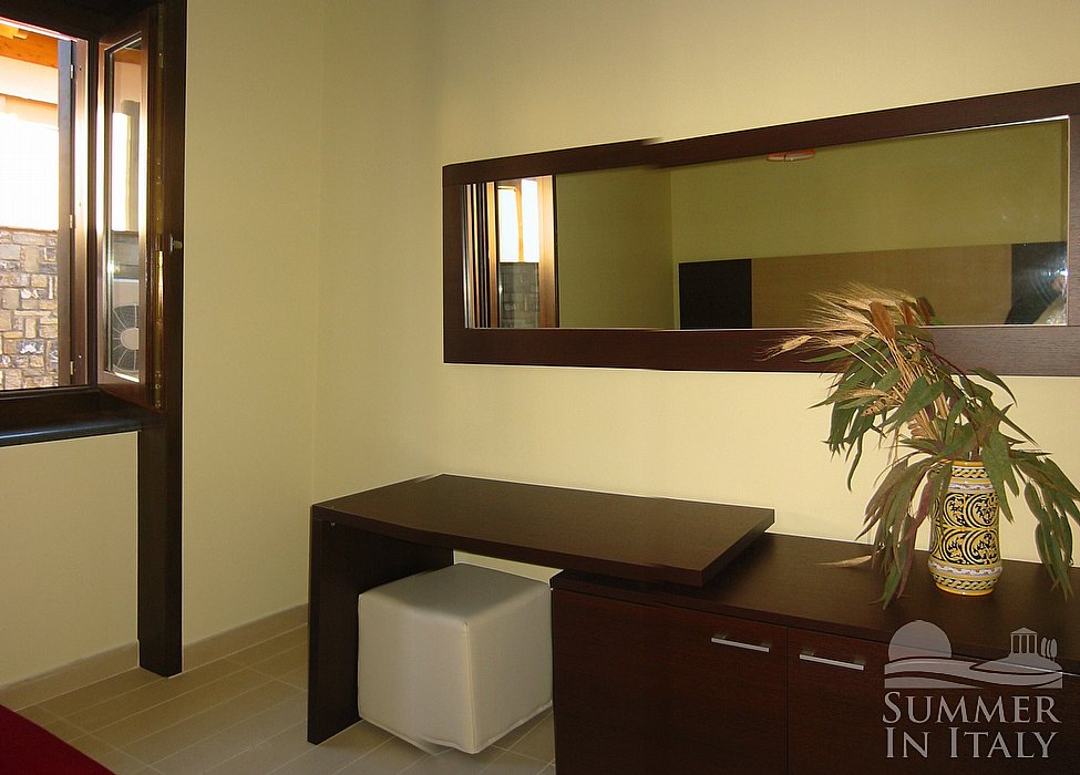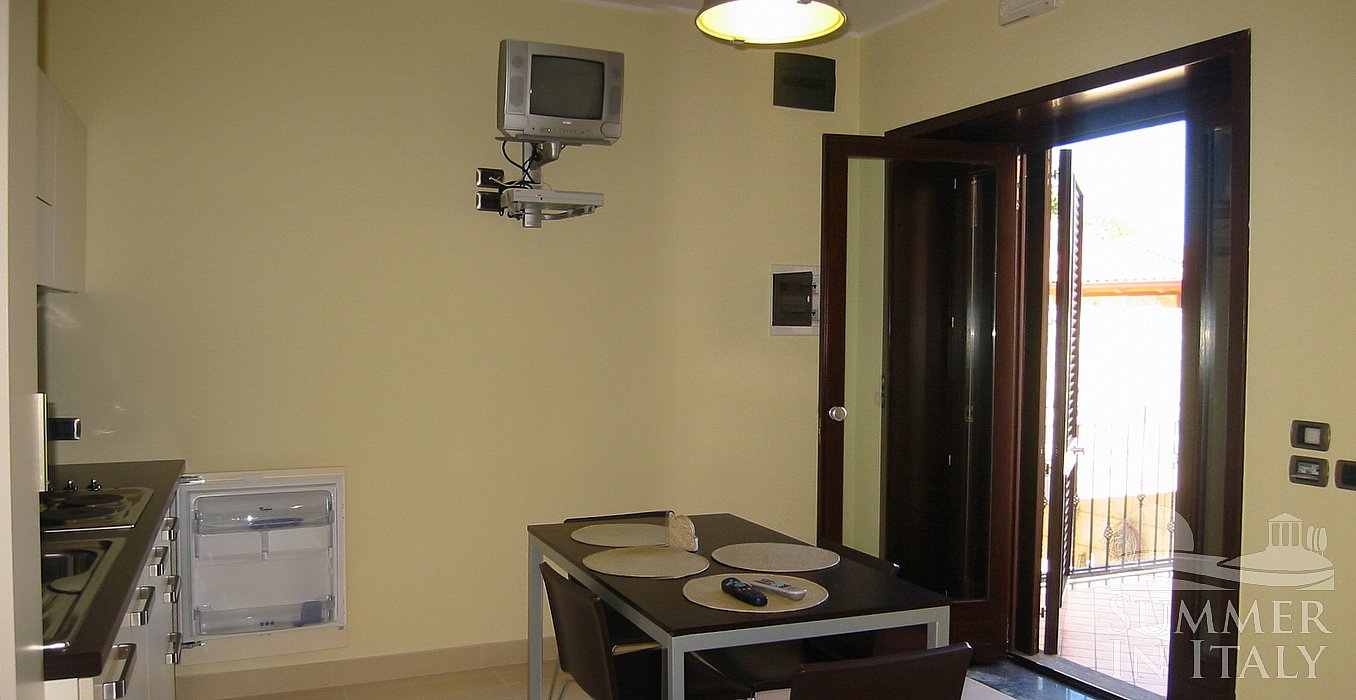 The furnishings of the living room are simple and comfortable. The furnishings include a divan that unfolds into a double bed. In the living room you will also find a cooking area. The kitchenette is equipped with a four-burner electric cooker, a small refrigerator with freezer and an Italian-style coffee-maker. The dining table can accommodate four guests. In this room you will find a satellite television (local channels). From the living room you will be able to enter the terrace through a French door. The room is equipped with an air conditioning/heating unit.