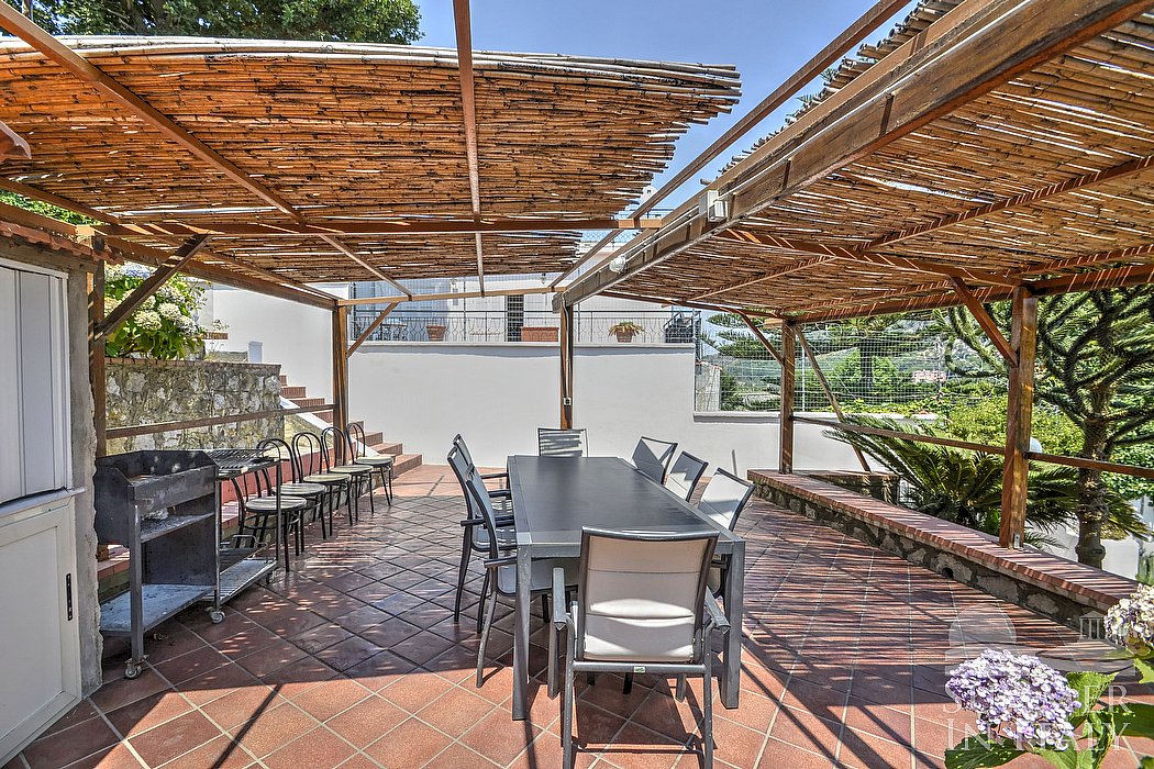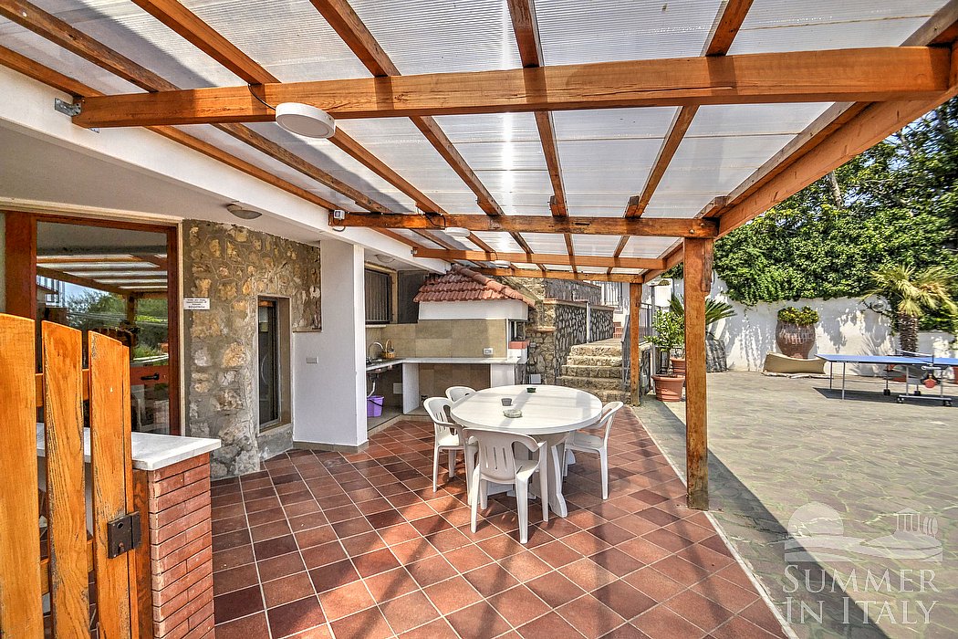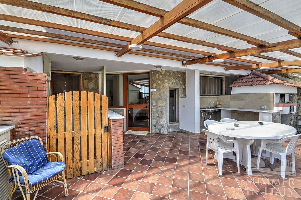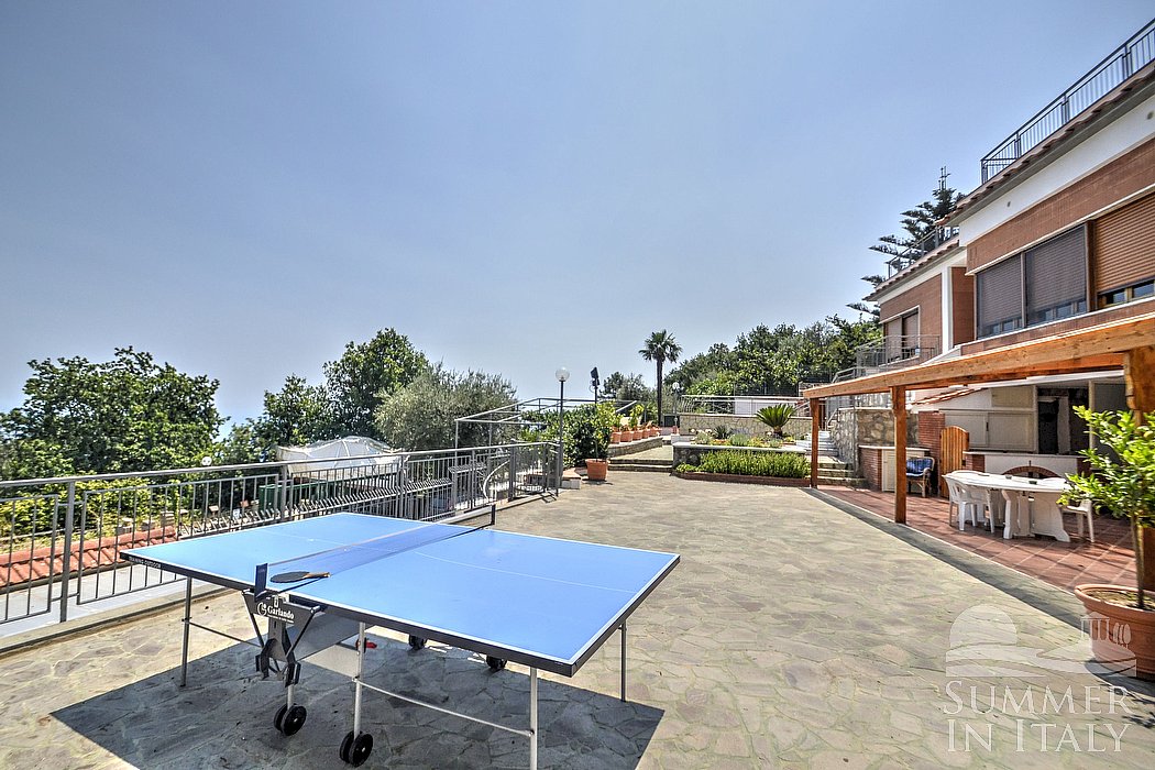 The first patio is 100 square meters (1076 square feet) large. It is partly shaded by elegant trees and by a porch. It is equipped with tables and chairs. In the patio you will be able to have fun with a ping pong table and a football table. Here you will also find a barbecue. At your disposal there will be a washing machine (hidden in a cabinet), an iron and an ironing board. From the patio you will enjoy a spectacular view of the sea and of the coastline.