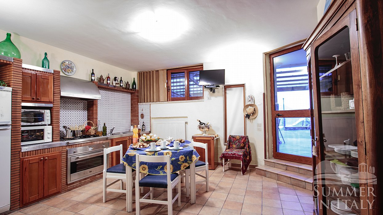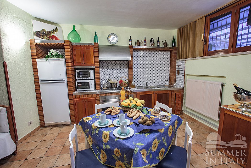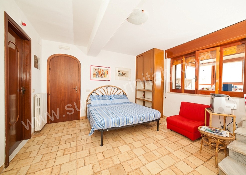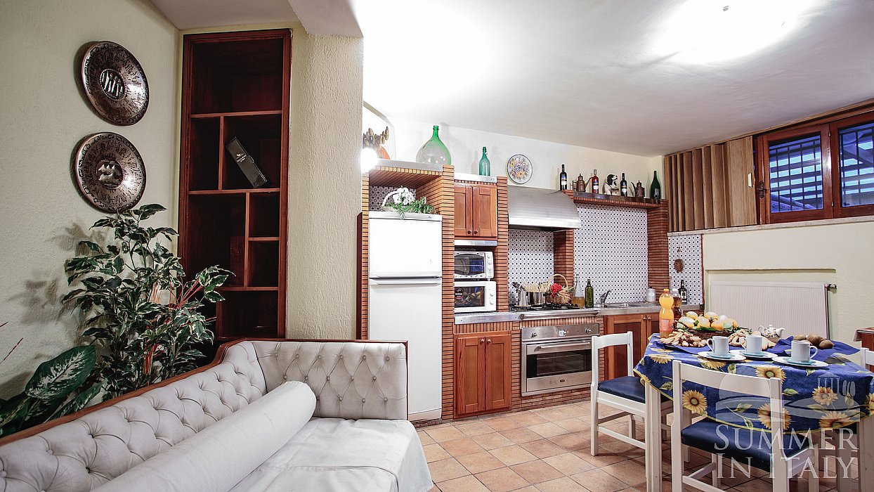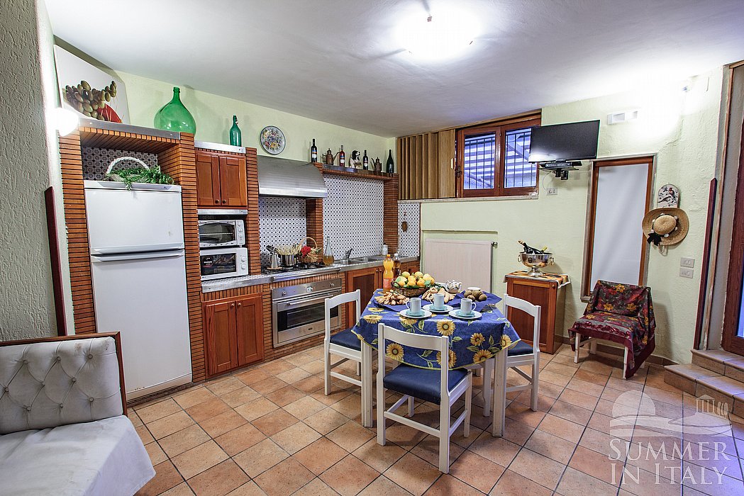 The first living room is paved with terracotta tiles. The furnishings are simple and comfortable. The furnishings include a sofa. In the living room you will also find a cooking area. The kitchenette is equipped with a five-burner gas cooker, an electric oven, a refrigerator with freezer, a microwave oven, an Italian-style coffee-maker and a kettle. The dining table can accommodate eight guests. From the living room you will be able to enter the patio through a French door.