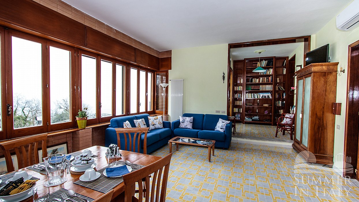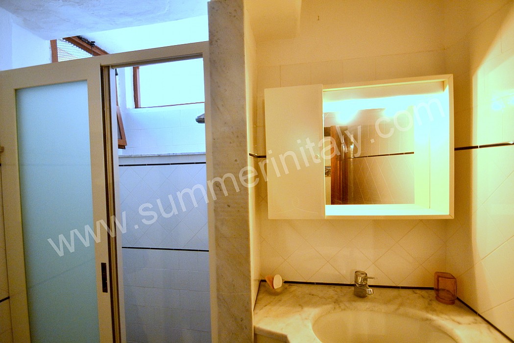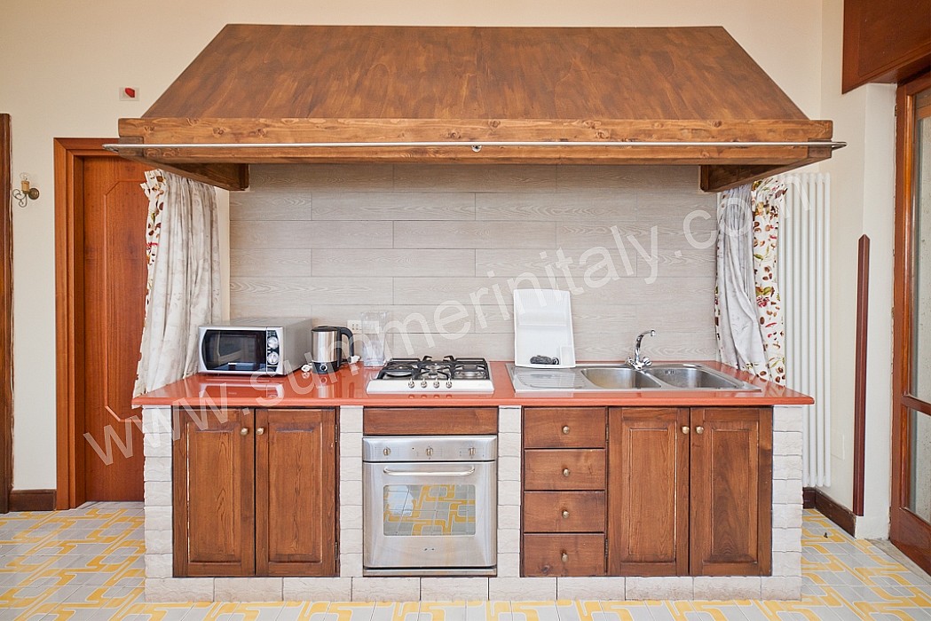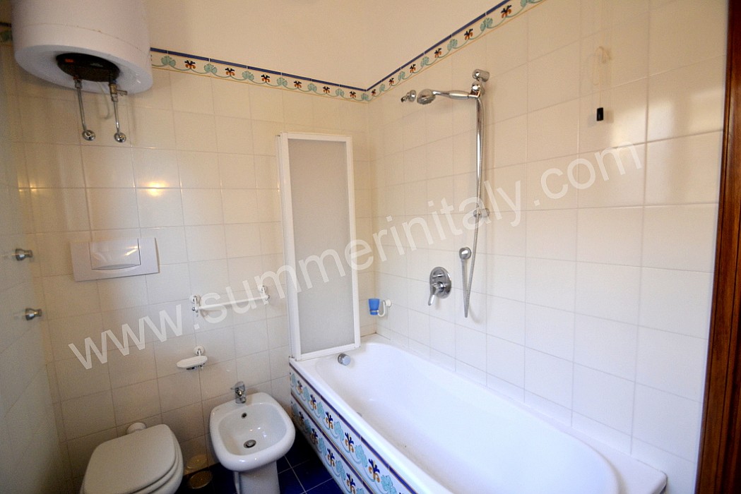 The first living room is paved with terracotta tiles. The furnishings are simple and comfortable. The furnishings include a sofa. In the living room you will also find a cooking area. The kitchenette is equipped with a five-burner gas cooker, an electric oven, a refrigerator with freezer, a microwave oven, an Italian-style coffee-maker and a kettle. The dining table can accommodate eight guests. From the living room you will be able to enter the patio through a French door.