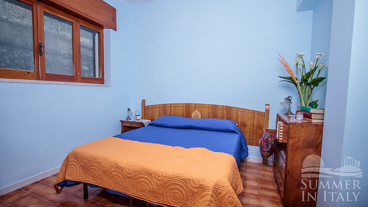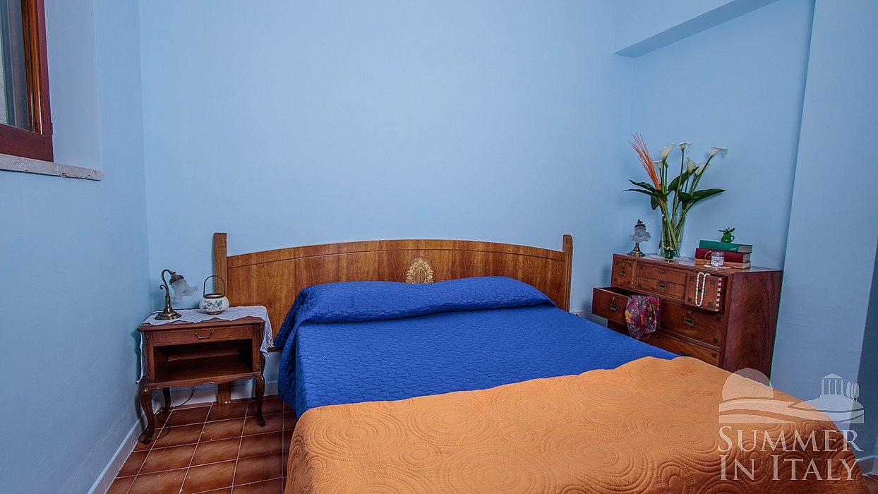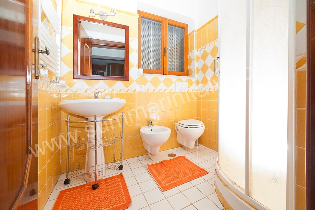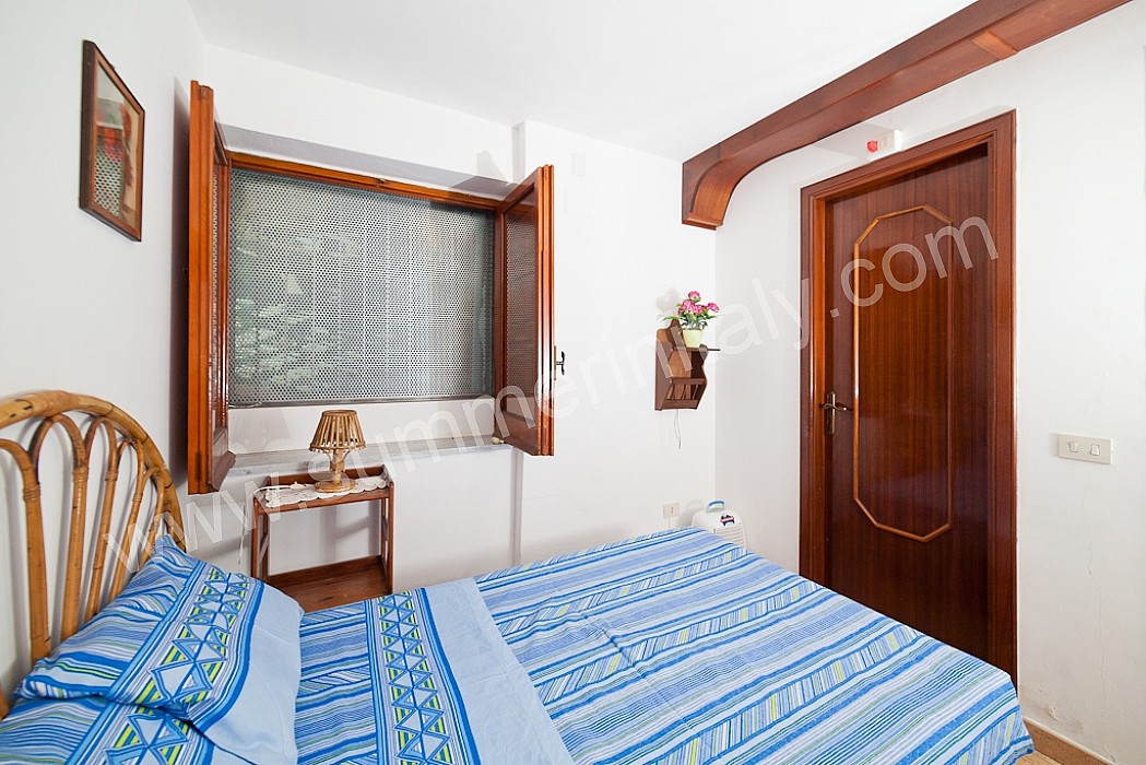 You will be able to enter the first bedroom from the second bedroom or from another independent entrance from the terrace. The bedroom has a matrimonial bed (160 cm/62 inches, wider than a queen-size bed). The furnishings include two armchairs. In this room you will find a satellite television (local channels). From the bedroom you will be able to enter the verandah through a French door. The room also has a large panoramic window that opens into the verandah. This bedroom has an en-suite bathroom, tiled with lucid yellow majolica tiles and equipped with a washbasin, a toilet, a fully enclosed shower and a hairdryer.