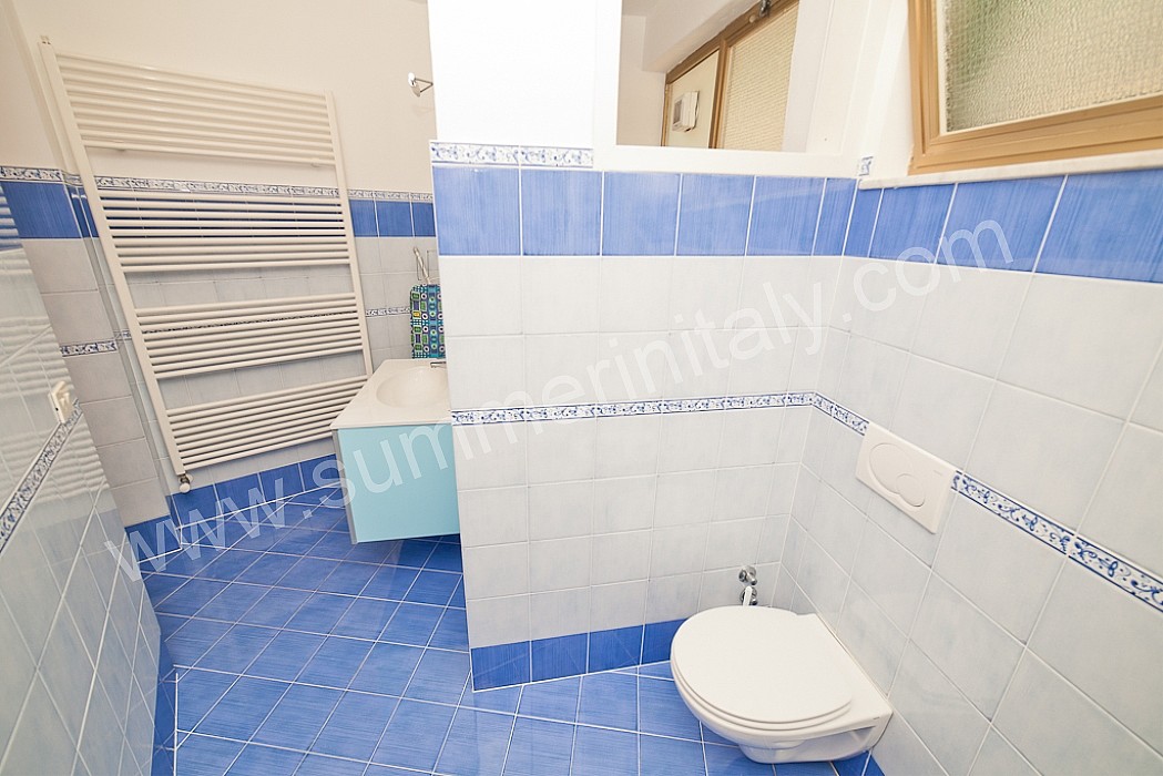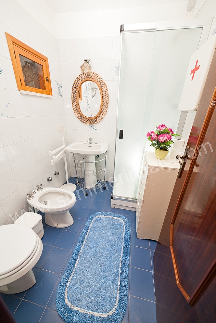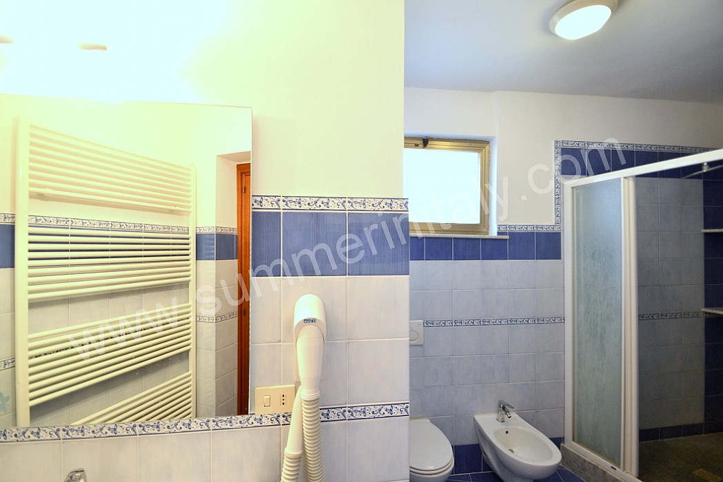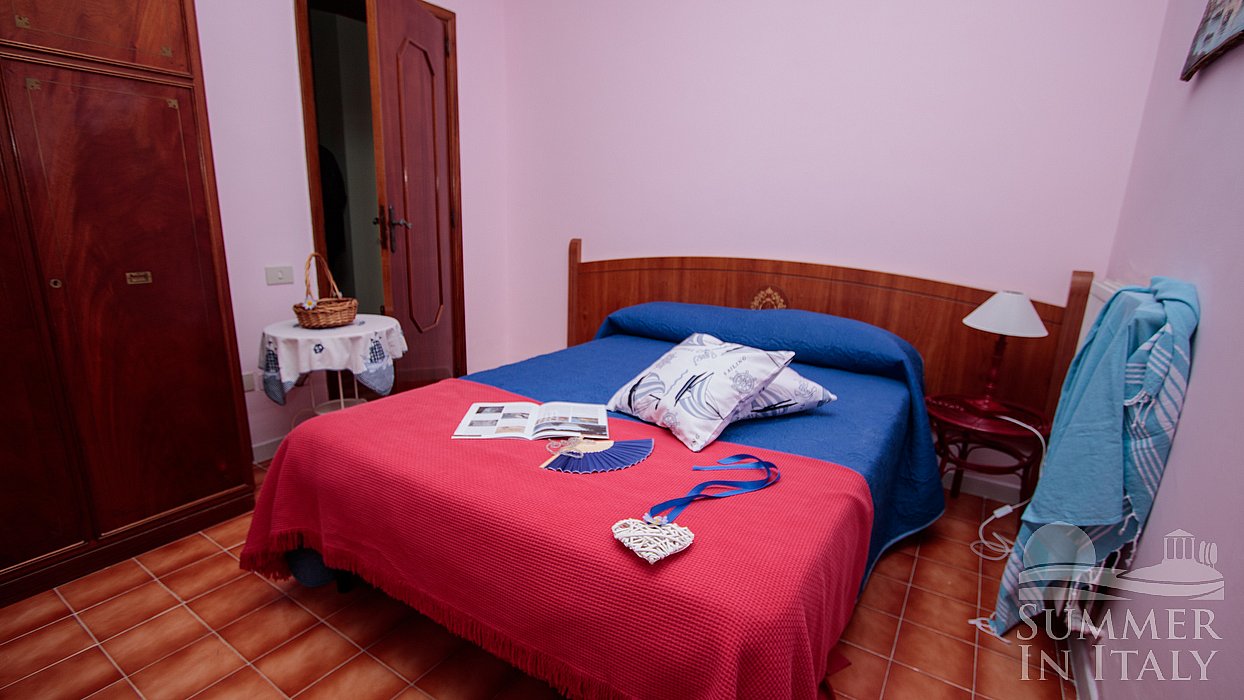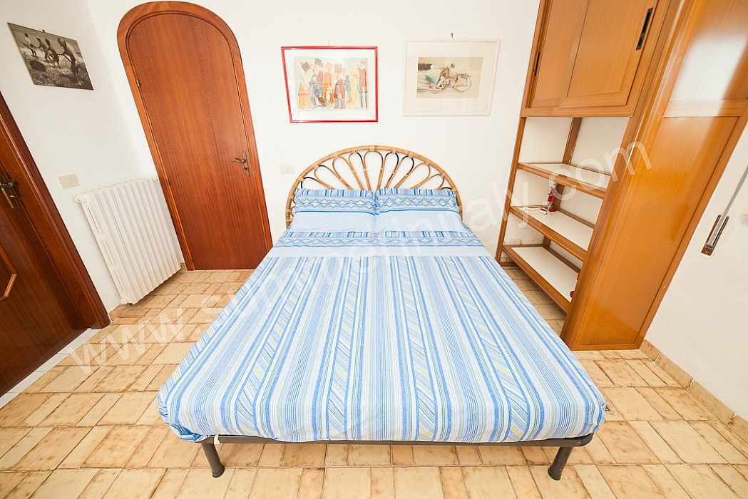 You will be able to enter the first bedroom from the second bedroom or from another independent entrance from the terrace. The bedroom has a matrimonial bed (160 cm/62 inches, wider than a queen-size bed). The furnishings include two armchairs. In this room you will find a satellite television (local channels). From the bedroom you will be able to enter the verandah through a French door. The room also has a large panoramic window that opens into the verandah. This bedroom has an en-suite bathroom, tiled with lucid yellow majolica tiles and equipped with a washbasin, a toilet, a fully enclosed shower and a hairdryer.