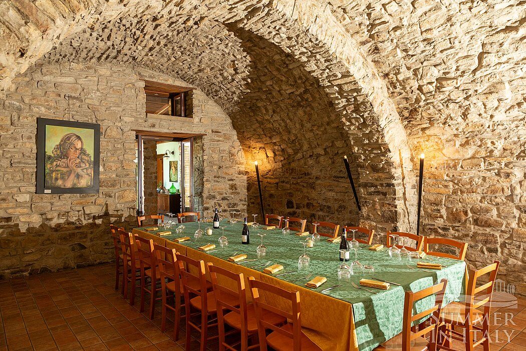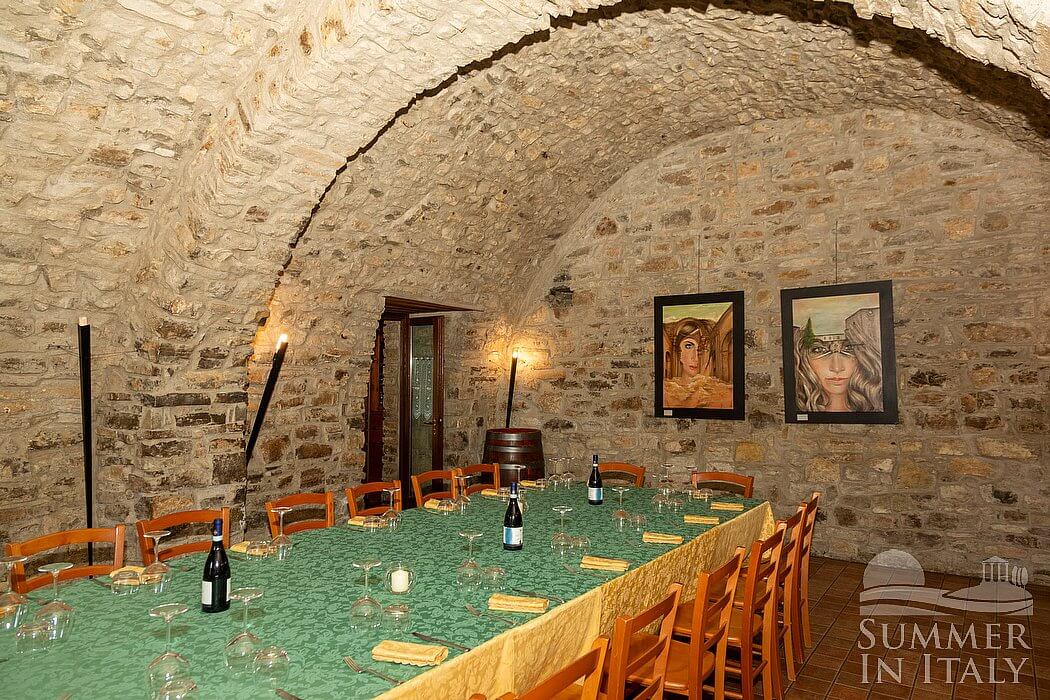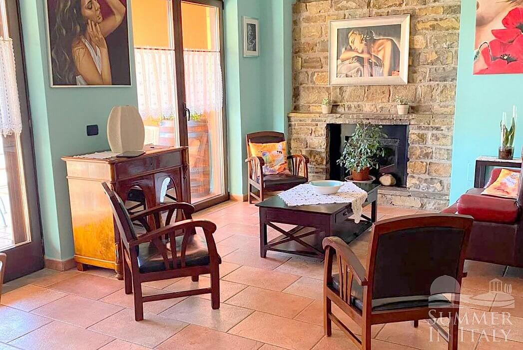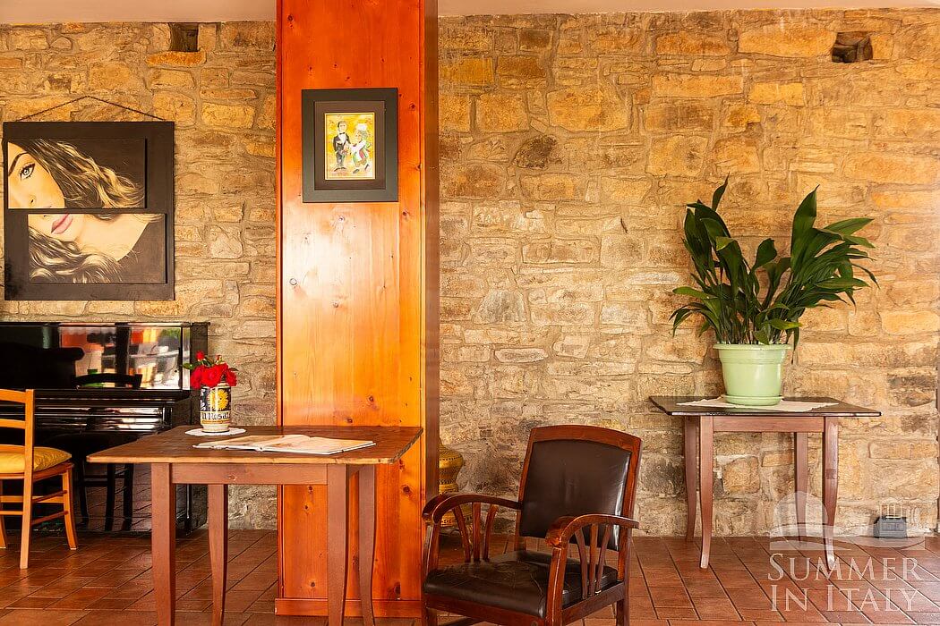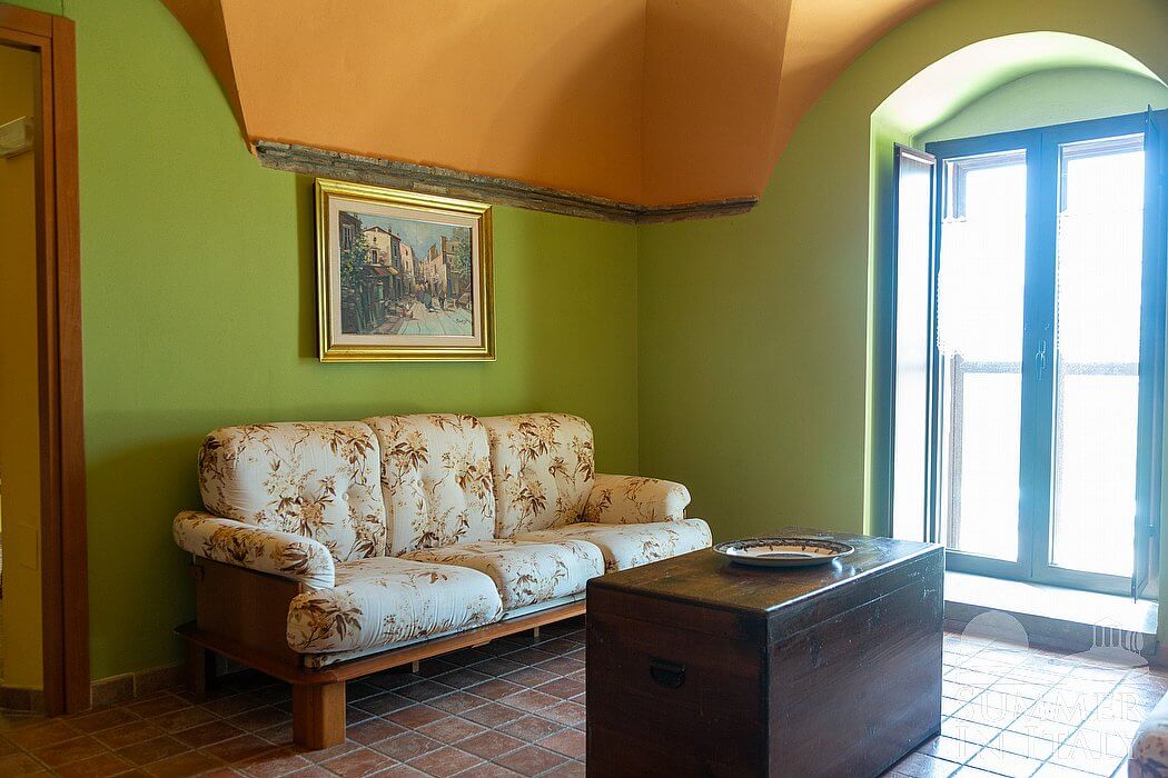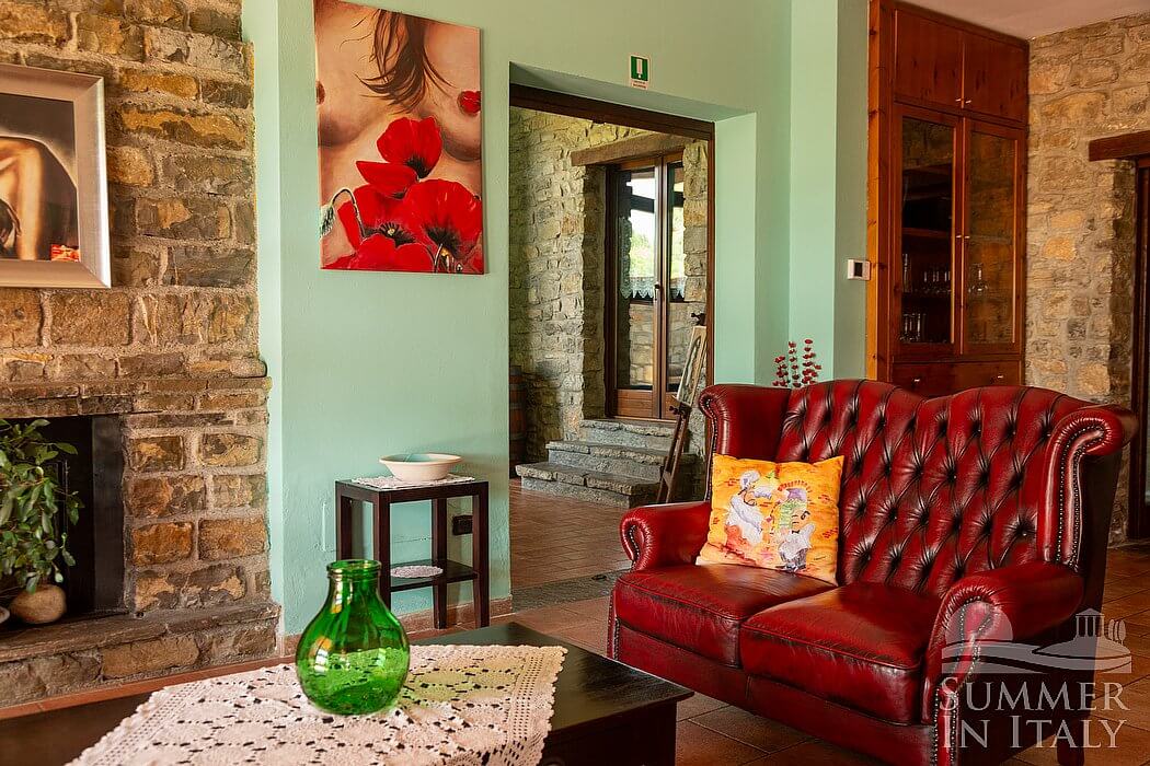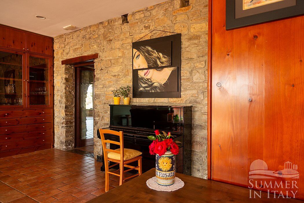 The first living room is paved with terracotta tiles. The furnishings are warm and welcoming, and include a sofa and armchairs. In this room you will find an upright piano (please contact us before making your reservation if you plan to use the piano, as we need to make sure that it is in working order). There is a small fireplace made of stone, for decorative purposes only. Here you will find a game table. From the living room you will be able to enter the patio through four French doors.