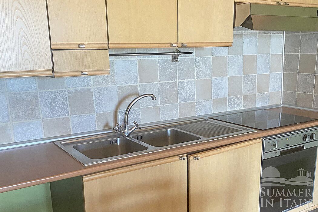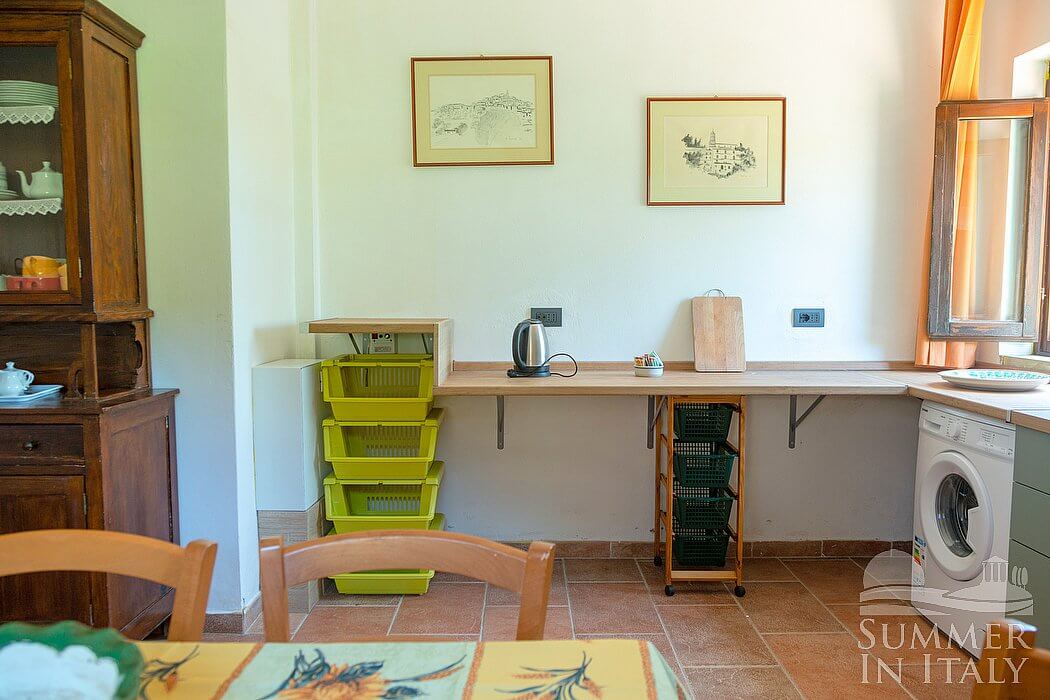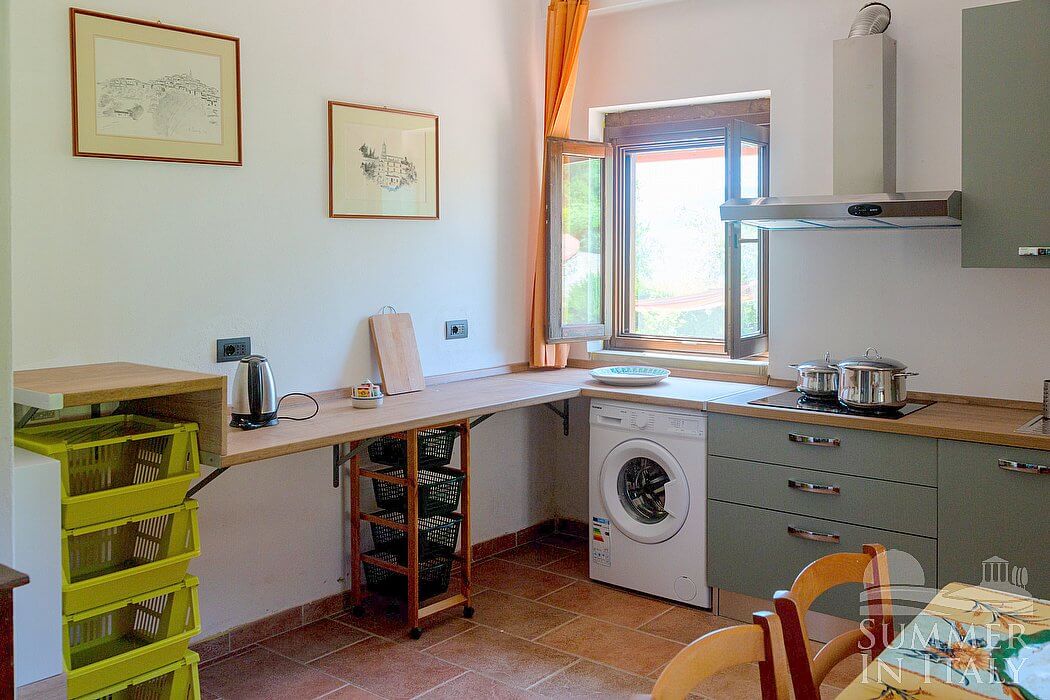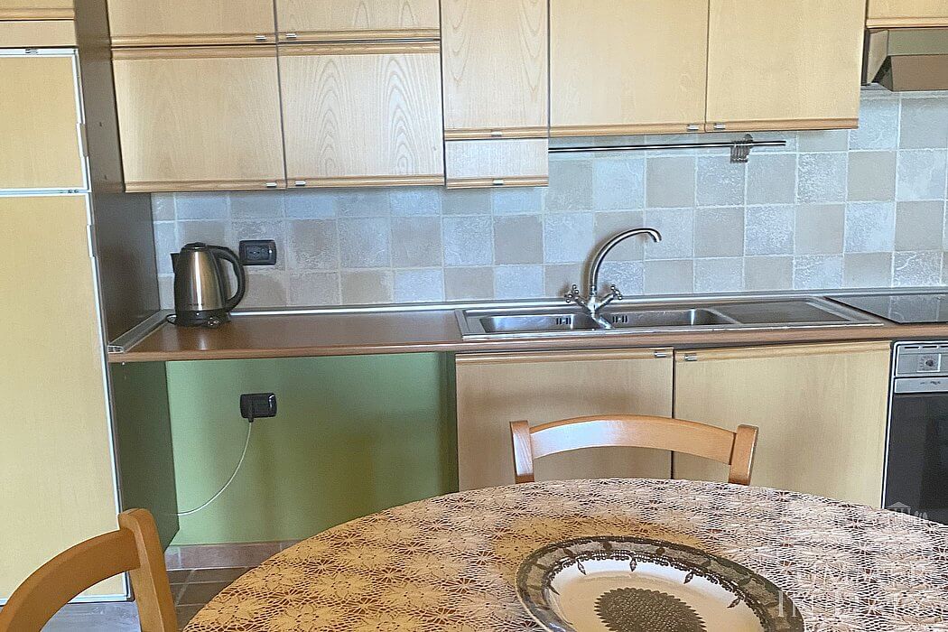 You will be able to enter the first kitchen from the living room through an access area. It is equipped with a four-burner electric cooker, an electric oven, a refrigerator with freezer, a dishwasher, a microwave oven, an Italian-style coffee-maker, an American-style coffee-maker and a kettle. Here you will also find a washing machine, an iron and an ironing board. The dining table can accommodate six guests. The kitchen has two windows.