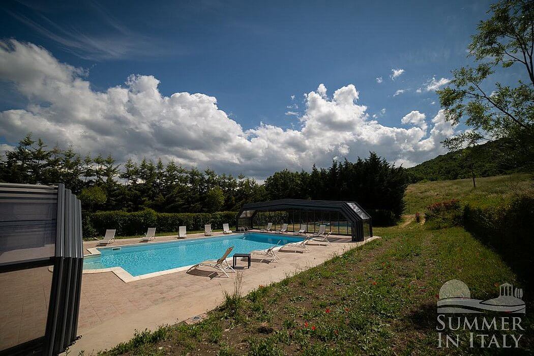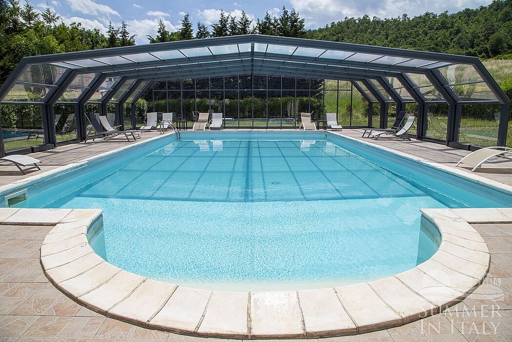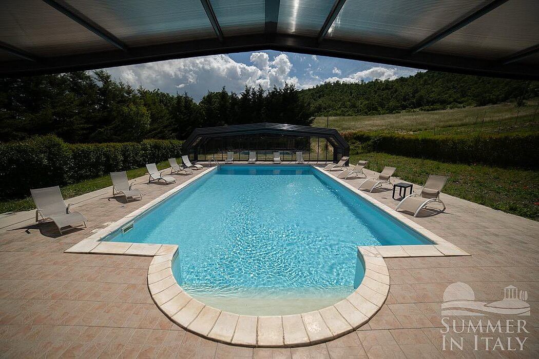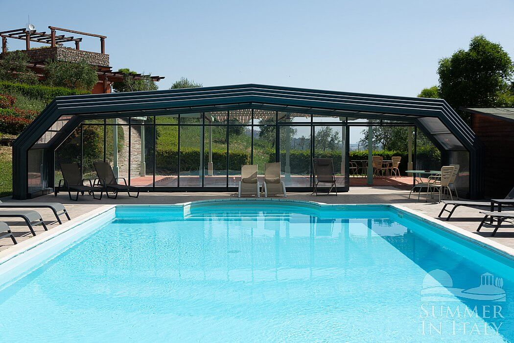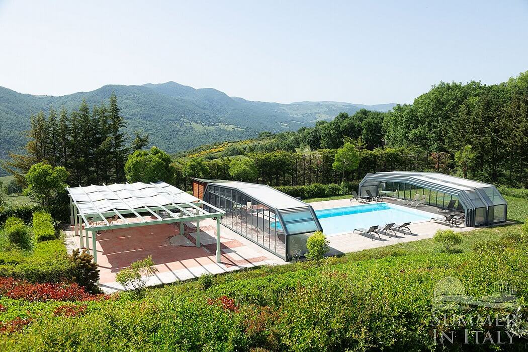 The swimming pool is 6 meters (20 feet) large by 14 meters (46 feet) long, 1.5 meters (5 feet) deep. The area is equipped with tables, chairs and sun loungers, and it is partly shaded by a wood roof and by awnings. From the swimming pool you will enjoy a broad view of the valley and of the greenery. The pool is open from mid-May until mid-October.