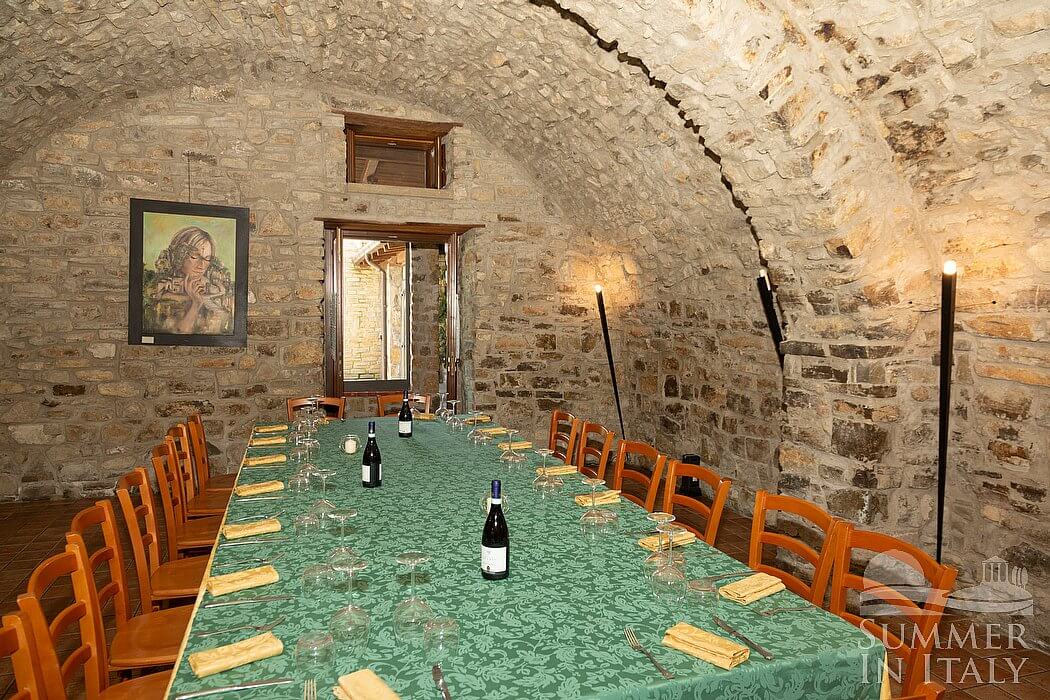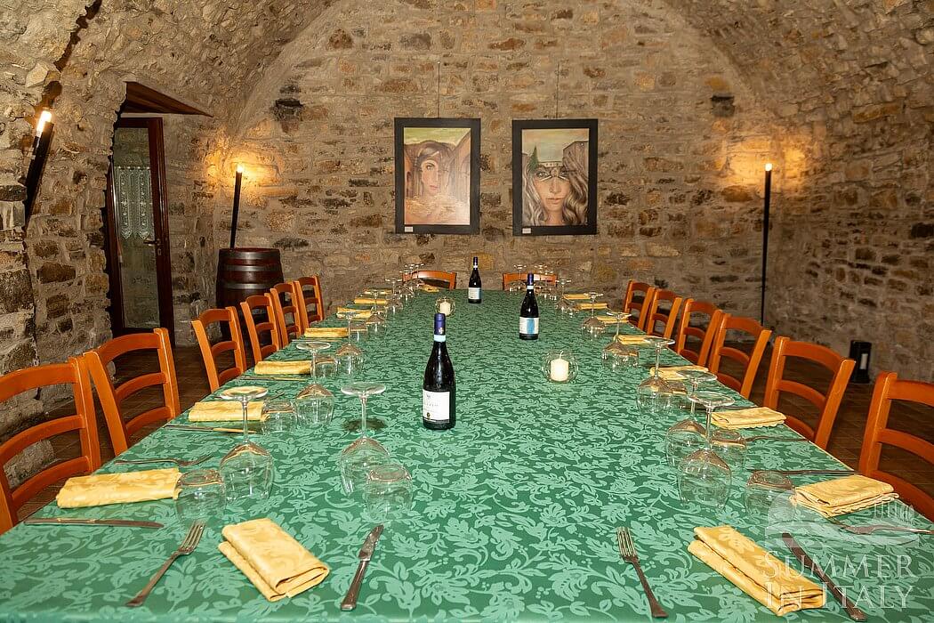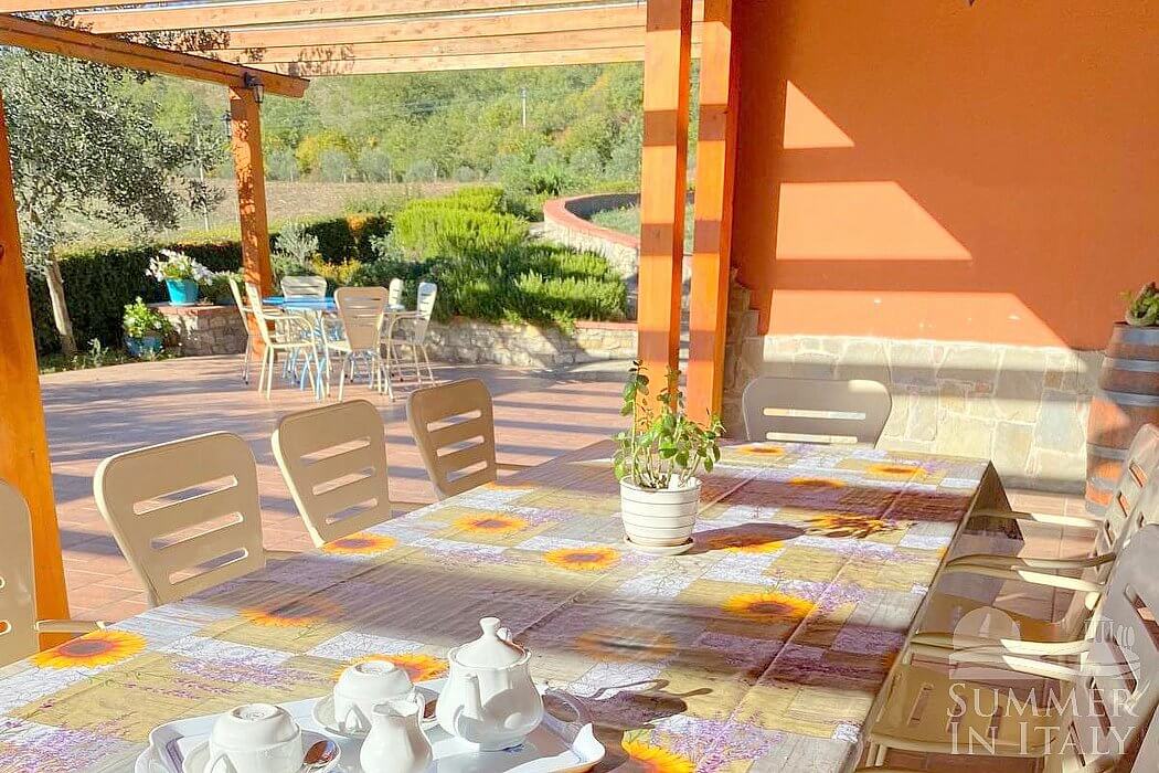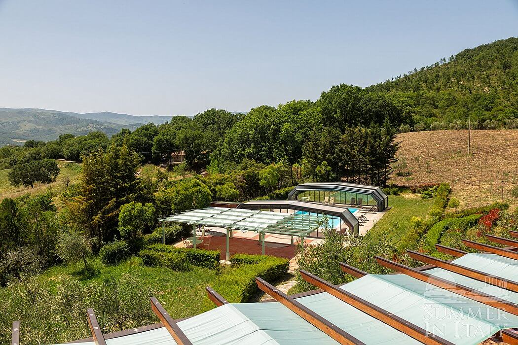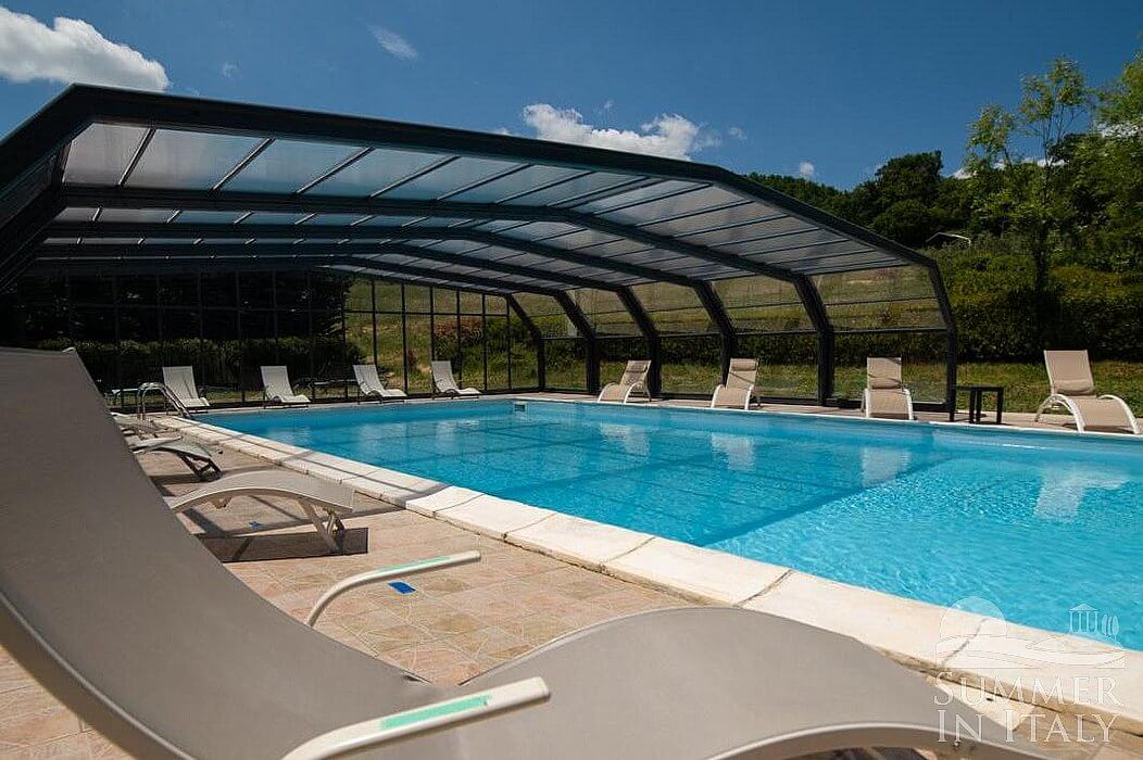 The swimming pool is 6 meters (20 feet) large by 14 meters (46 feet) long, 1.5 meters (5 feet) deep. The area is equipped with tables, chairs and sun loungers, and it is partly shaded by a wood roof and by awnings. From the swimming pool you will enjoy a broad view of the valley and of the greenery. The pool is open from mid-May until mid-October.