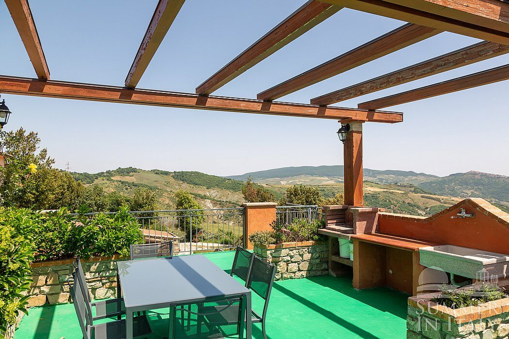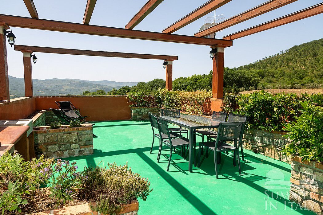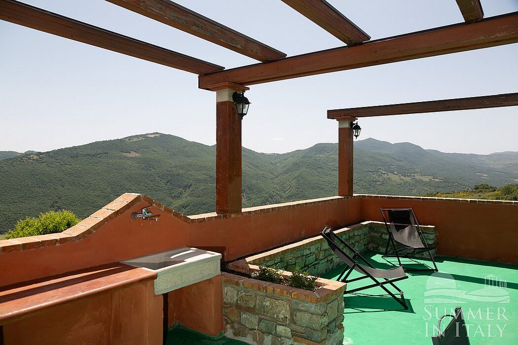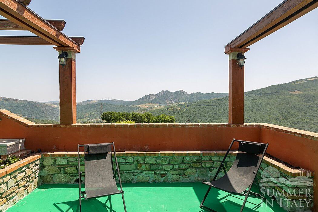 The terrace is 60 square meters (645 square feet) large. You will reach it going up an external stairway which consists of approximately 26 steps. It is partly shaded by a wood roof and by awnings. It is equipped with a table, chairs and two deck chairs. Here you will also find a brickwork barbecue. From the terrace you will enjoy a fascinating view of the greenery and of the Dolomiti Lucane mountains.