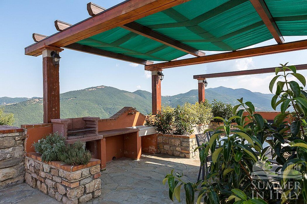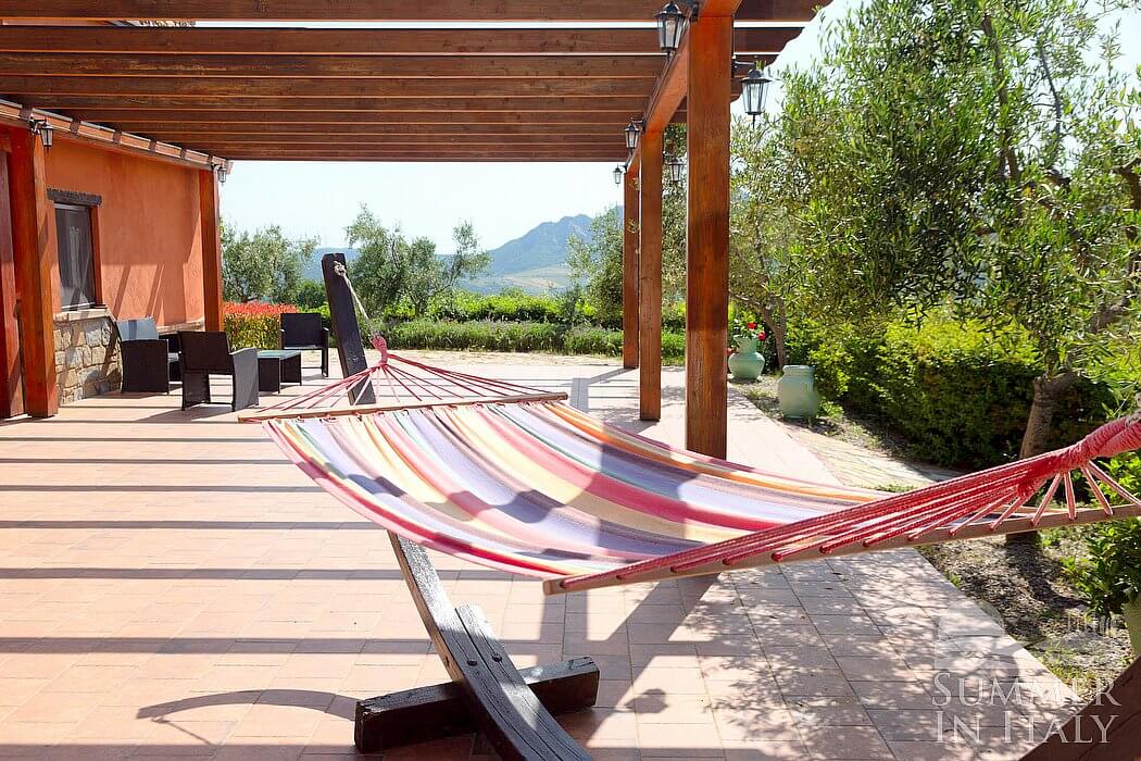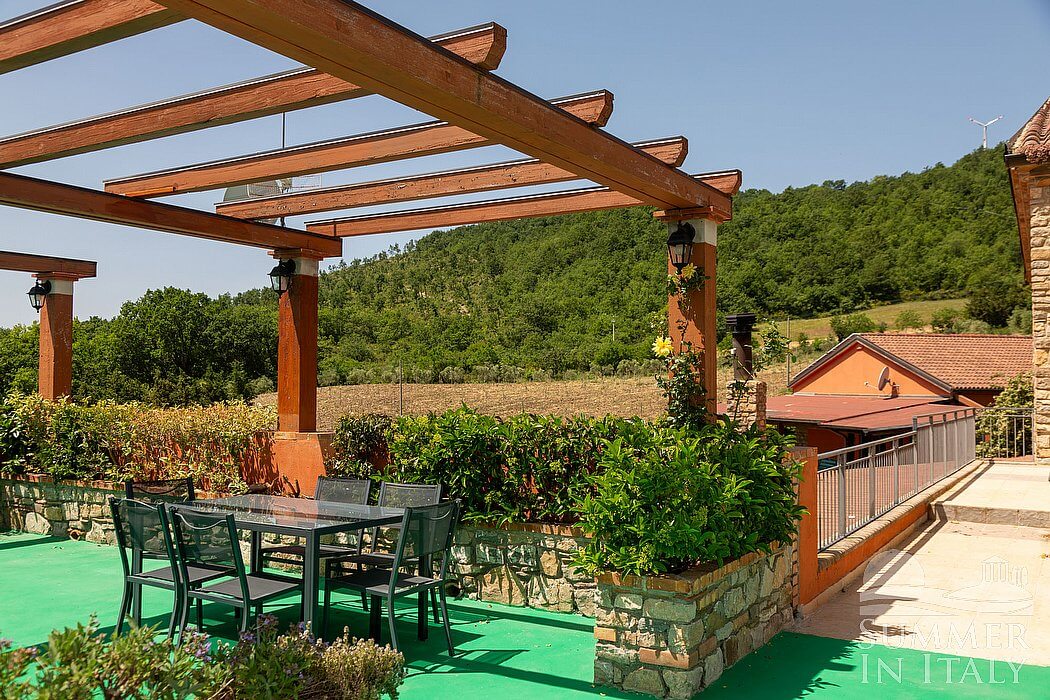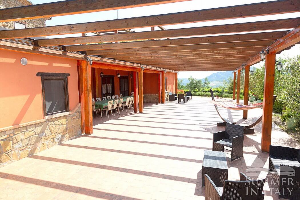 The first patio is 140 square meters (1500 square feet) large. It is partly shaded by a wood roof and by awnings. It is equipped with small sofas and armchairs and with tables, chairs and an hammock. Here you will also find a portable barbecue. From the patio you will enjoy a broad view of the greenery and of the Dolomiti Lucane mountains.