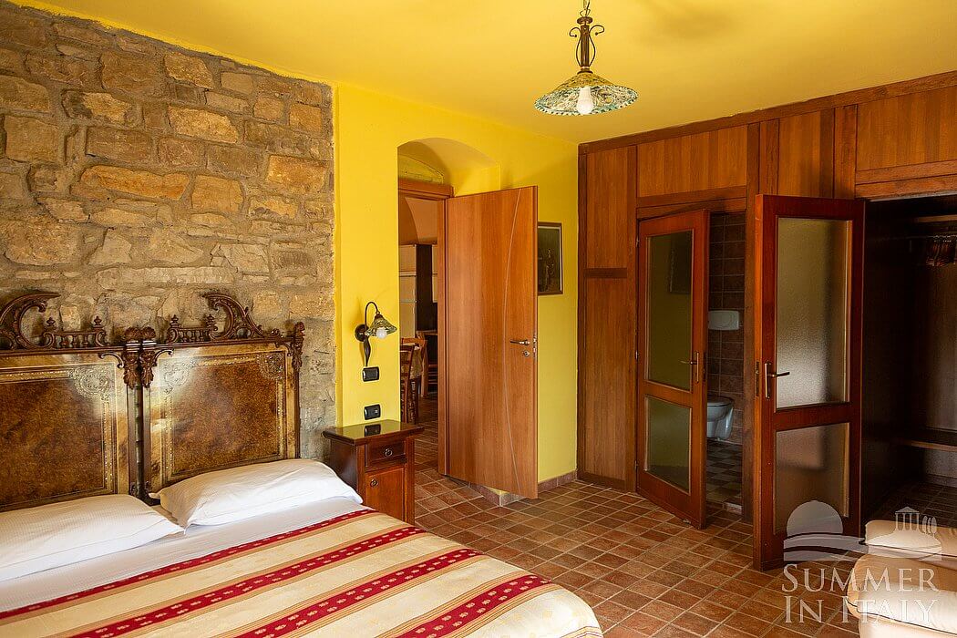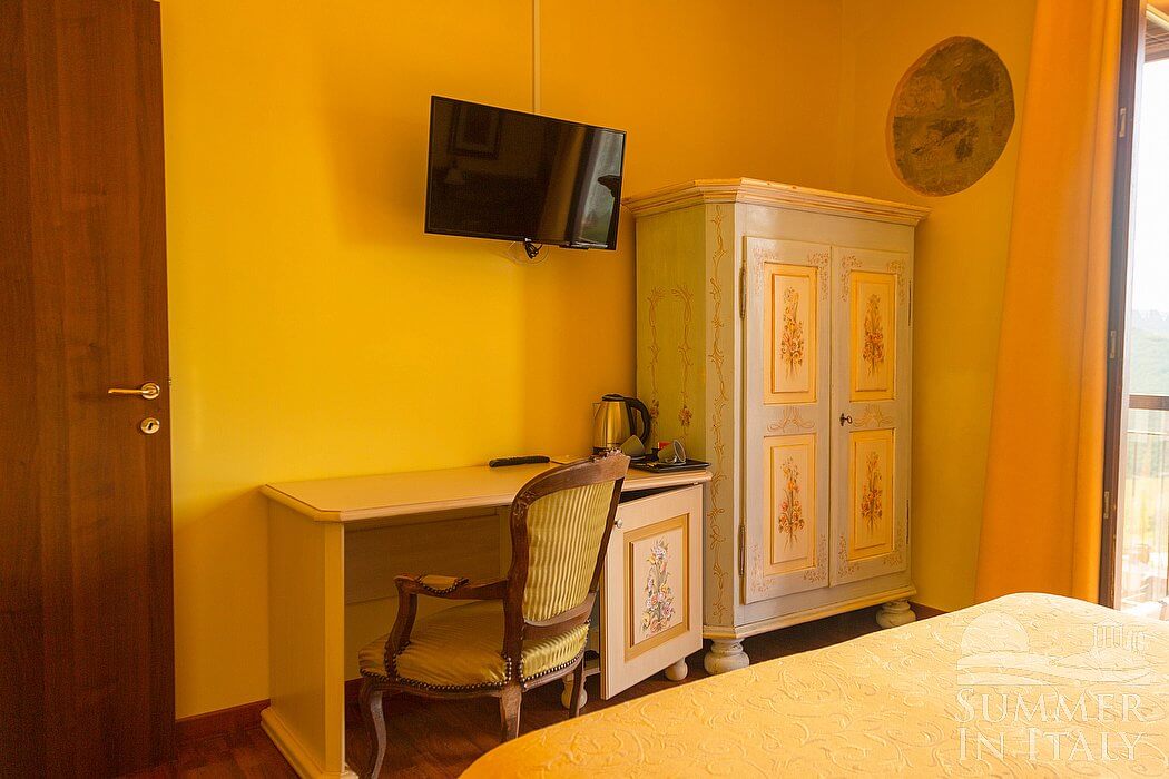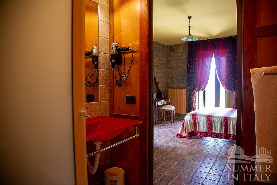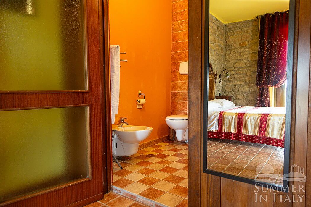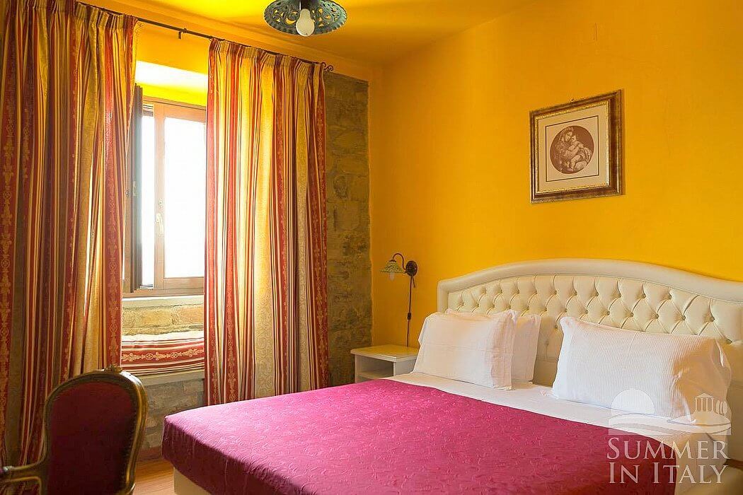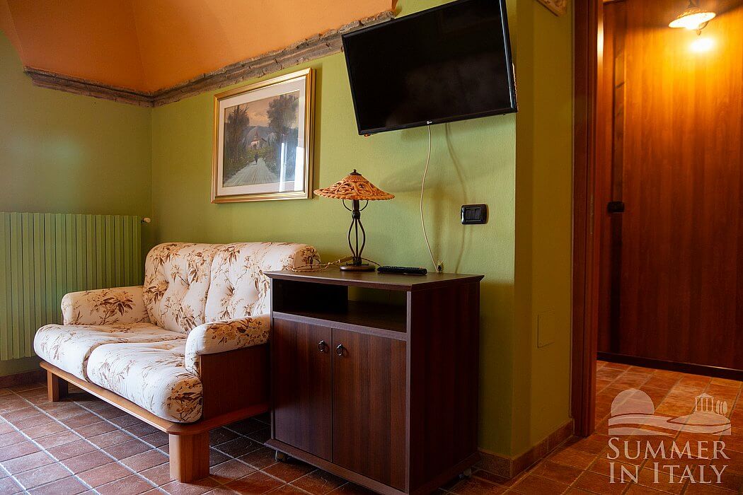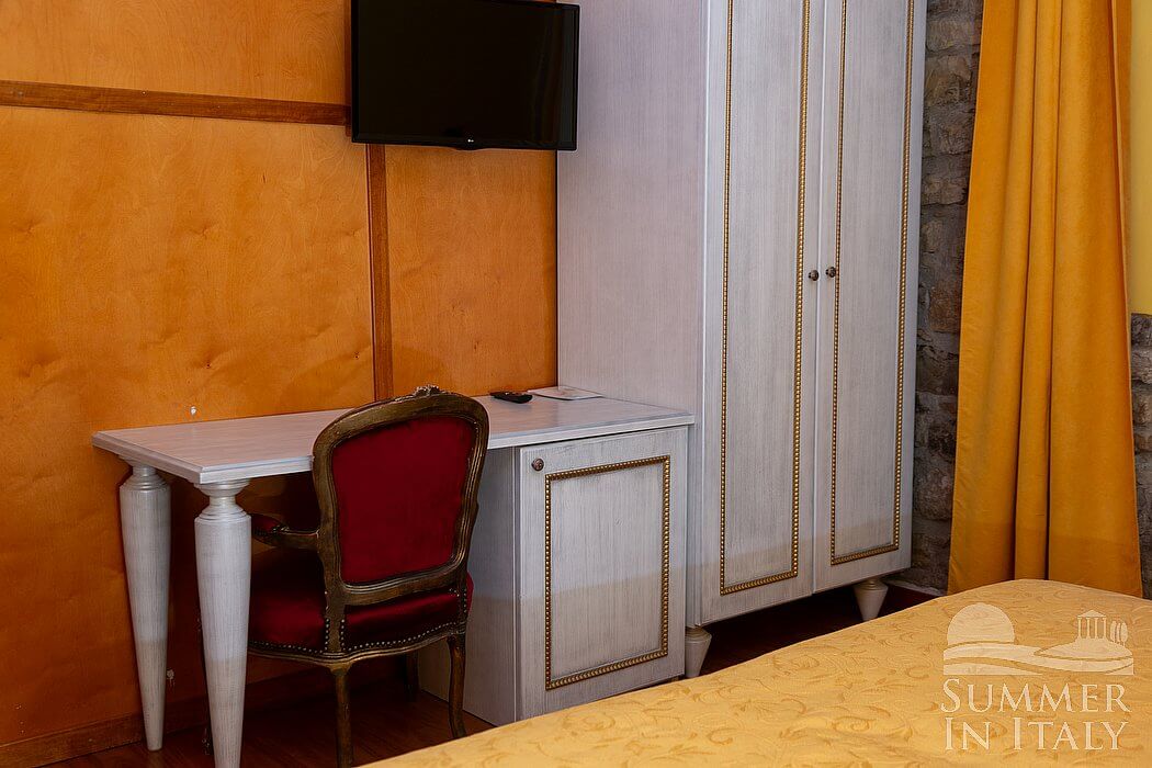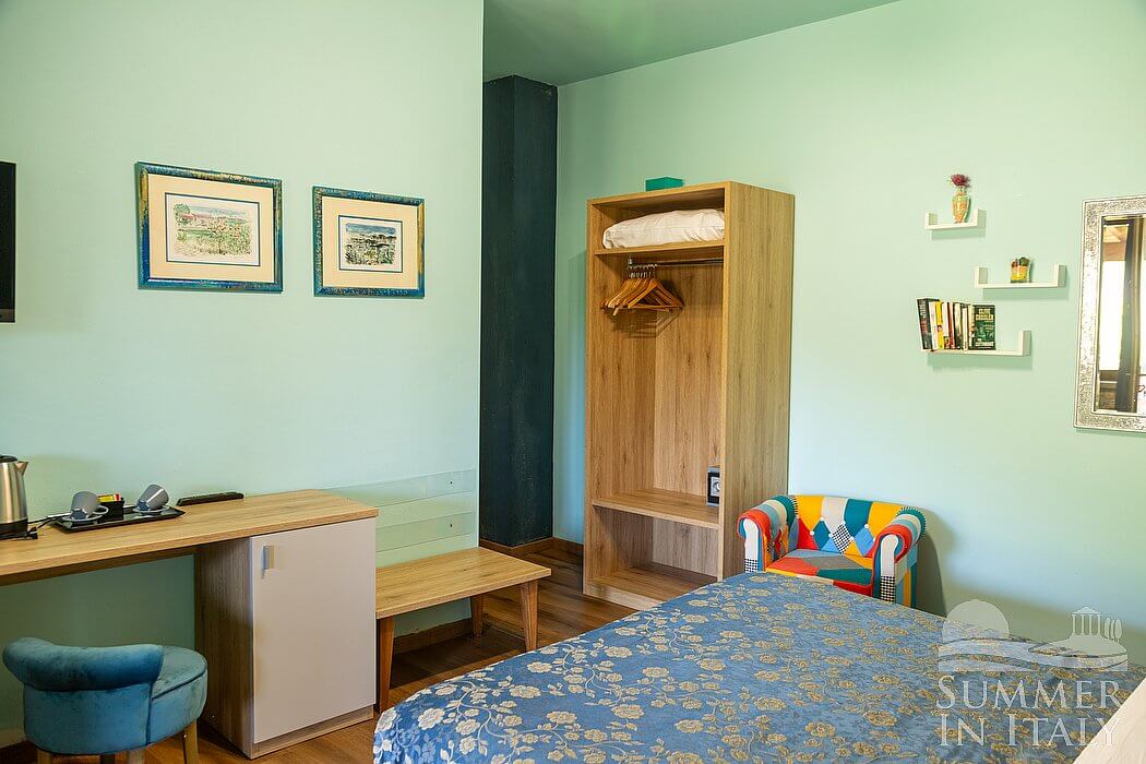 This suite is made up by three interconnected rooms: a sleeping area, a sitting area and a bathroom. You will be able to enter the fourth bedroom through an external access. The bedroom has a matrimonial bed (160 cm/63 inches, wider than a queen-size bed), that can be split into twins if requested (please contact our staff in advance to make arrangements). The furnishings include a sofa, a bedroom chair and a desk. In this room you will find a satellite television (local channels). The room has a window, and it's equipped with an air conditioning/heating unit. This bedroom has an en-suite bathroom, equipped with a washbasin, a toilet, a fully enclosed shower and a hairdryer.