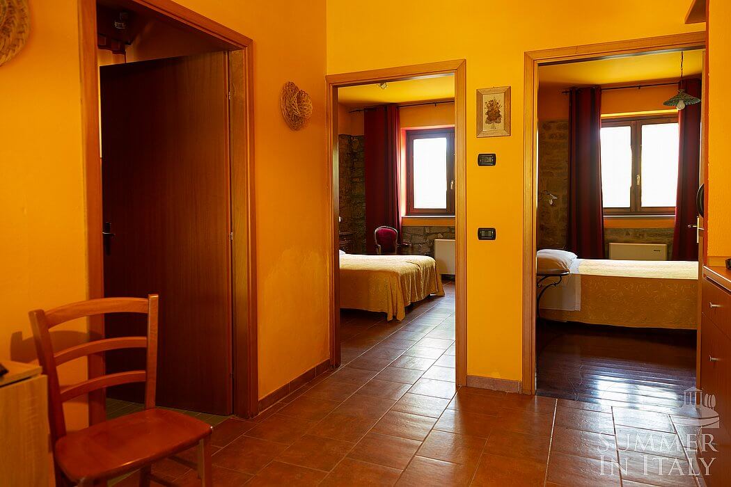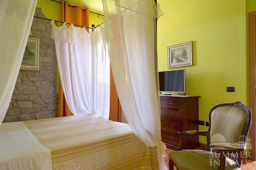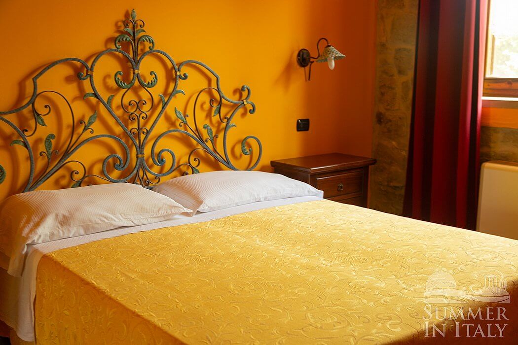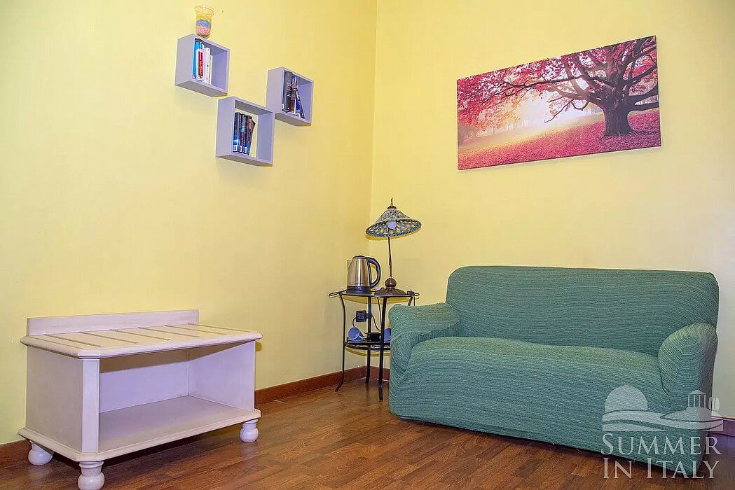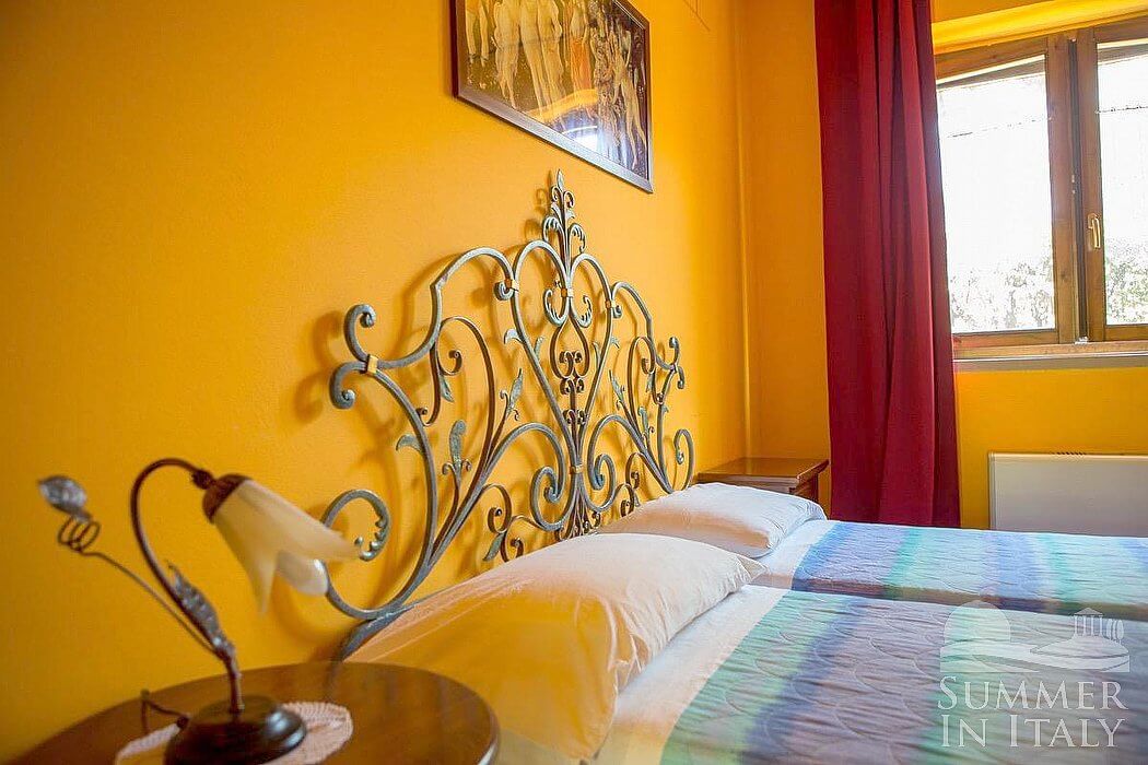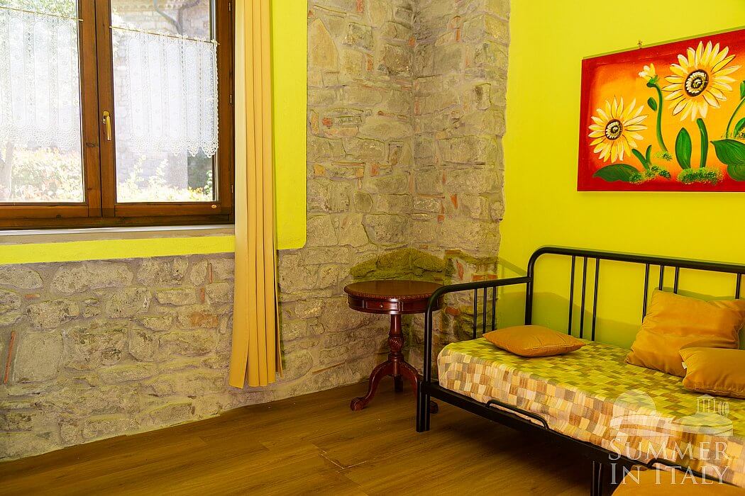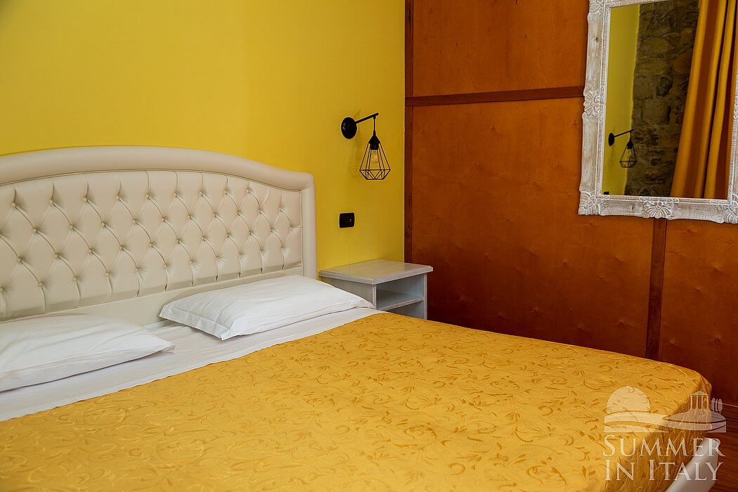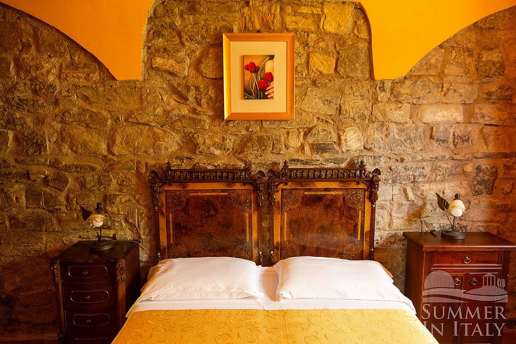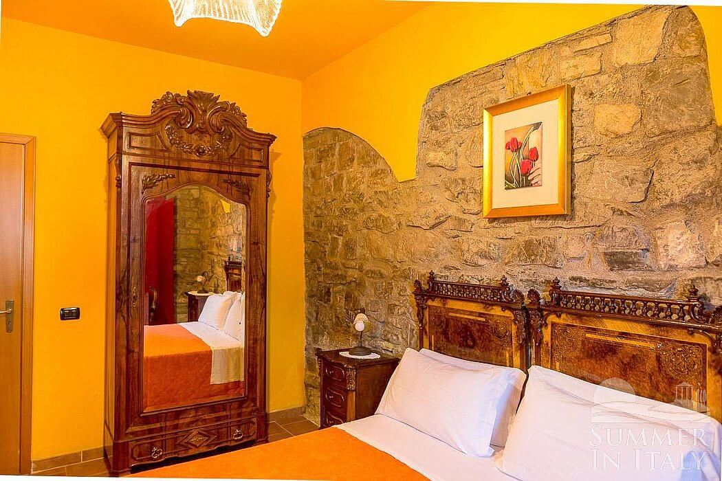 This suite is made up by three interconnected rooms: a sleeping area, a sitting area and a bathroom. You will be able to enter the fourth bedroom through an external access. The bedroom has a matrimonial bed (160 cm/63 inches, wider than a queen-size bed), that can be split into twins if requested (please contact our staff in advance to make arrangements). The furnishings include a sofa, a bedroom chair and a desk. In this room you will find a satellite television (local channels). The room has a window, and it's equipped with an air conditioning/heating unit. This bedroom has an en-suite bathroom, equipped with a washbasin, a toilet, a fully enclosed shower and a hairdryer.