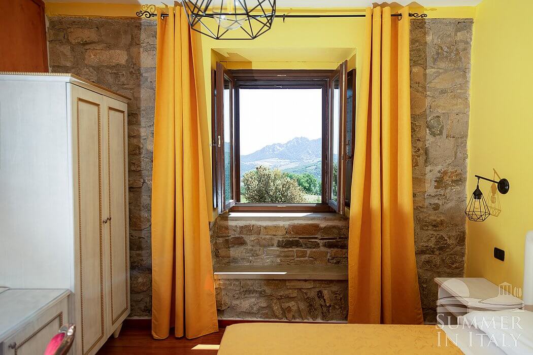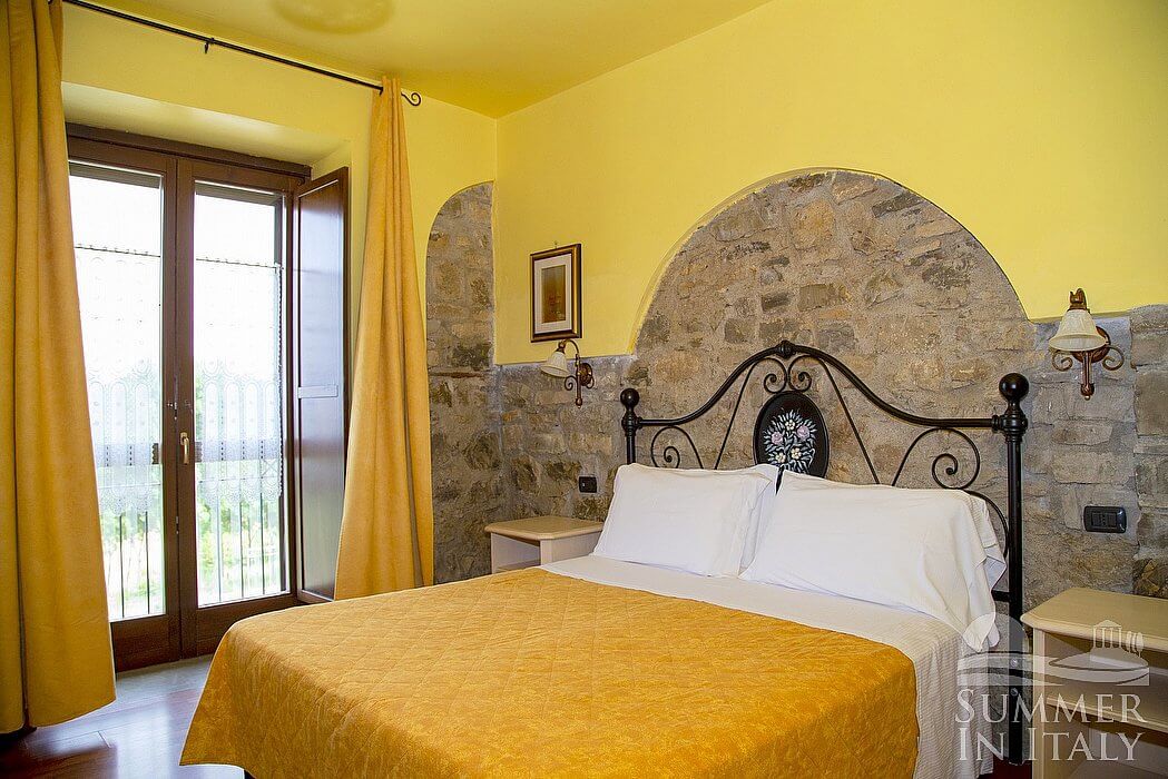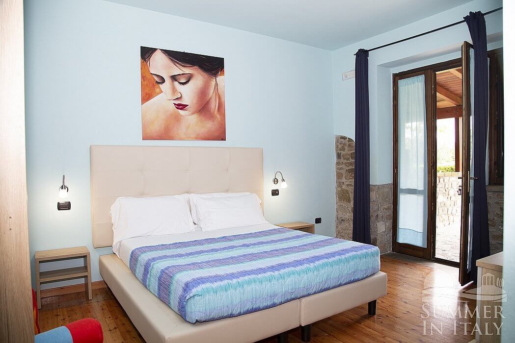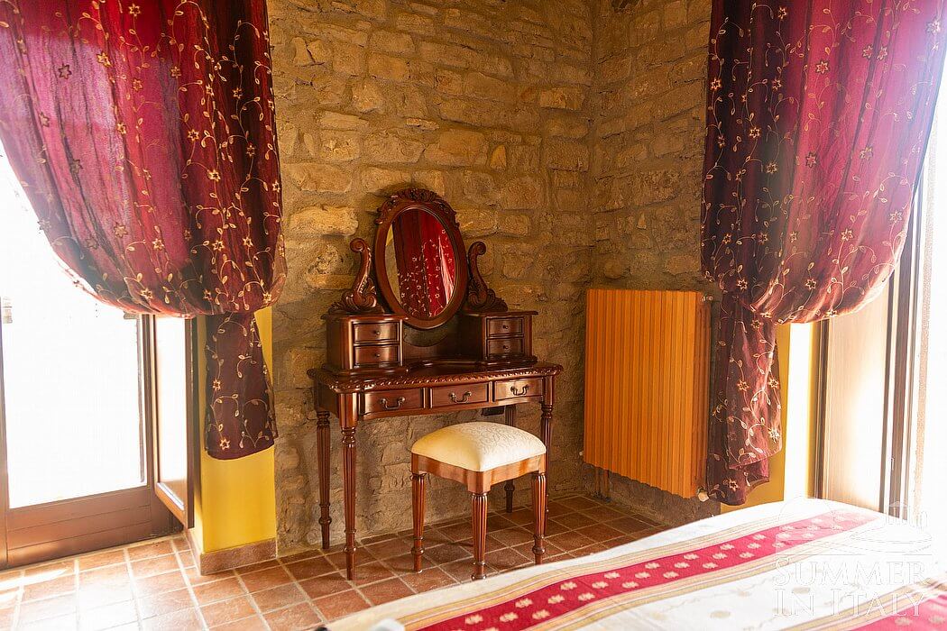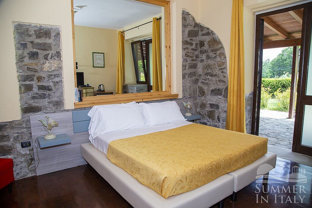 This suite is made up by three interconnected rooms: a sleeping area, a sitting area and a bathroom. You will be able to enter the ninth bedroom from the patio through an external access. The floor is paved with wood. The room has a matrimonial bed (160 cm/63 inches, wider than a queen-size bed). The furnishings include a sofa and two bedroom chairs. In this room you will find a satellite television (local channels). The room has two windows, and it's equipped with an air conditioning/heating unit. This bedroom has an en-suite bathroom, equipped with a washbasin, a toilet, a fully enclosed shower and a hairdryer.