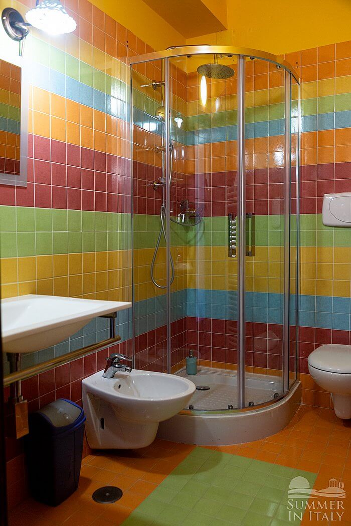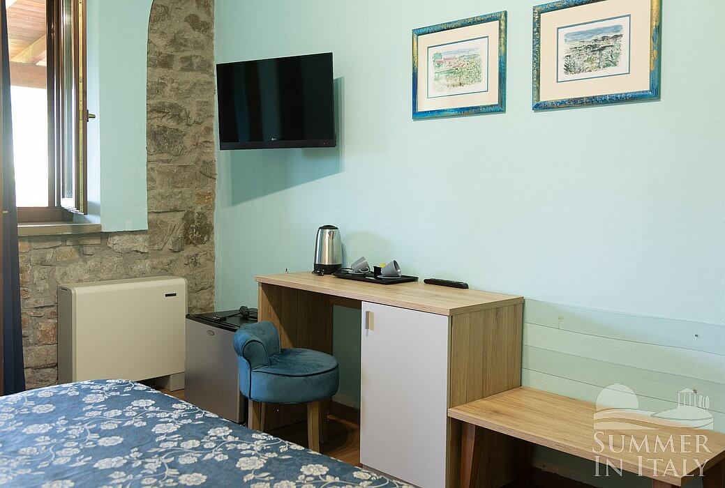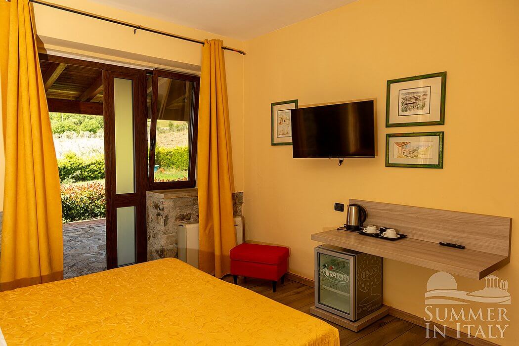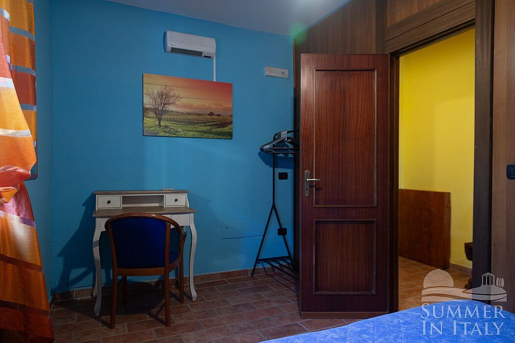 You will be able to enter the eighth bedroom from the patio through an external access. The floor is paved with wood. The room has a matrimonial bed (160 cm/63 inches, wider than a queen-size bed), that can be split into twins if requested (please contact our staff in advance to make arrangements). The furnishings include a bedroom chair and a desk. In this room you will find a satellite television (local channels). The room has a window, and it's equipped with an air conditioning/heating unit, and you will also find a mini refrigerator. This bedroom has an en-suite bathroom, equipped with a washbasin, a toilet, a fully enclosed shower and a hairdryer.