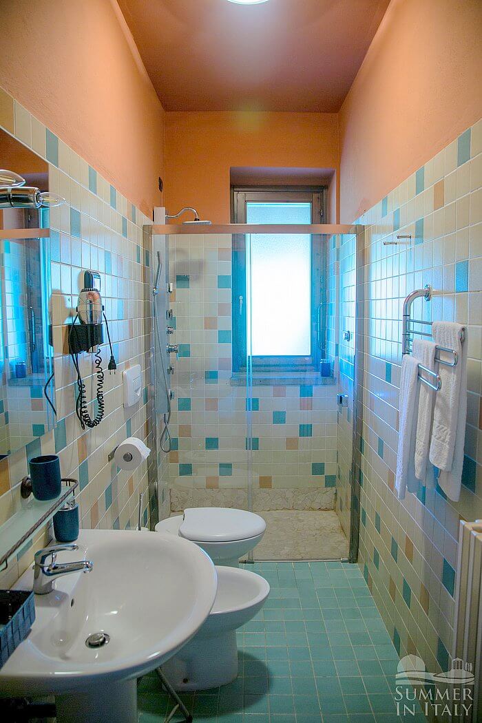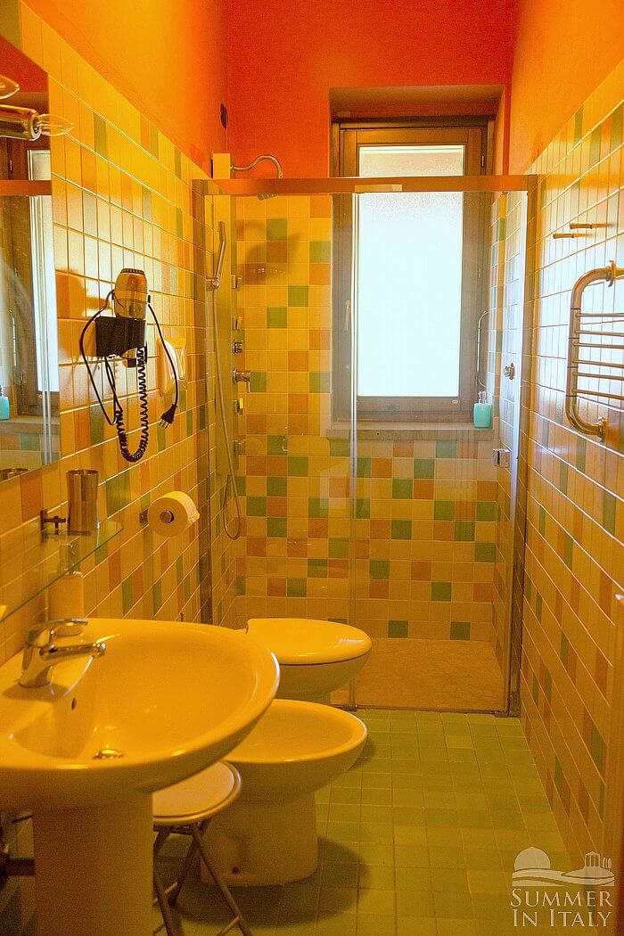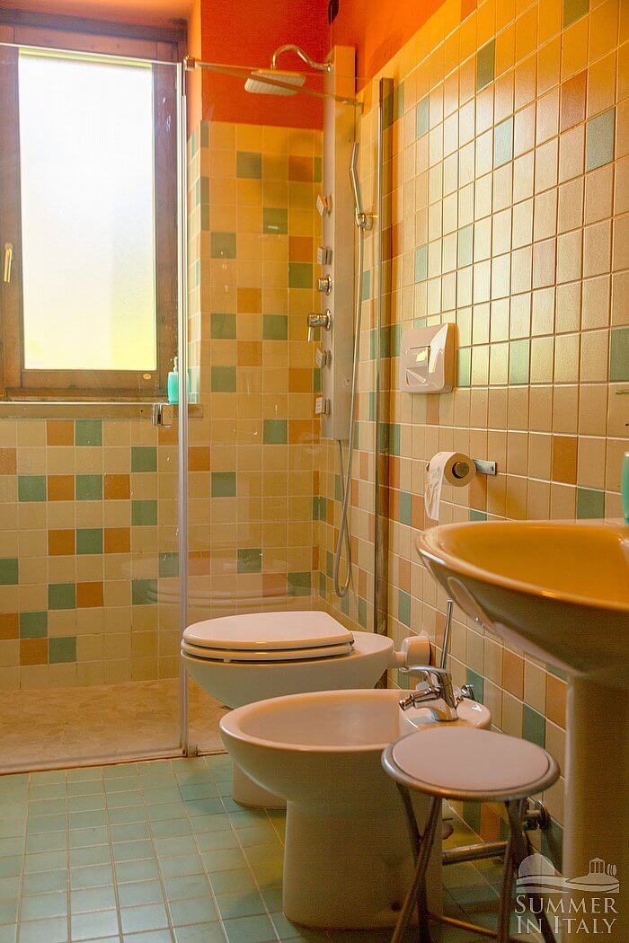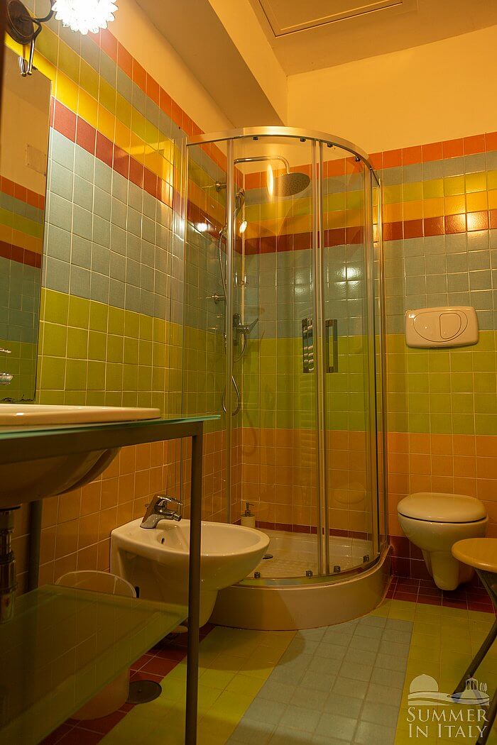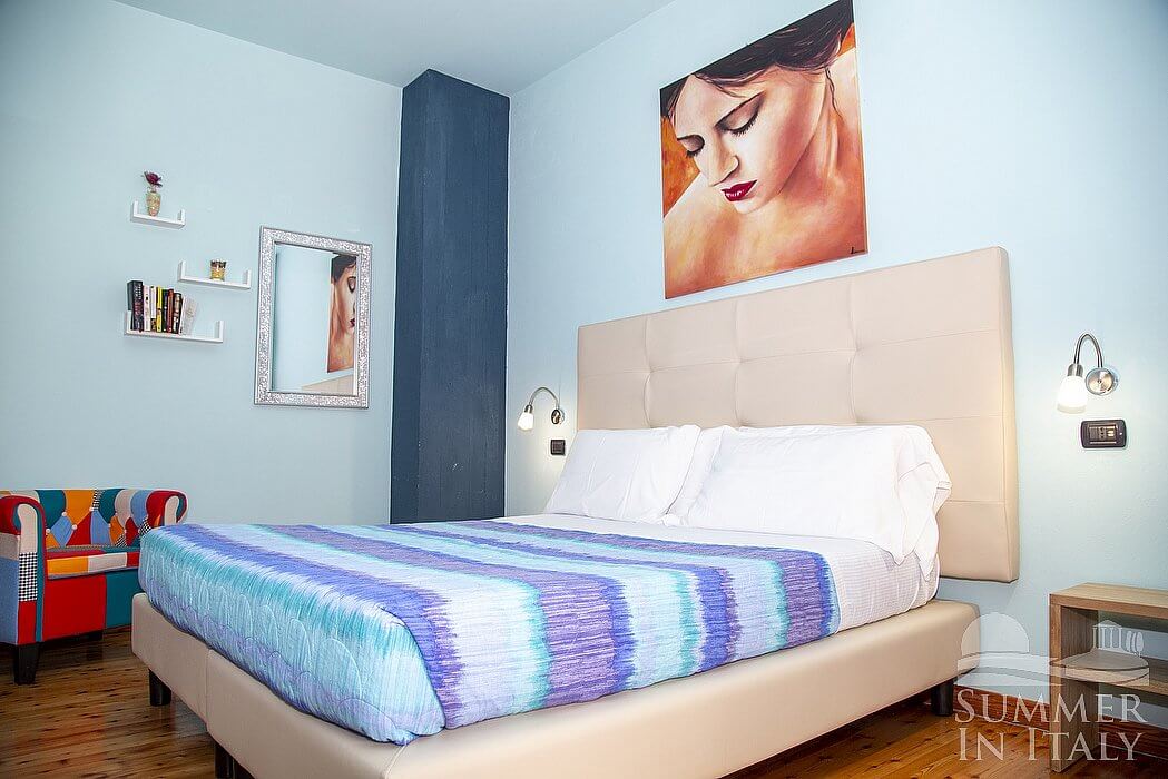 You will be able to enter the first bedroom from the living room. The bedroom has a matrimonial bed (160 cm/63 inches, wider than a queen-size bed), that can be split into twins if requested (please contact our staff in advance to make arrangements). The furnishings include an armchair. From the bedroom you will be able to enter the terrace through a French door. The room also has a Juliet balcony, and it's equipped with an air conditioning/heating unit. This bedroom has an en-suite bathroom, equipped with a washbasin, a toilet, a fully enclosed shower and a hairdryer. You will be able to enter the bathroom climbing one step.