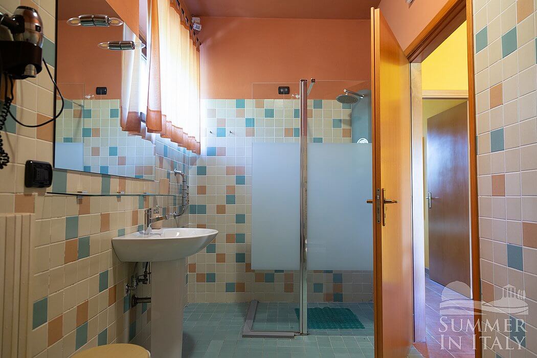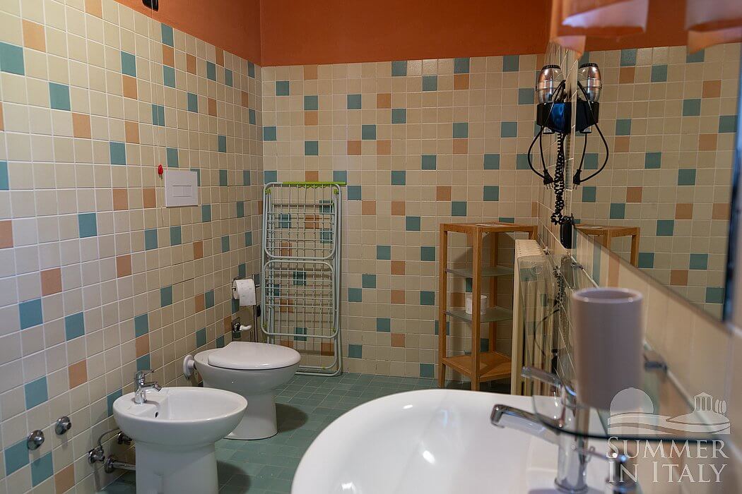 You will be able to enter the seventh bedroom from the patio through an external access. The floor is paved with wood. The room has a matrimonial bed (160 cm/63 inches, wider than a queen-size bed), that can be split into twins if requested (please contact our staff in advance to make arrangements). The furnishings include. In this room you will find a satellite television (local channels). The room has a window, and it's equipped with an air conditioning/heating unit, and you will also find a mini refrigerator. This bedroom has an en-suite bathroom, equipped with a washbasin, a toilet, a fully enclosed shower and a hairdryer.