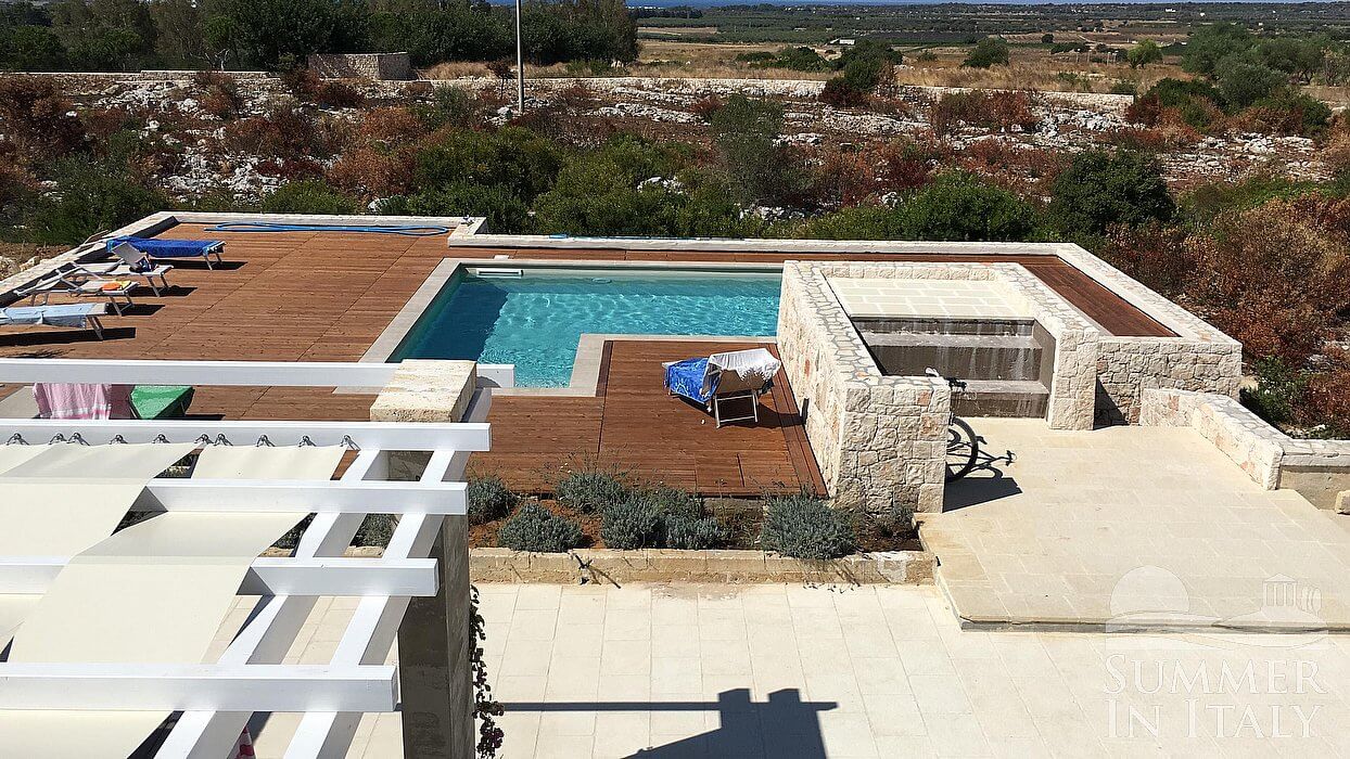 The swimming pool is 5 meters (16 feet) large by 11 meters (36 feet) long, from 1.50 meter (5 feet) to 1.70 meters (5.6 feet) deep. It has a cervical hydromassage shower. The area is equipped with sun loungers and an external shower. The pool is open from the beginning of April until the end of October.