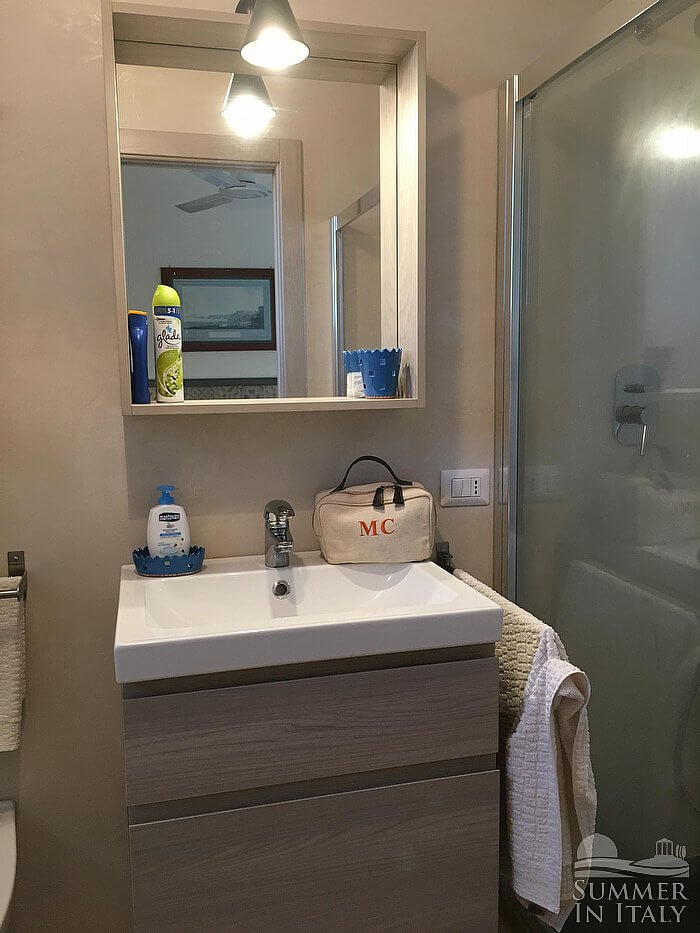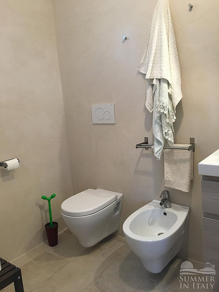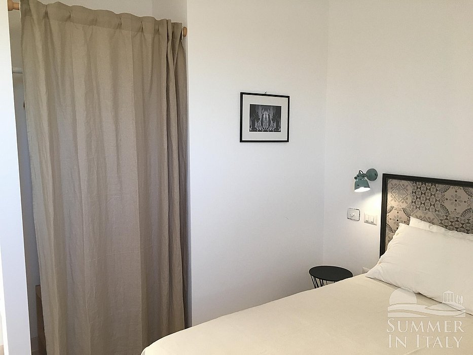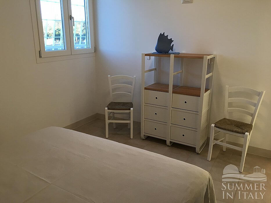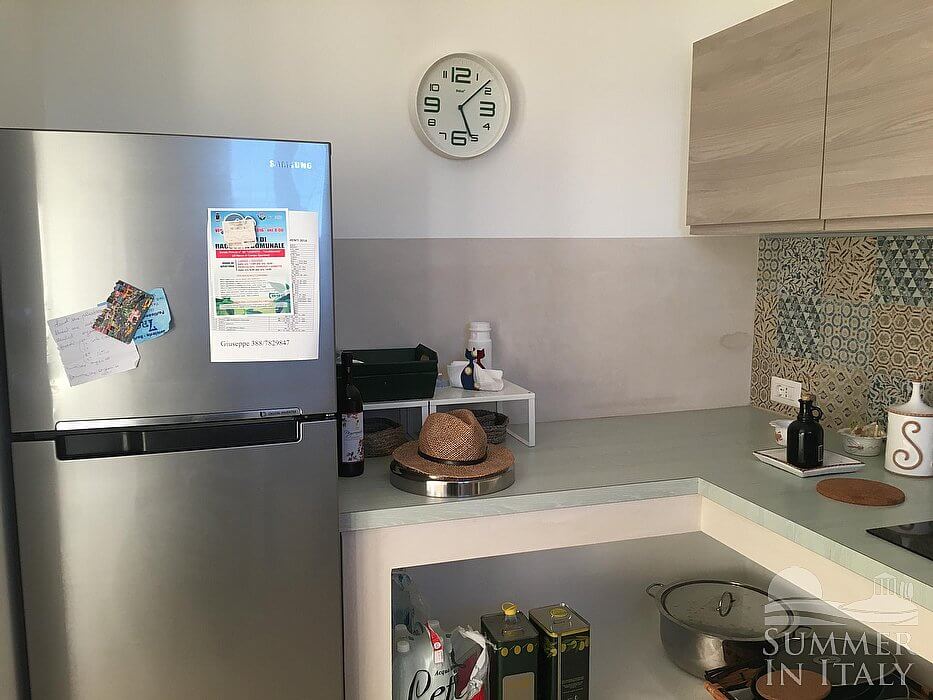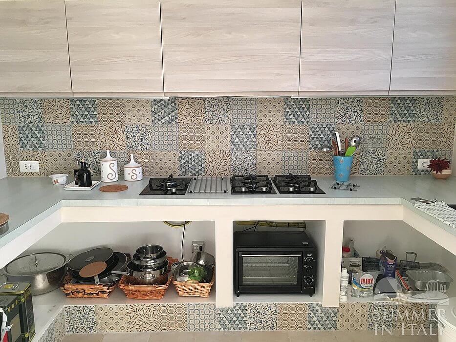 The kitchen is equipped with a five-burner gas cooker, a small electric oven, a refrigerator with freezer, a dishwasher, a microwave oven and an Italian-style coffee-maker. The dining table can accommodate six guests. The kitchen is also equipped with a television (local channels). From the kitchen a French door will take you to the patio.