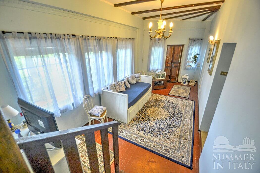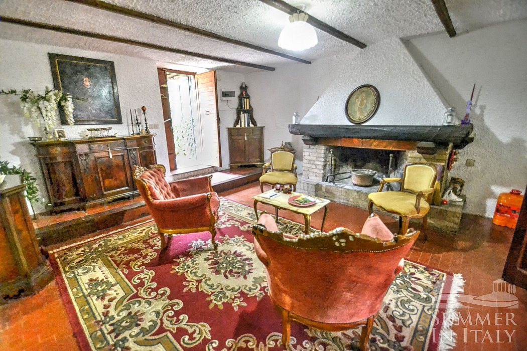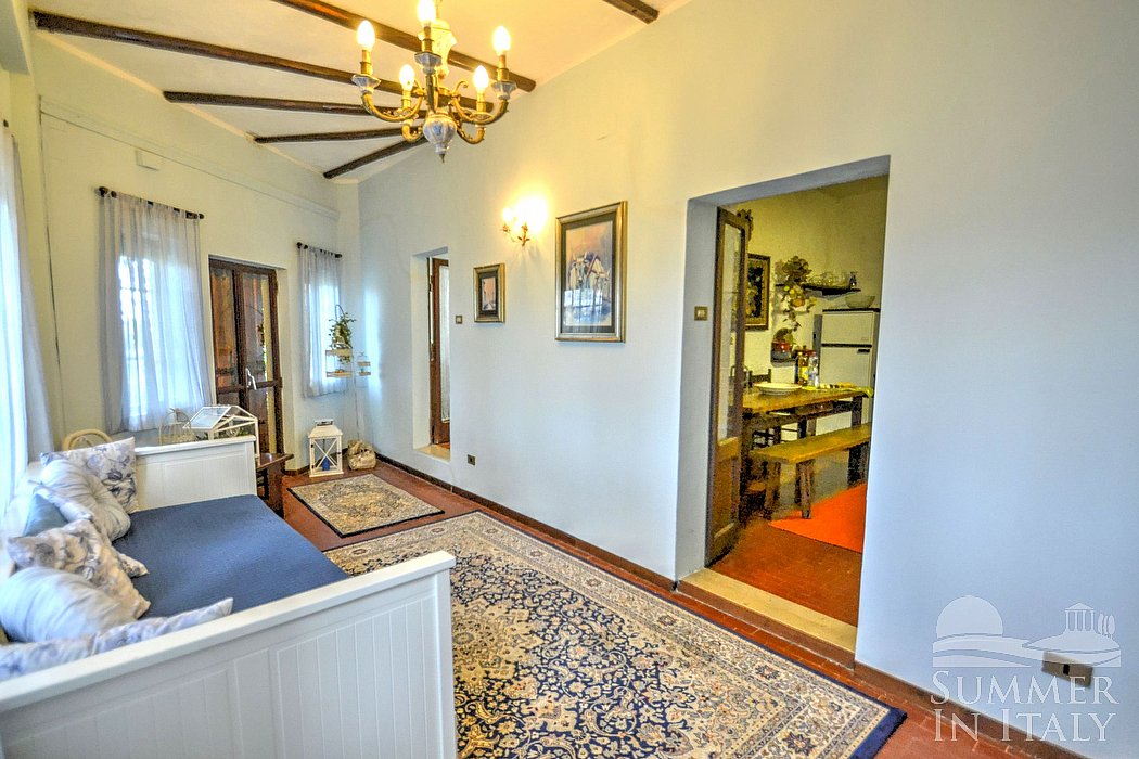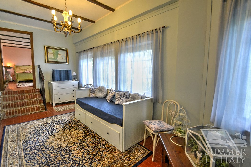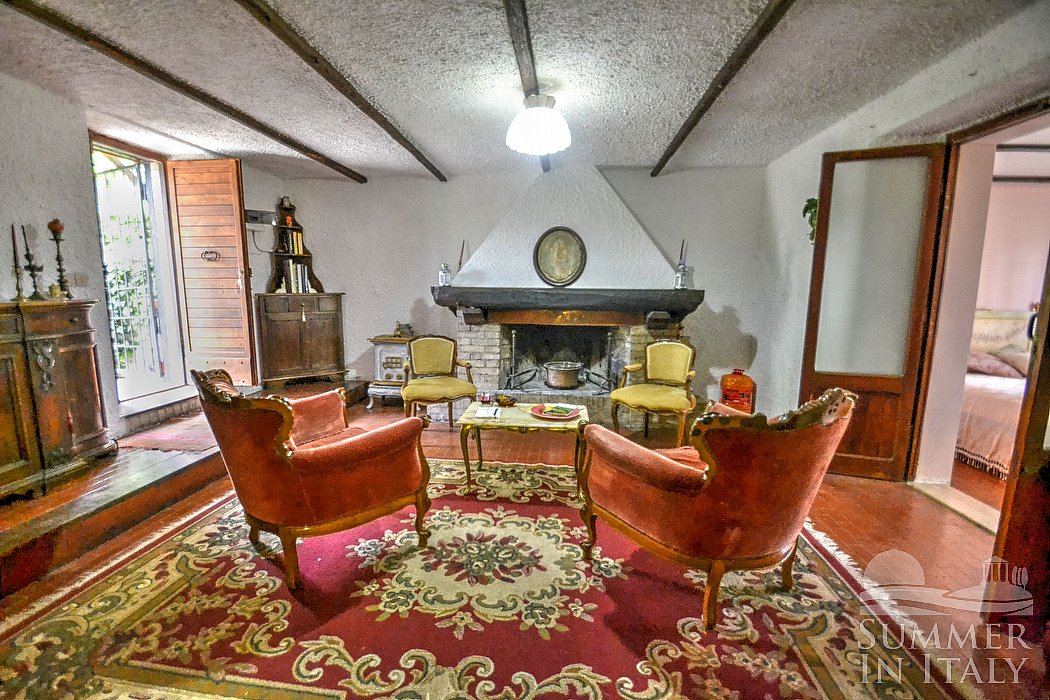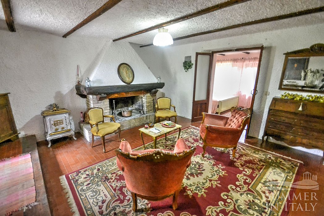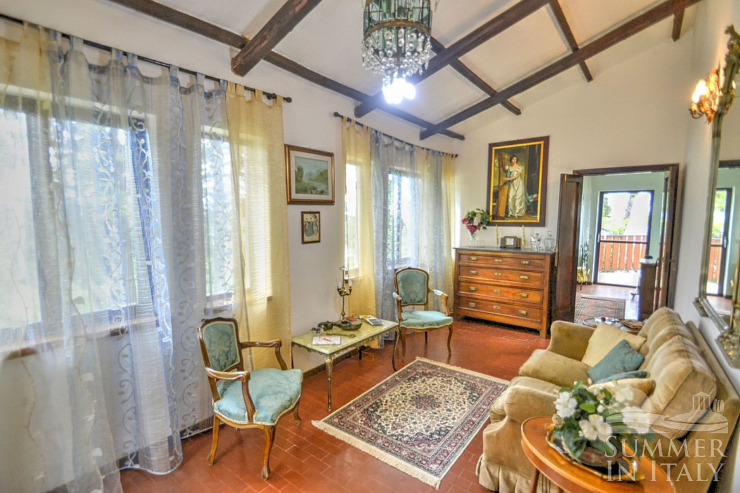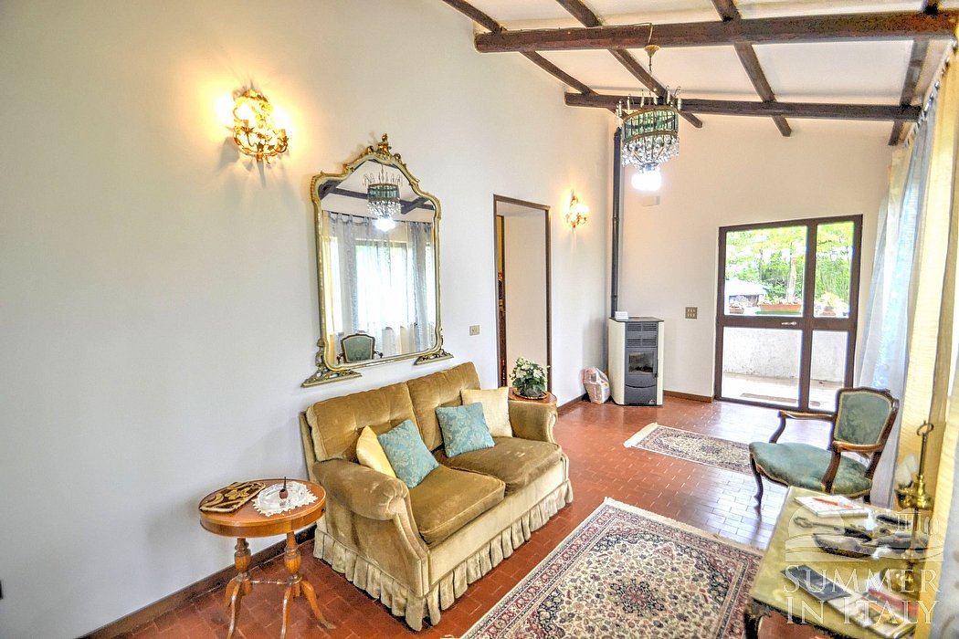 The ceiling of the first living room has characteristic exposed wood beams. The furnishings are classic and welcoming. The furnishings include a sofa. From the living room you will be able to enter the patio through a double-glazed French door. The room also has four windows with a view of the greenery.