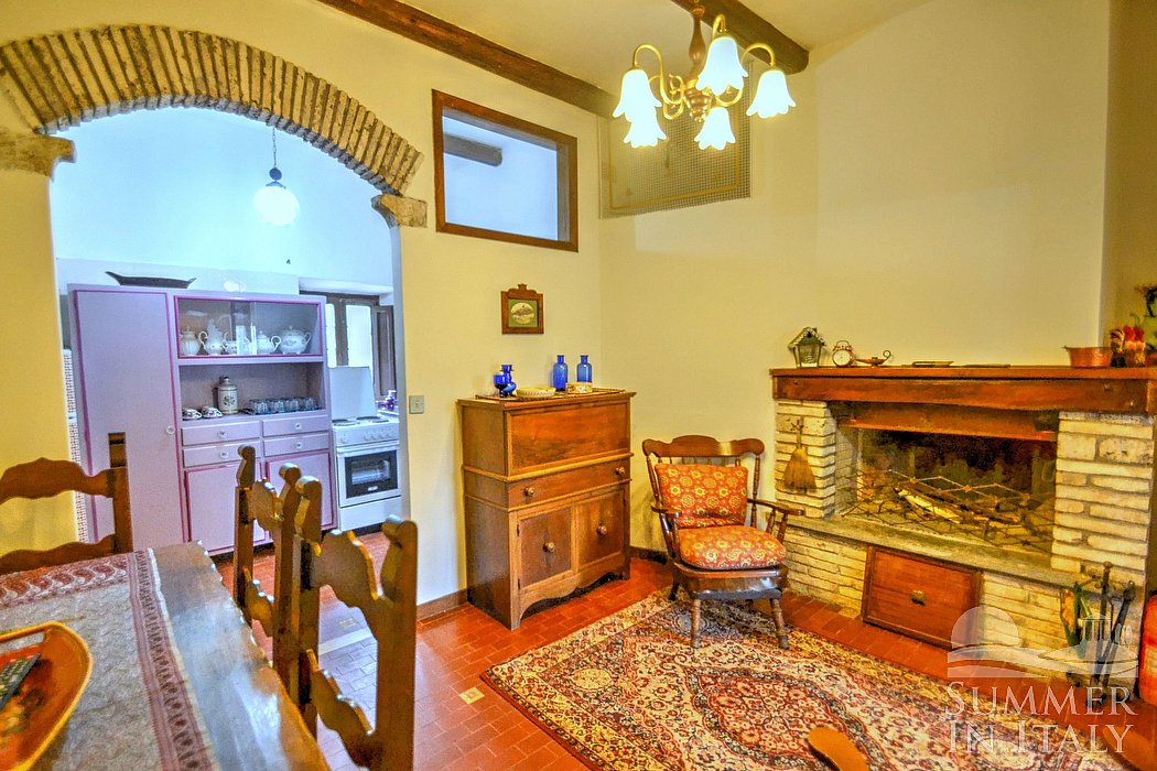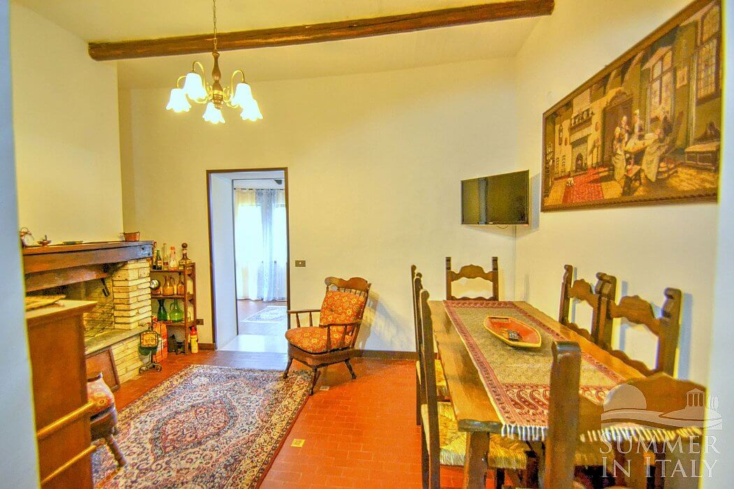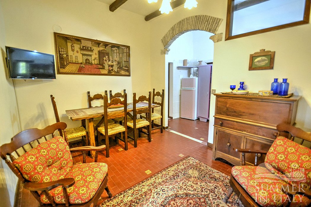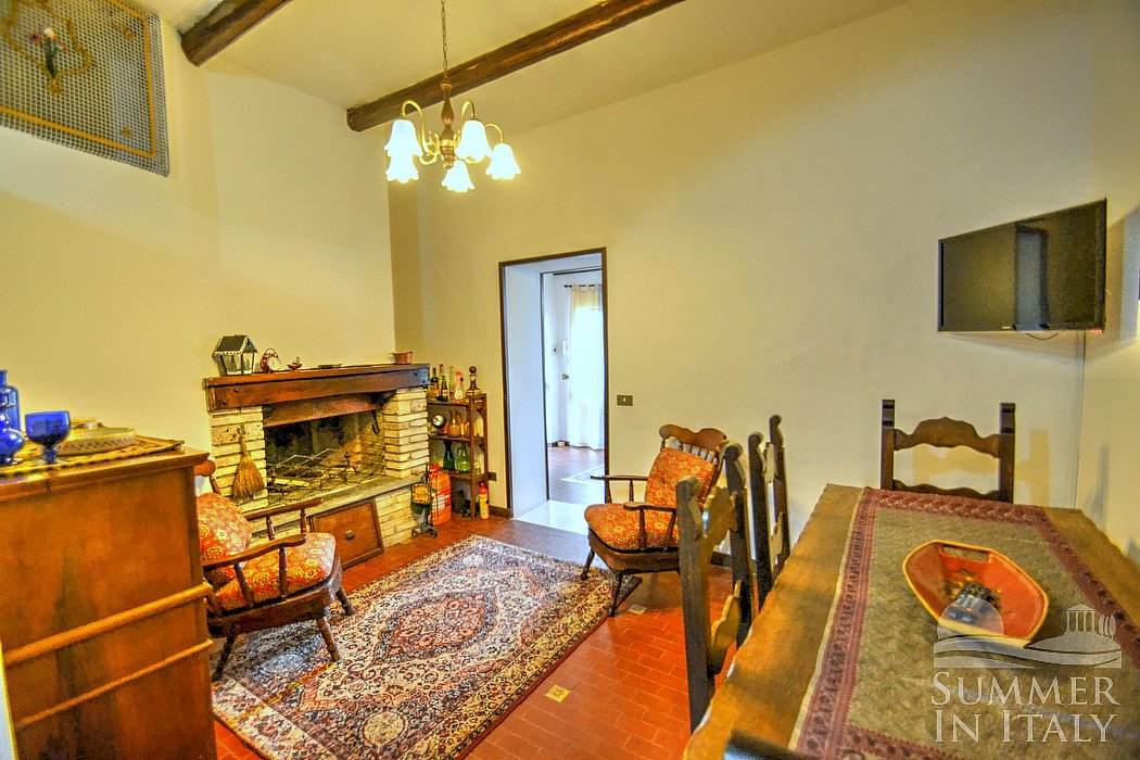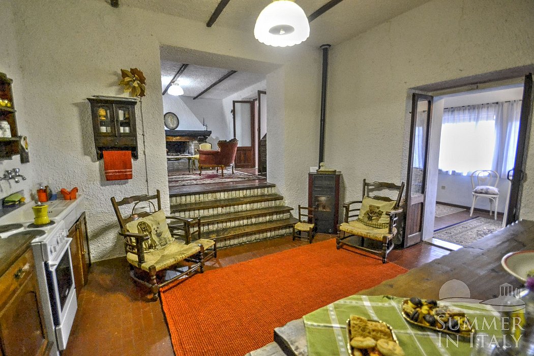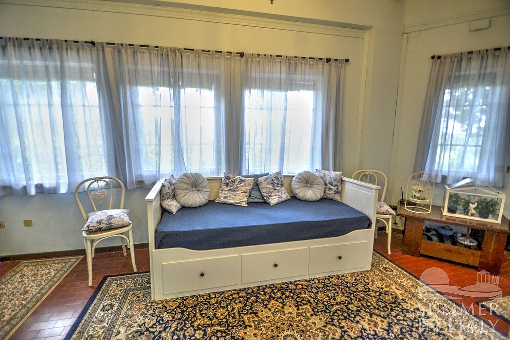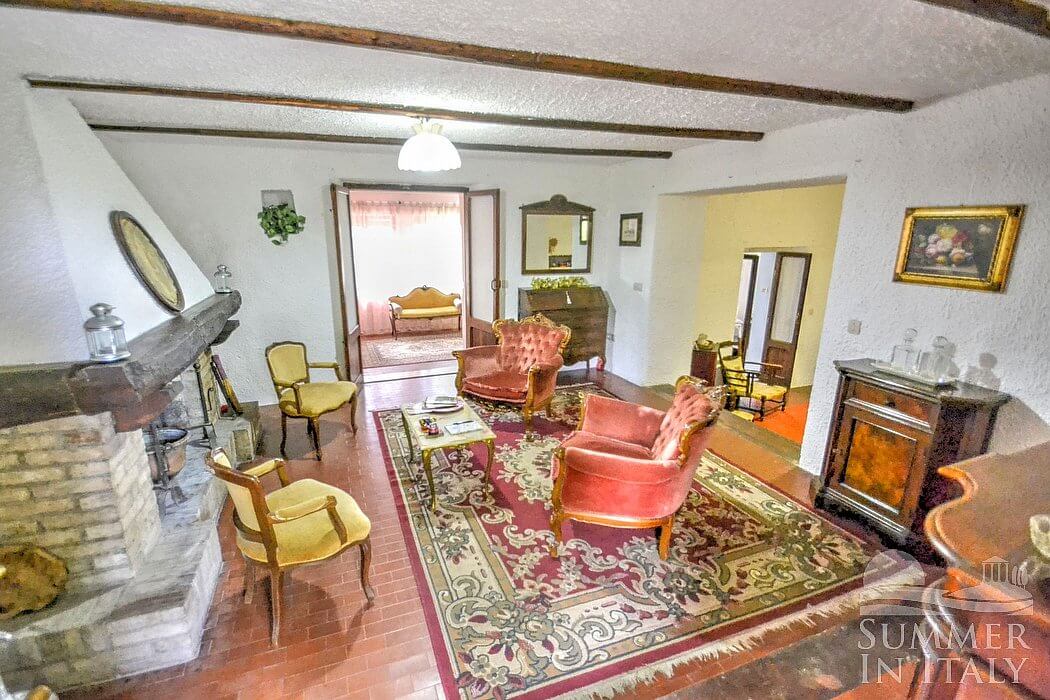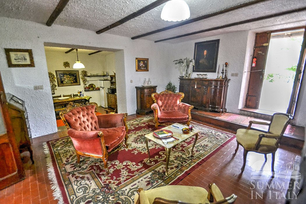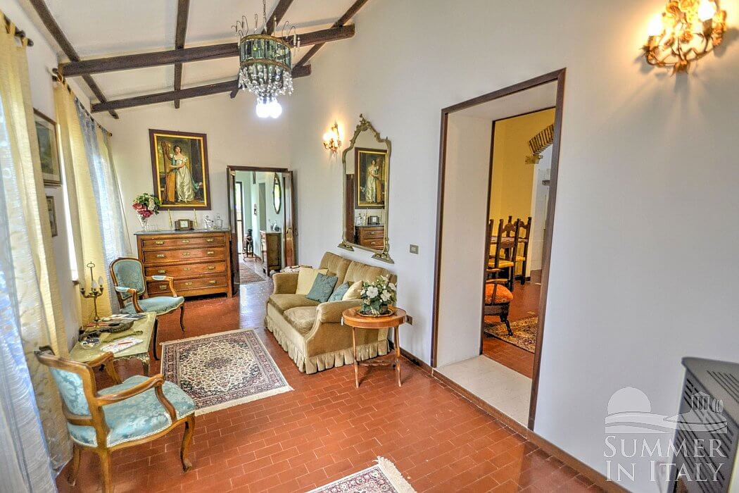 The ceiling of the first living room has characteristic exposed wood beams. The furnishings are classic and welcoming. The furnishings include a sofa. From the living room you will be able to enter the patio through a double-glazed French door. The room also has four windows with a view of the greenery.
