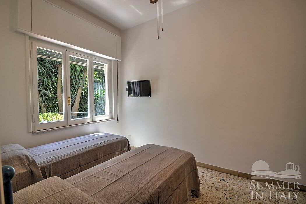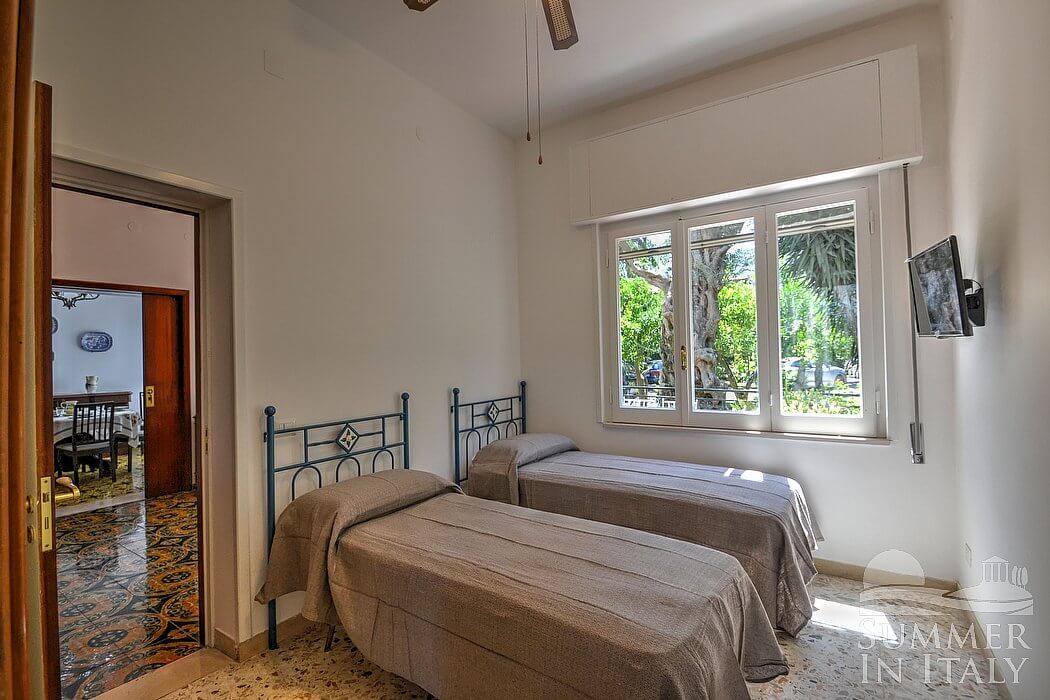 You will be able to enter the fifth bedroom through an access area. The bedroom has a matrimonial bed (160 cm/62 inches, wider than a queen-size bed) and a single bed (80 cm/32 inches). In this room you will find a television (local channels). From the bedroom you will be able to enter the small terrace through a French door. The room also has a window. The bedroom is equipped with an air conditioning/heating unit. Here you will also find a ceiling fan.