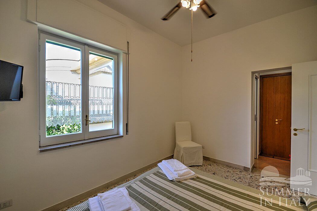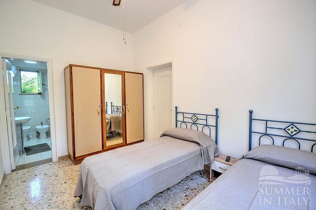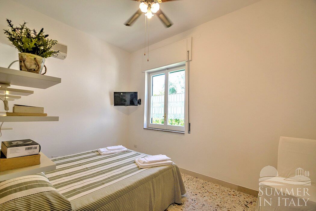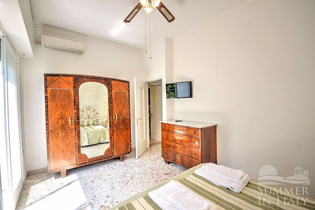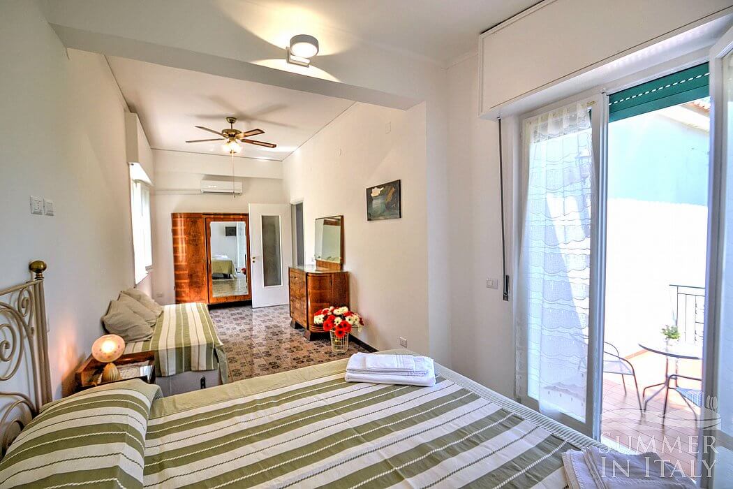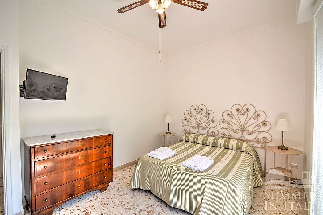 You will be able to enter the third bedroom through an access area. The bedroom has a matrimonial bed (160 cm/62 inches, wider than a queen-size bed). An additional twin bed (80 cm/32 inches) is available (if requested in advance) to make it a triple room. In this room you will find a television (local channels). From the bedroom you will be able to enter a small terrace through a French door. The bedroom is equipped with an air conditioning/heating unit. Here you will also find a ceiling fan.