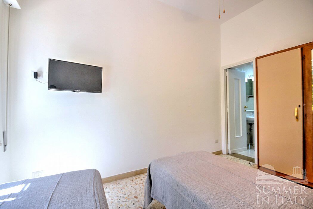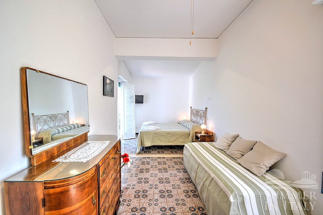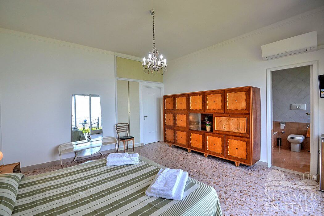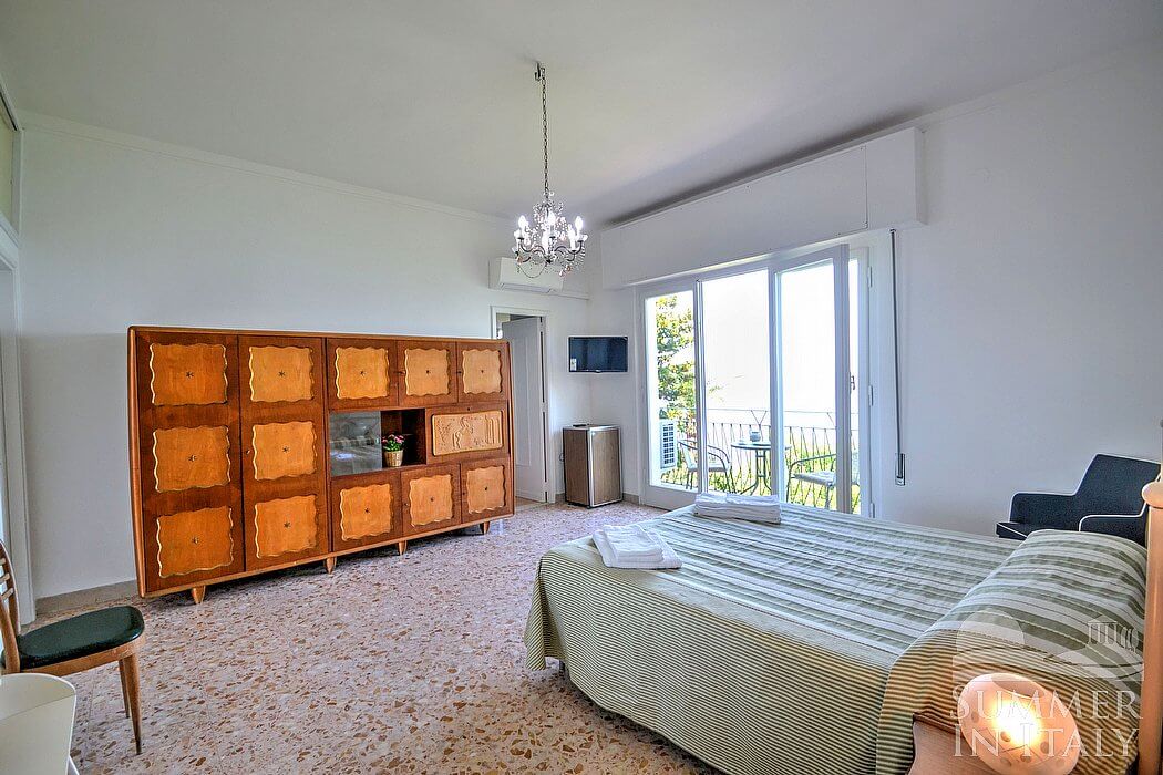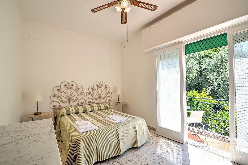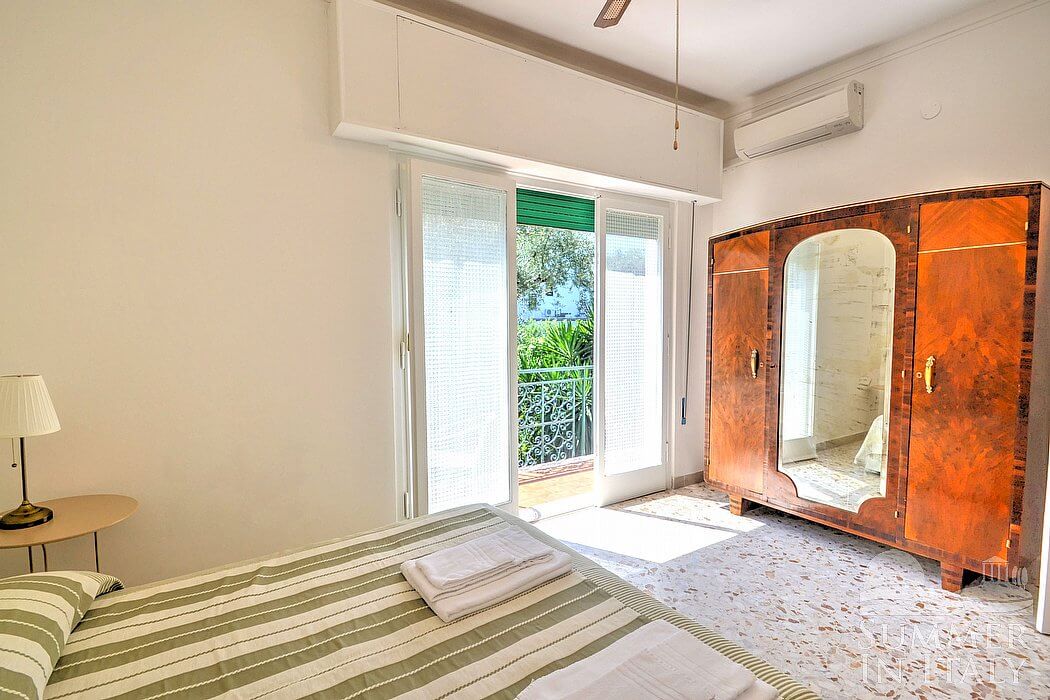 You will be able to enter the third bedroom through an access area. The bedroom has a matrimonial bed (160 cm/62 inches, wider than a queen-size bed). An additional twin bed (80 cm/32 inches) is available (if requested in advance) to make it a triple room. In this room you will find a television (local channels). From the bedroom you will be able to enter a small terrace through a French door. The bedroom is equipped with an air conditioning/heating unit. Here you will also find a ceiling fan.