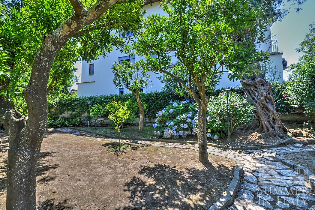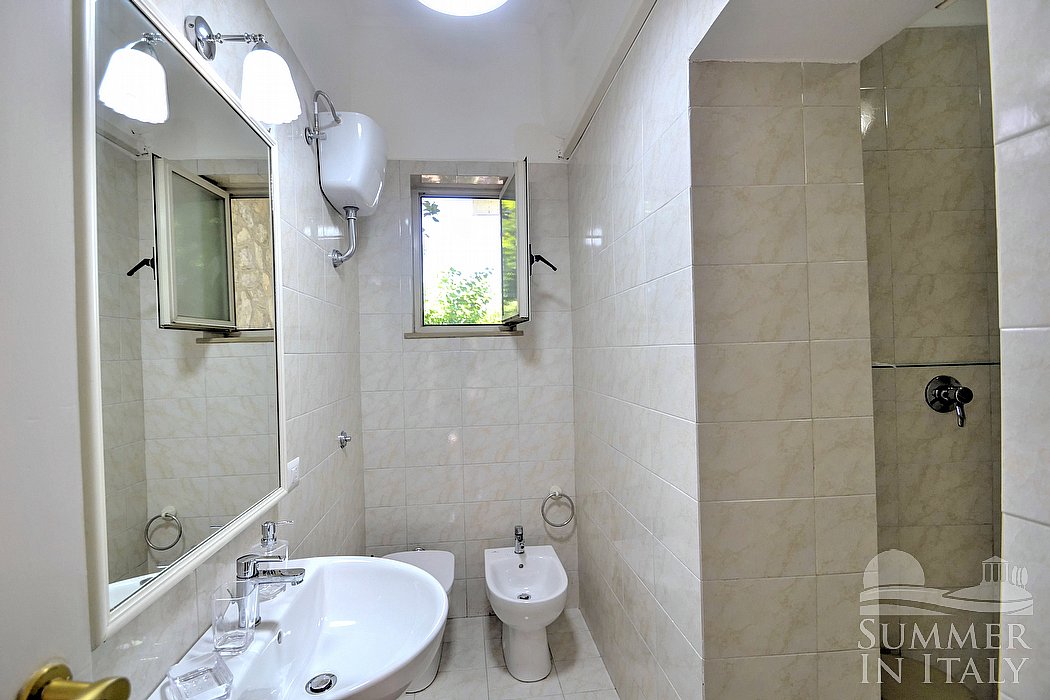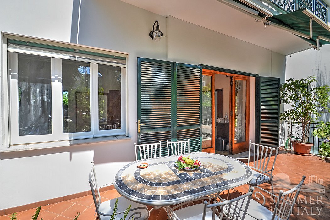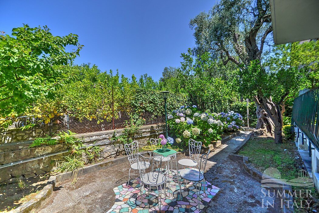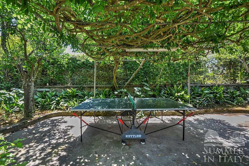 The garden is 1000 square meters (10800 square feet) large. It is partly shaded by century-old olive trees and by a characteristic pergola. It is equipped with a table and chairs. Here you will be able to have fun with a ping pong table. Here you will also find a brickwork barbecue. From the garden you will have a broad view of the greenery.